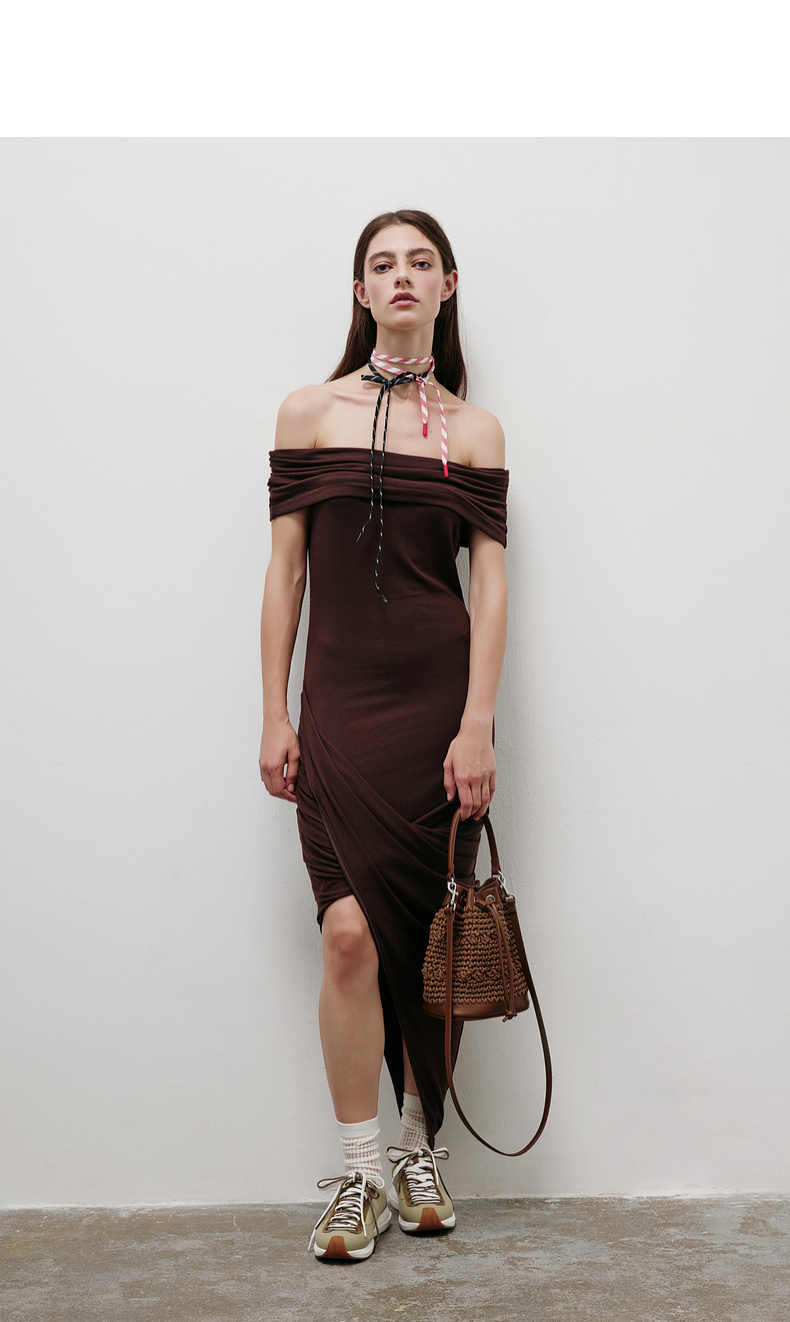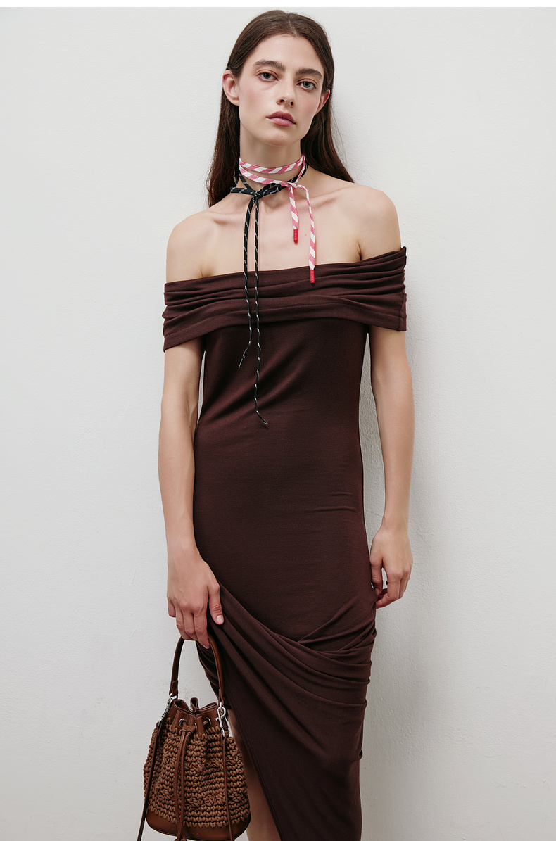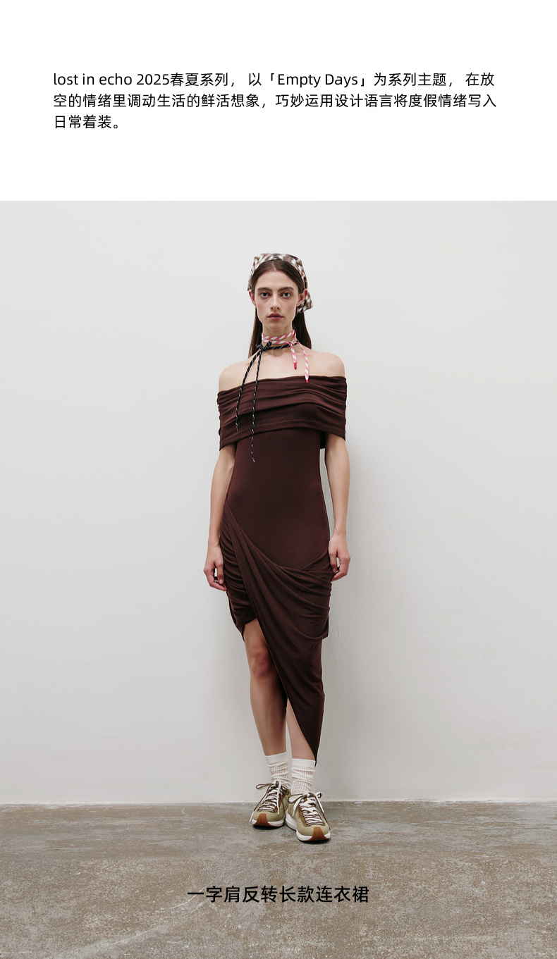 lost in echo2025春夏新款时尚简约一字肩显瘦露肩长款连衣裙女