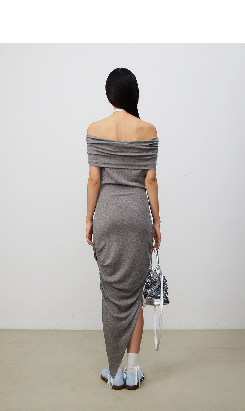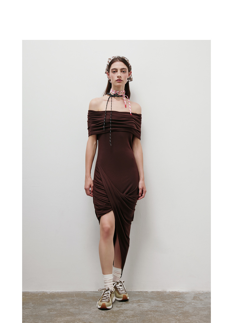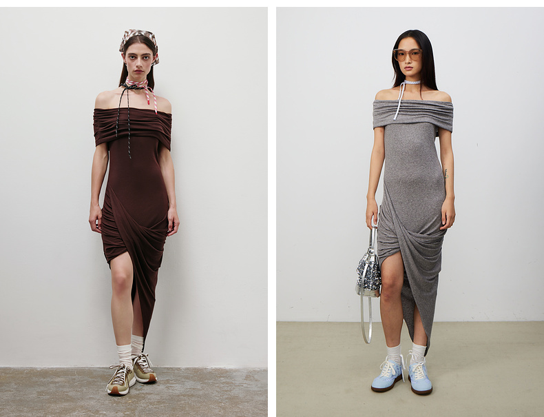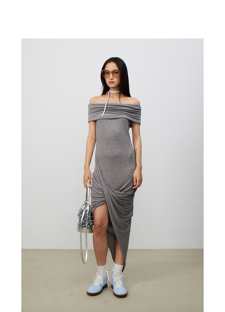 lost in echo2025春夏新款时尚简约一字肩显瘦露肩长款连衣裙女