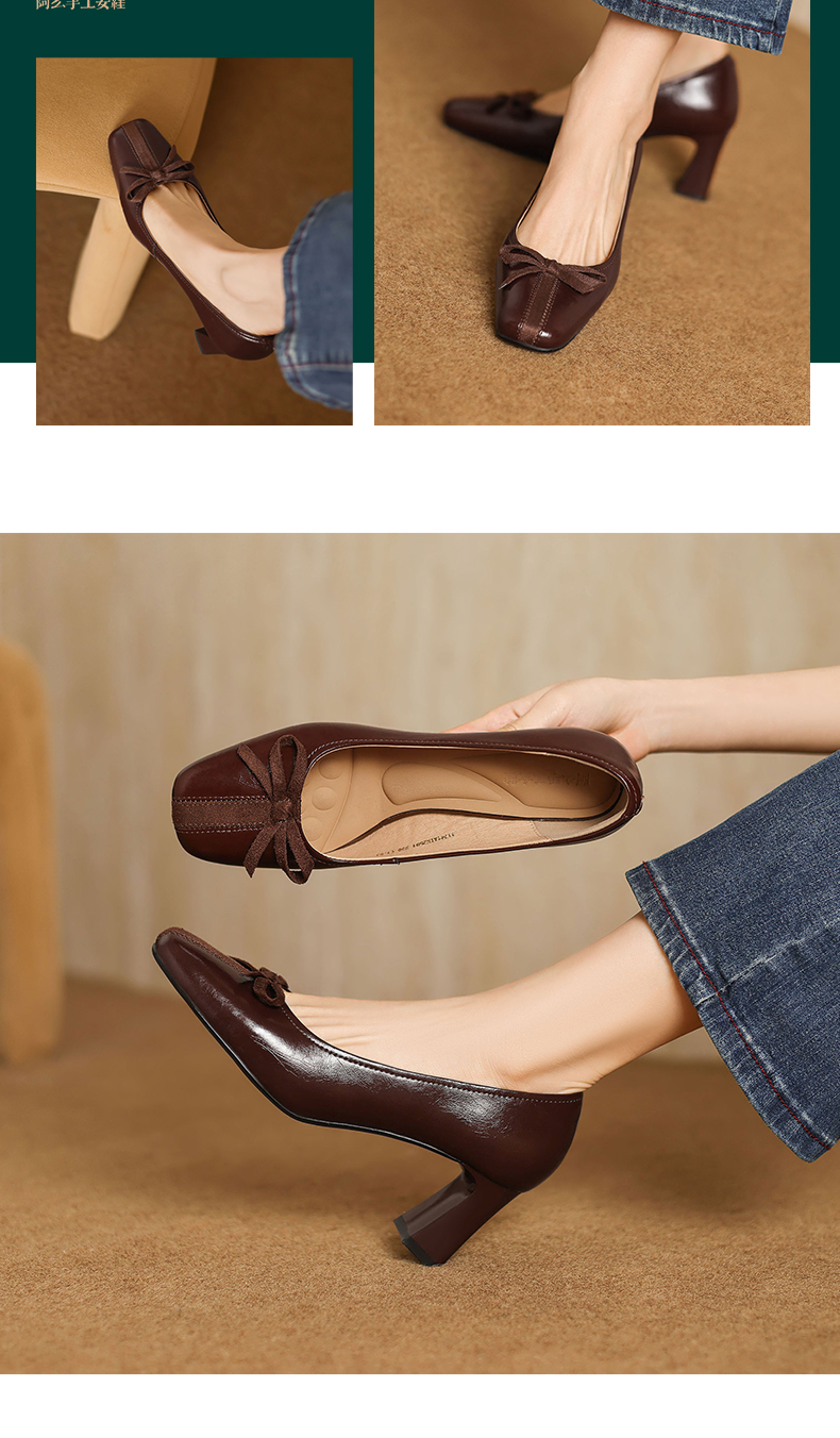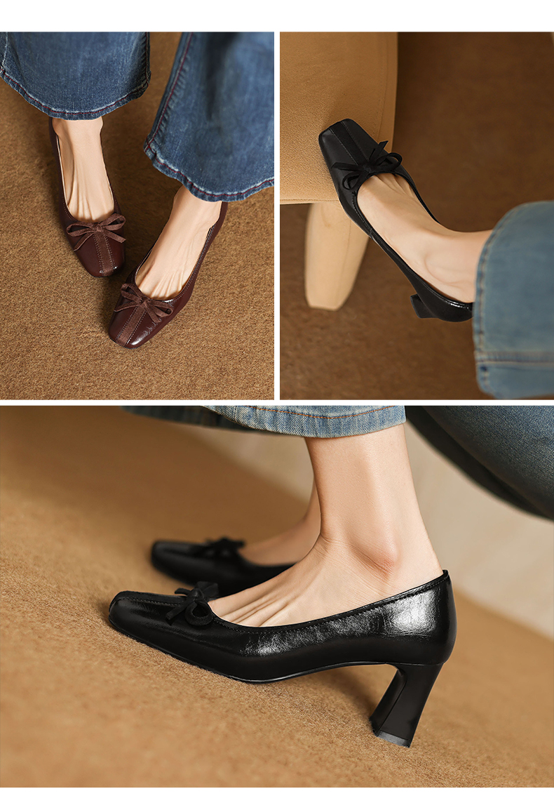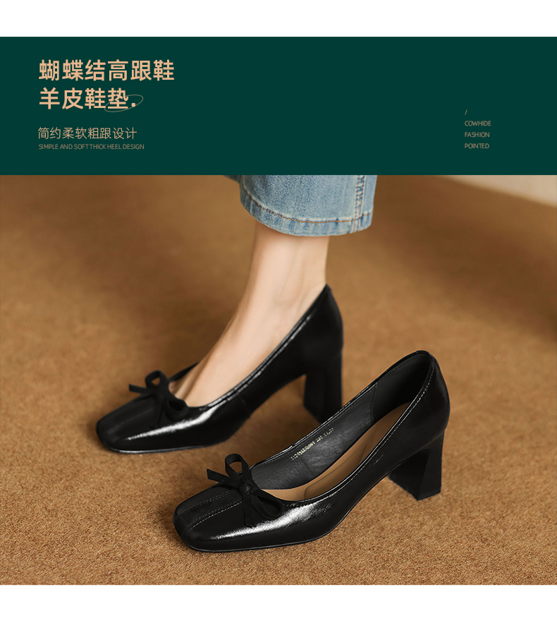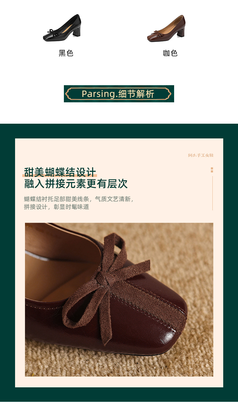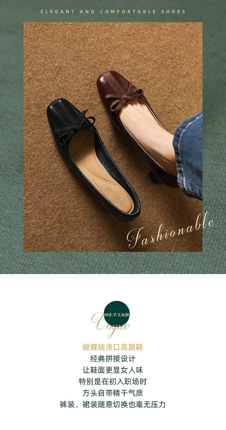 阿么手工女鞋蝴蝶结浅口一脚蹬方头单鞋新款复古优雅高跟鞋6.3CM