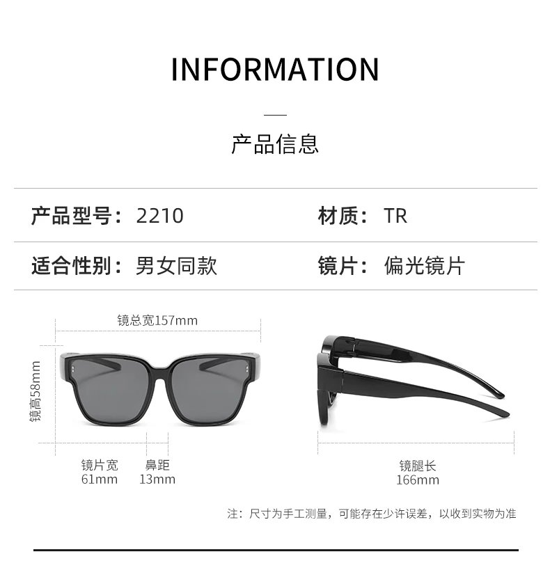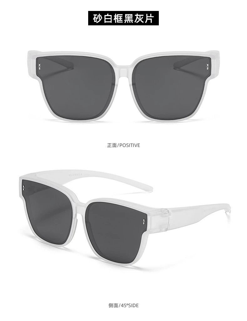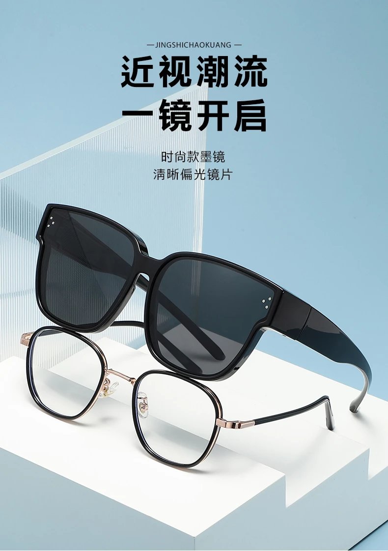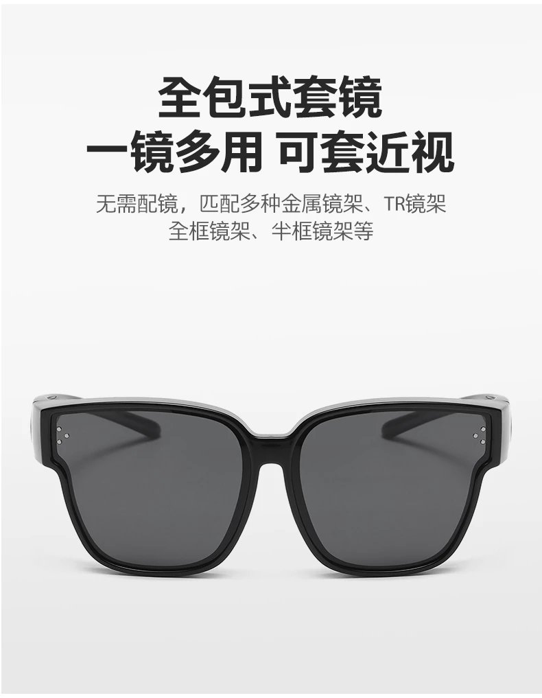 2、偏光套镜适合各类人群,近视眼镜佩戴者可叠在近视镜架上,无需要配镜,匹配多种近视镜架,近视镜镜随意切换,一镜开启,时尚又便捷,无近视人群可直接佩戴,