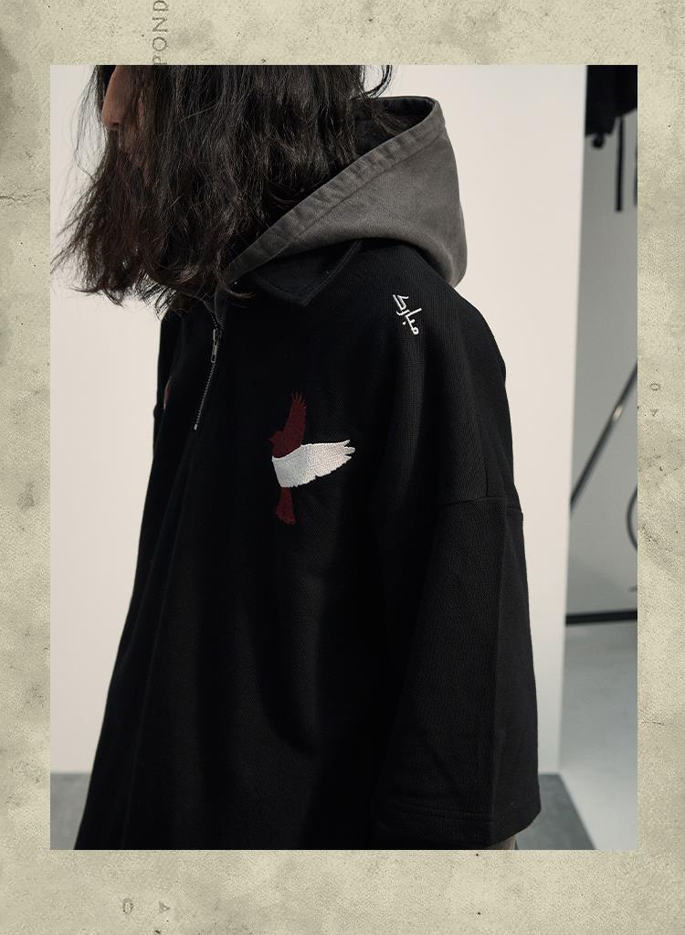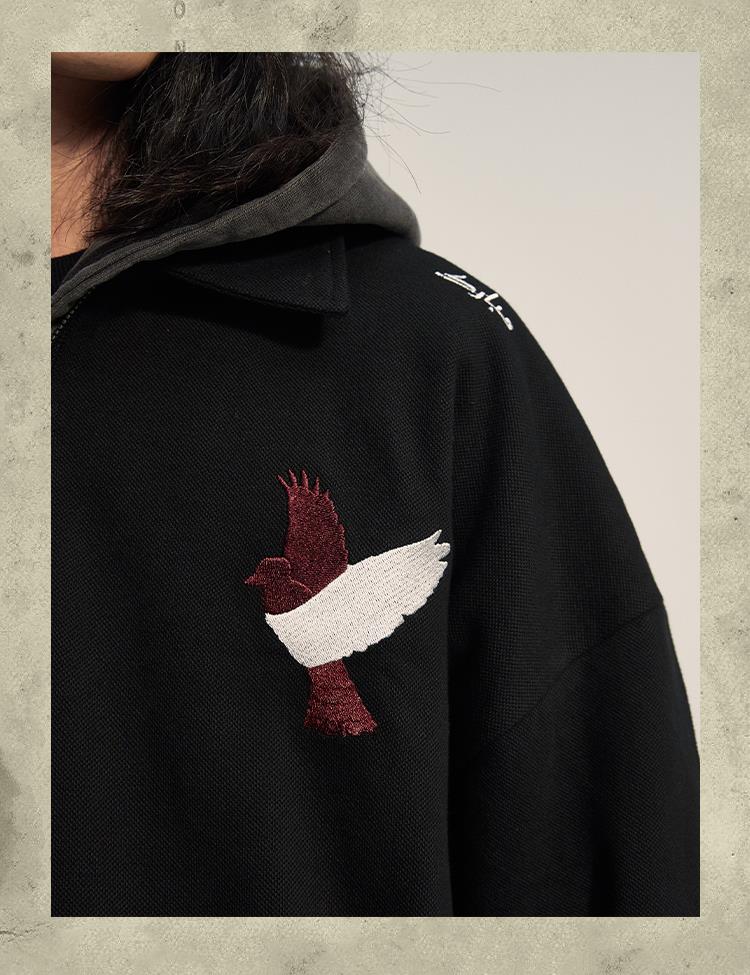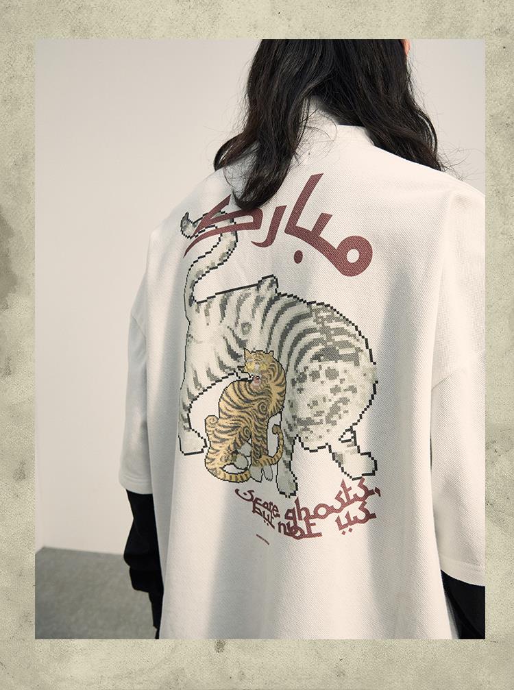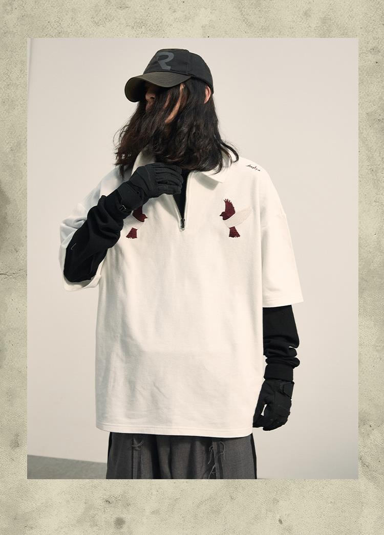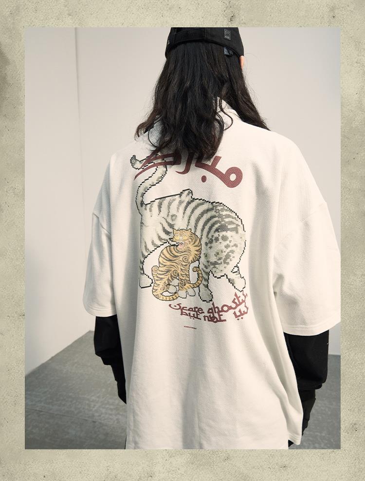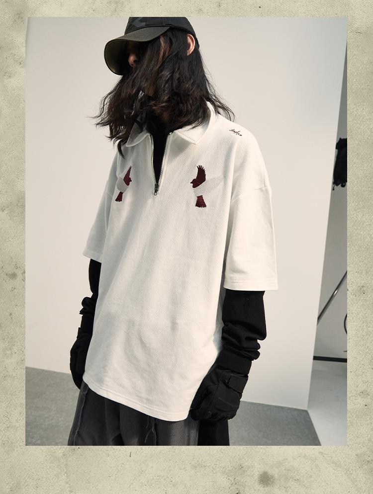 POH「李朝猫虎画」 福至刺绣拉链宽松休闲插肩袖五分短袖polo衫男