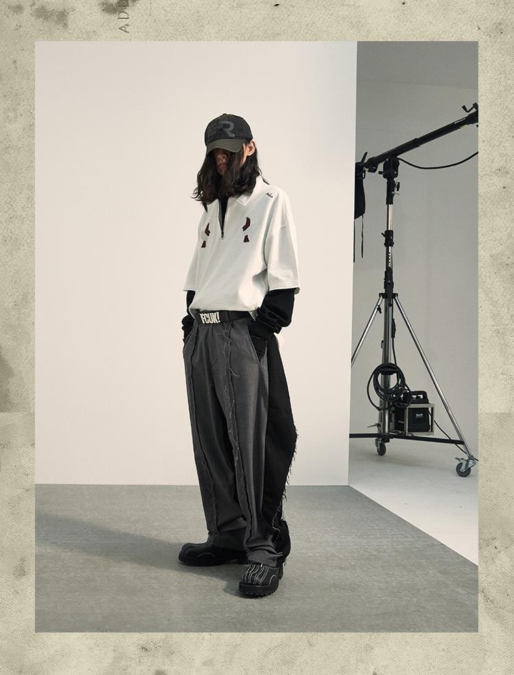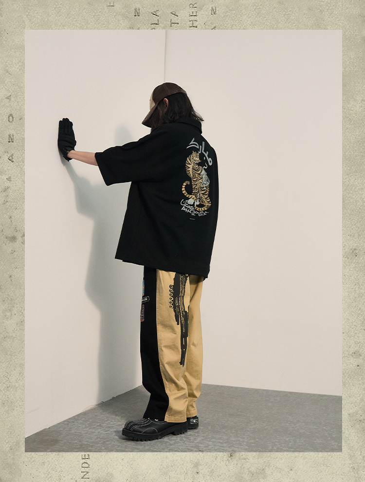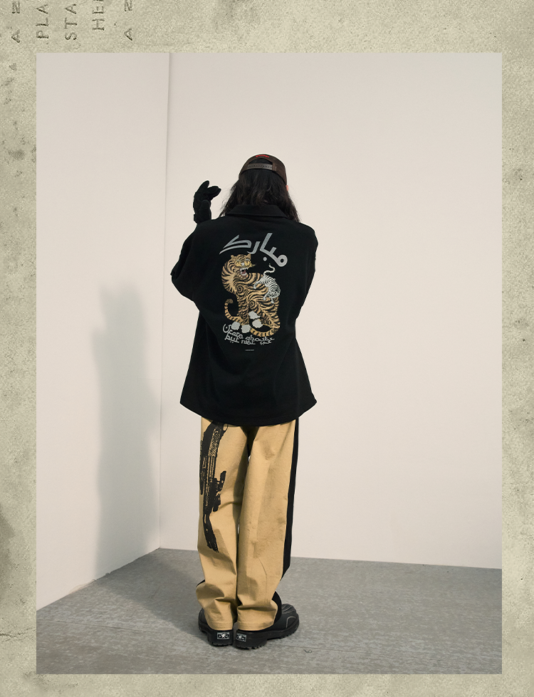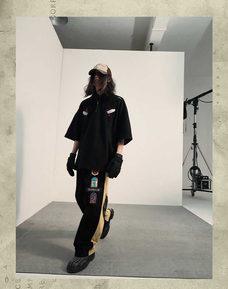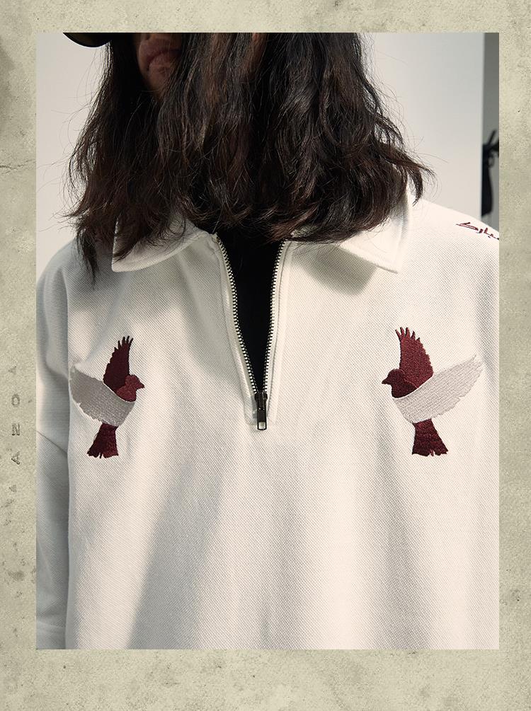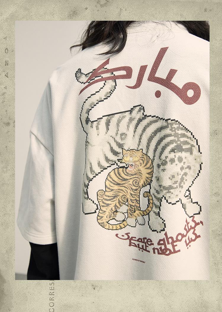 POH「李朝猫虎画」 福至刺绣拉链宽松休闲插肩袖五分短袖polo衫男