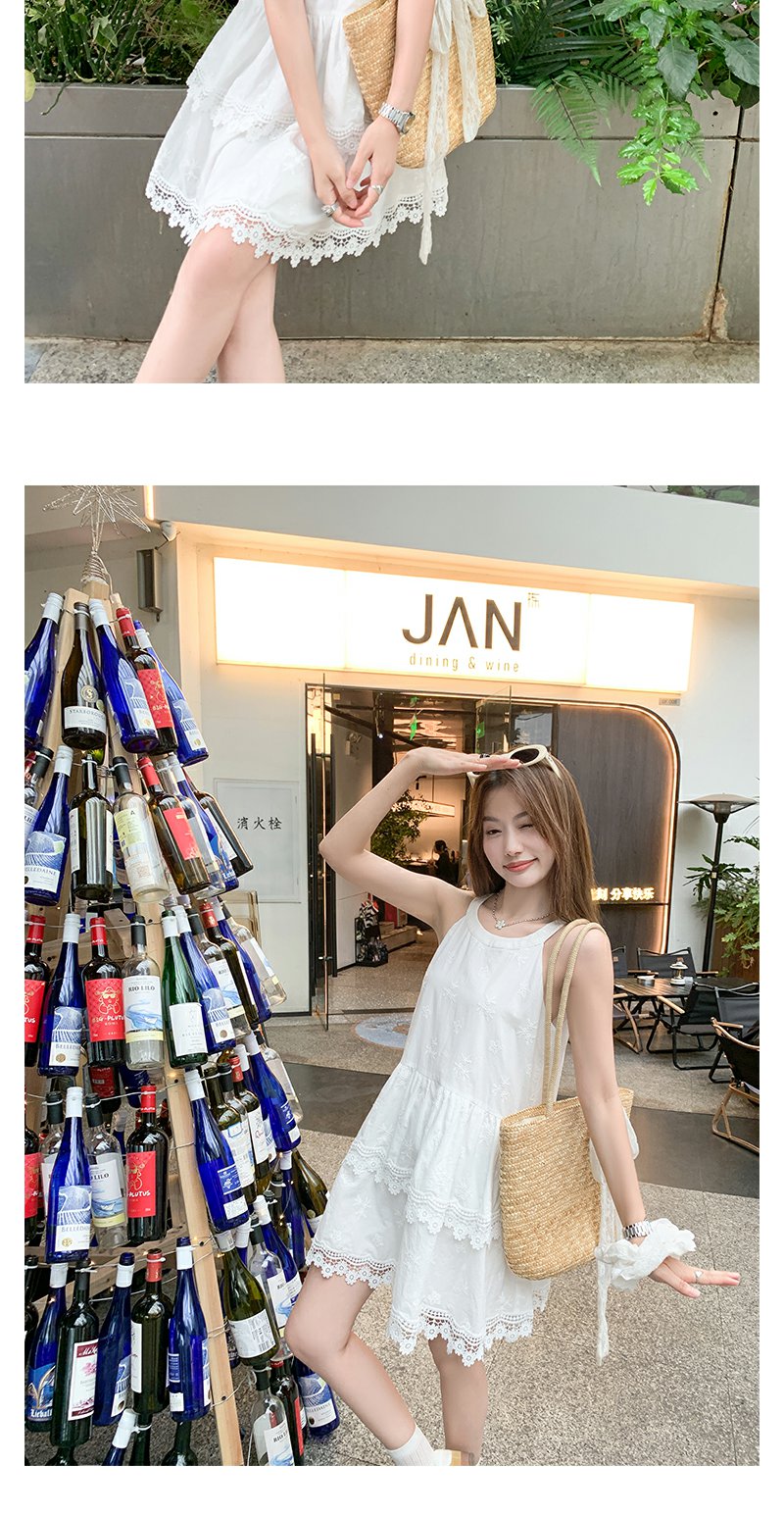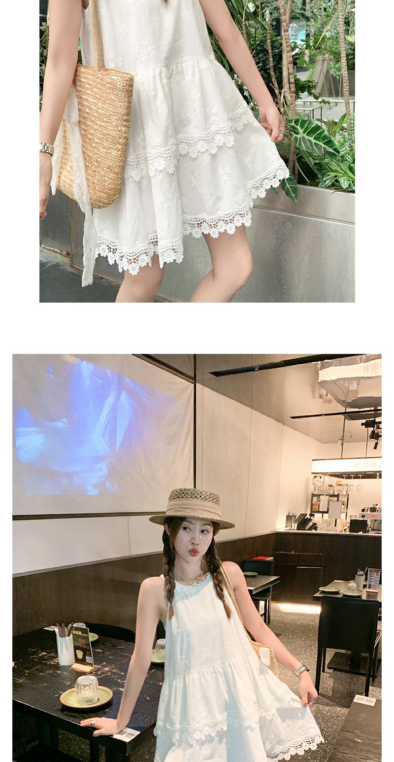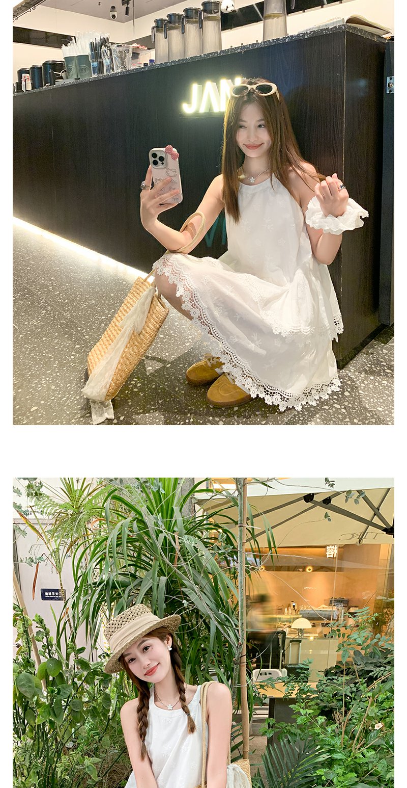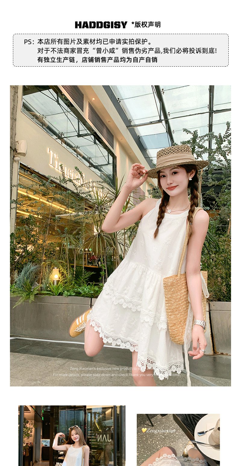 <曾小咸推荐>甜美白色挂脖下摆蕾丝边连衣裙
