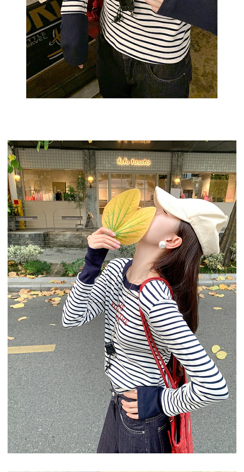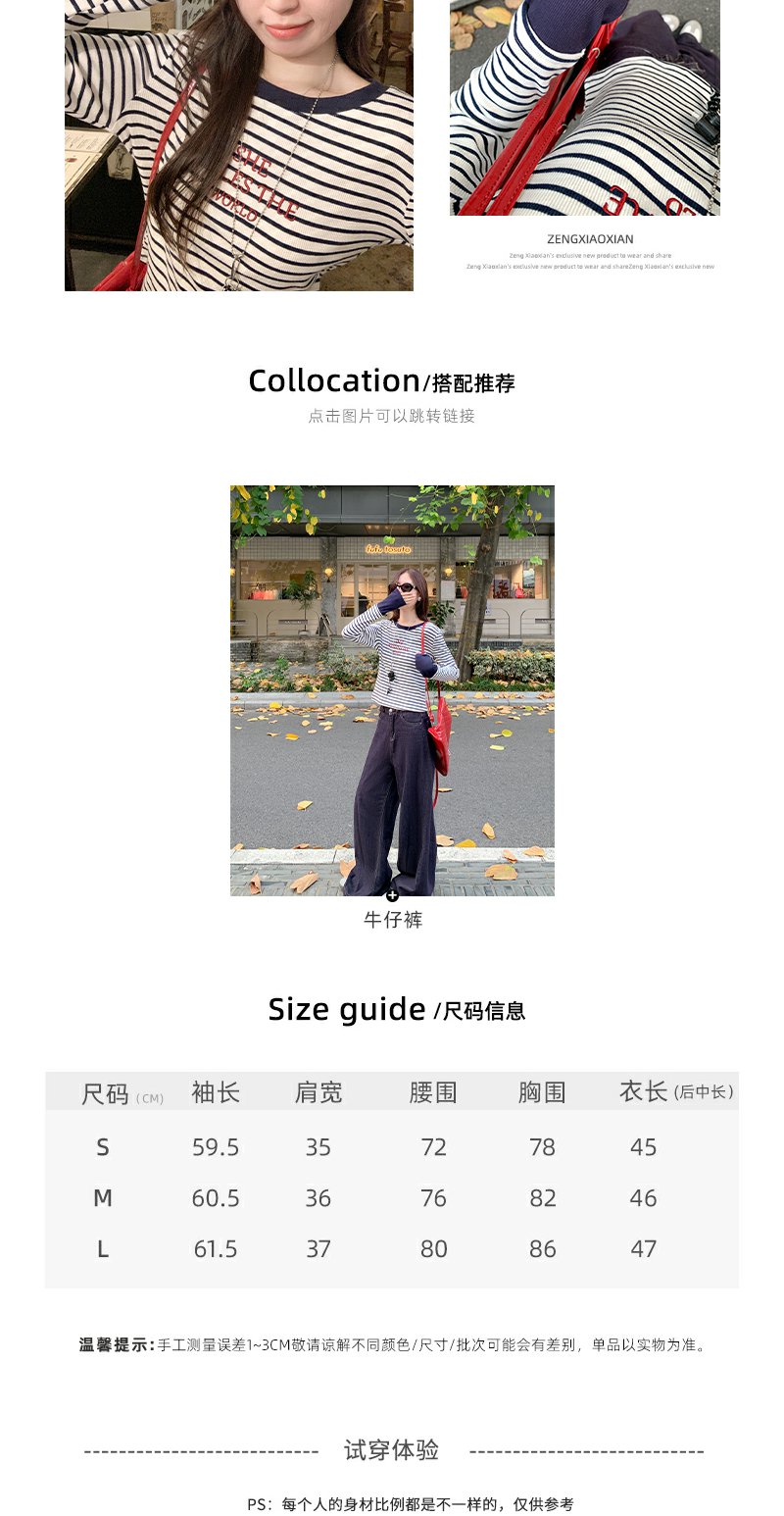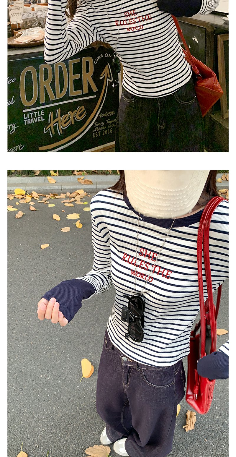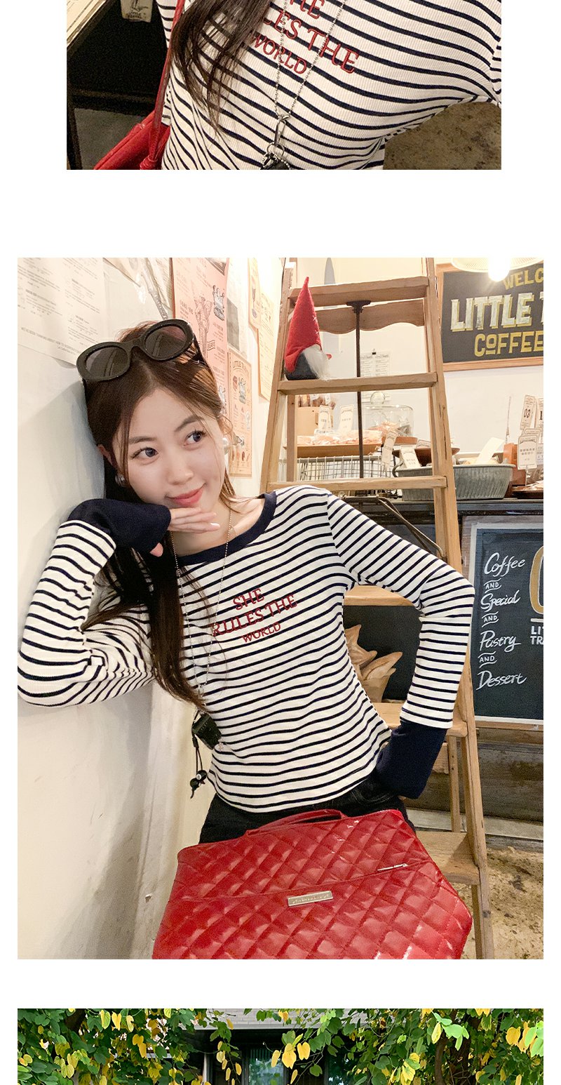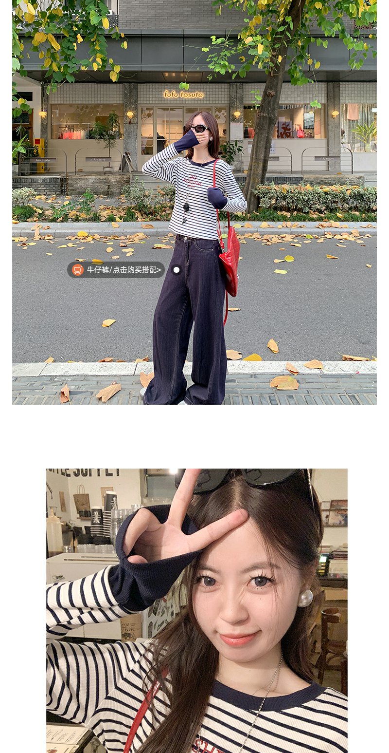 <曾小咸推荐>修身条纹字母刺绣圆领长袖T恤