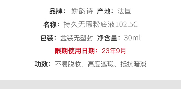 【商品名称】娇韵诗持久无瑕粉底液30ml 色号102.5C
