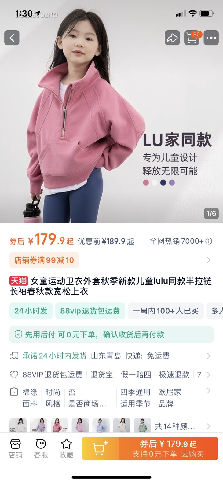 💰69元包邮, LU家同款半拉链运动卫衣 轻柔运动感