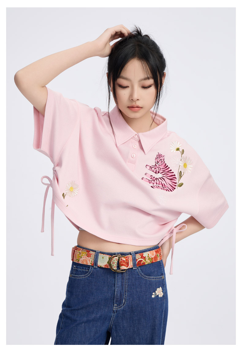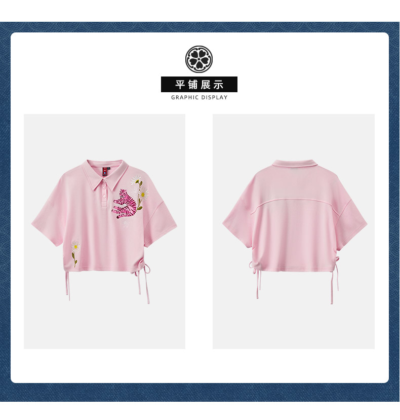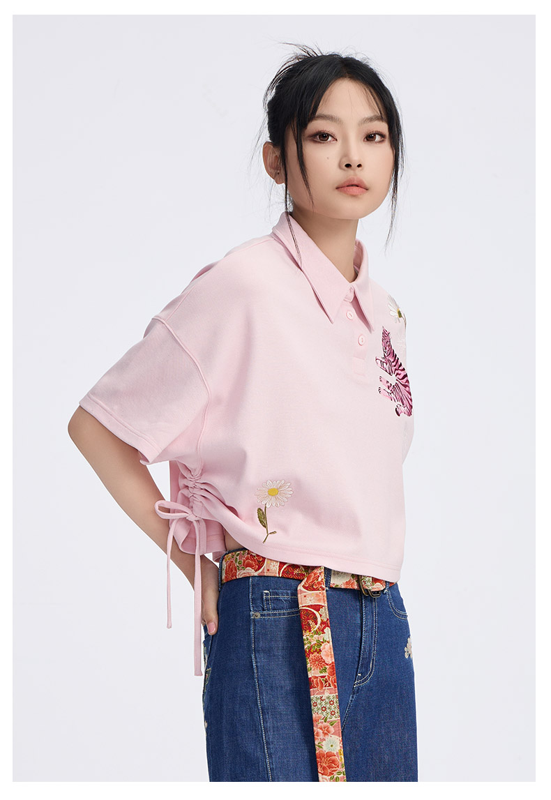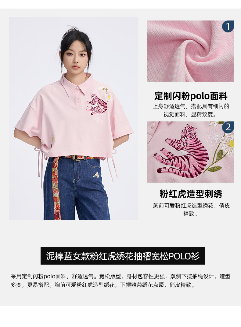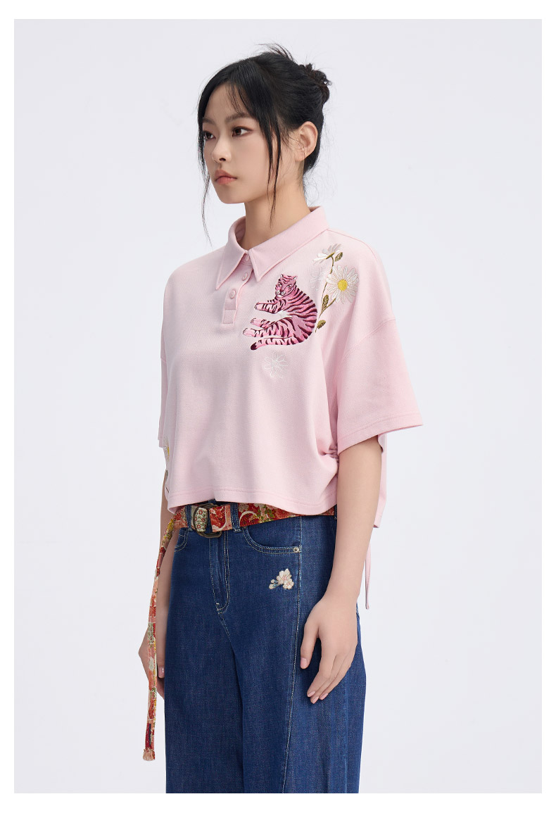 ONIARAI/鬼洗25春夏泥棒蓝女款粉红虎绣花抽褶宽松POLO衫 N840271