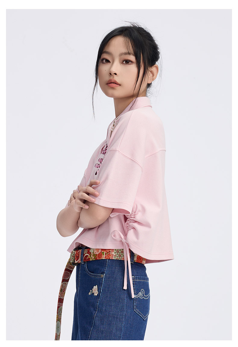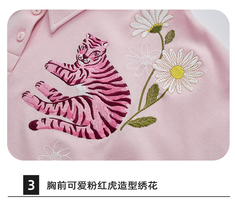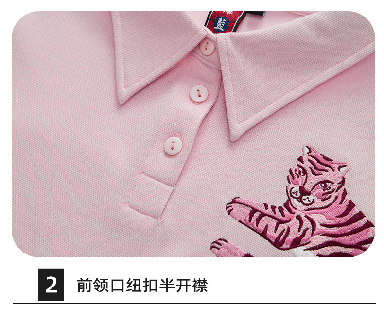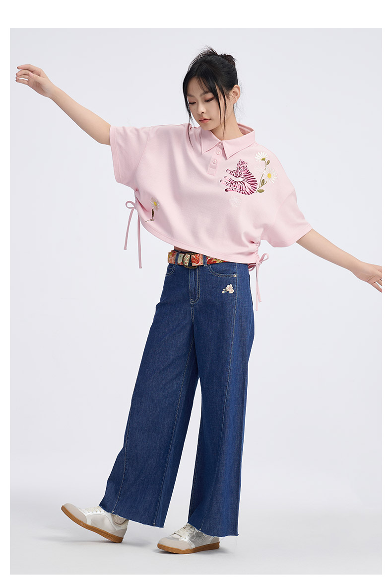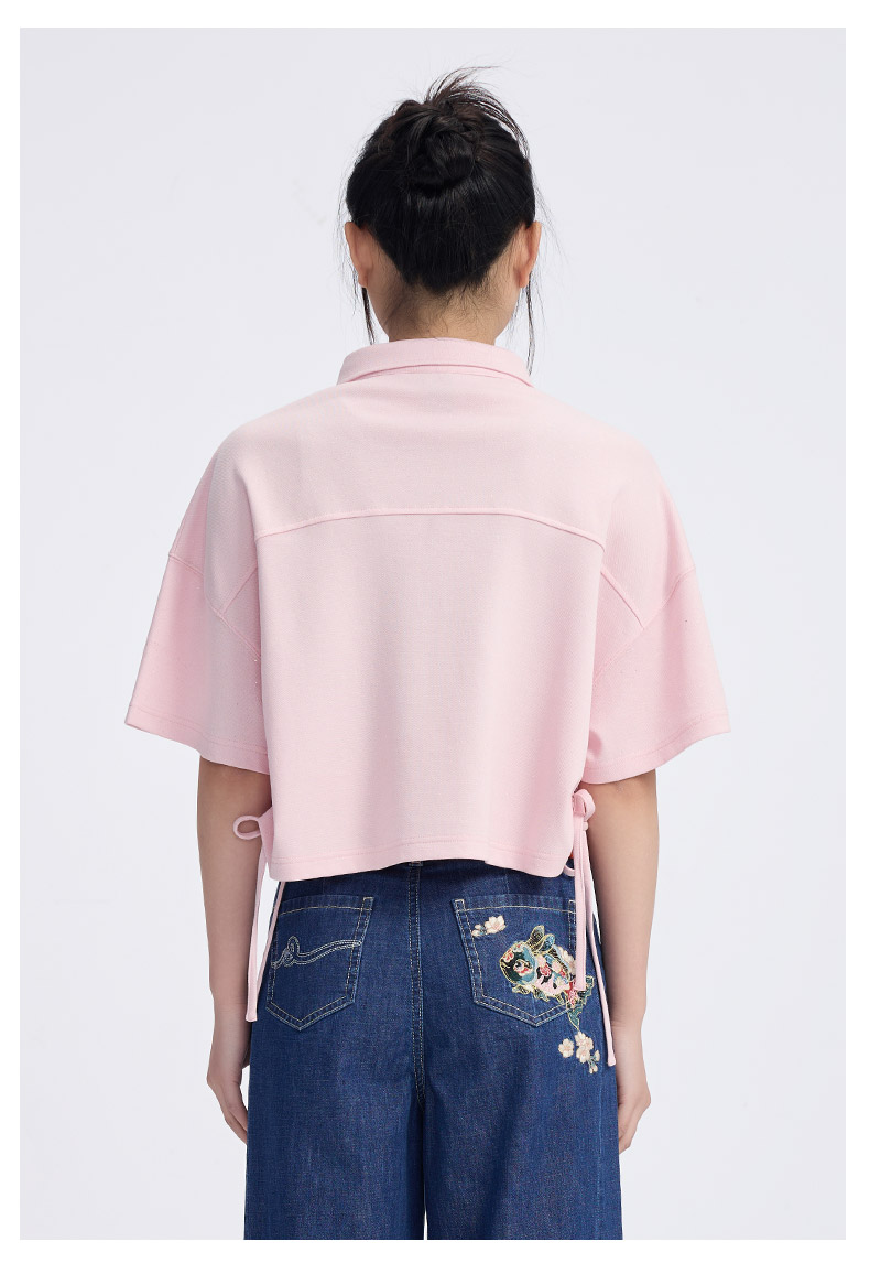 ONIARAI/鬼洗25春夏泥棒蓝女款粉红虎绣花抽褶宽松POLO衫 N840271
