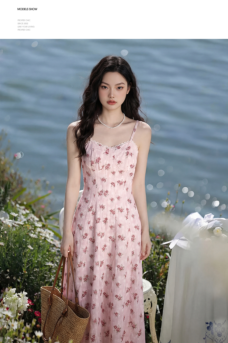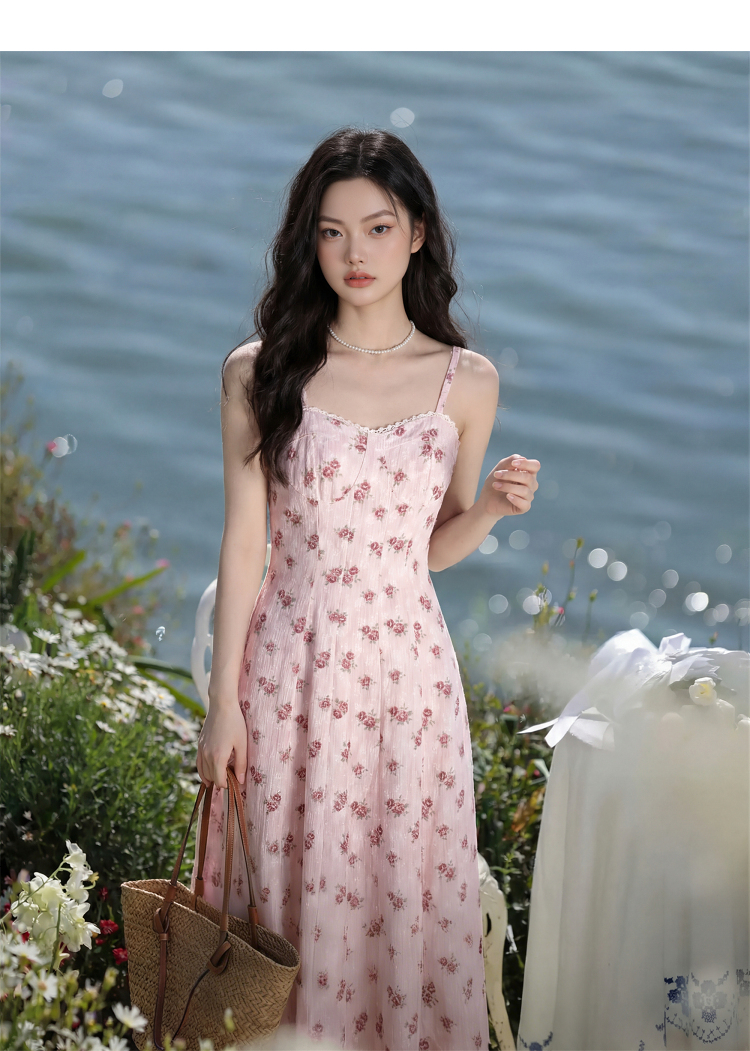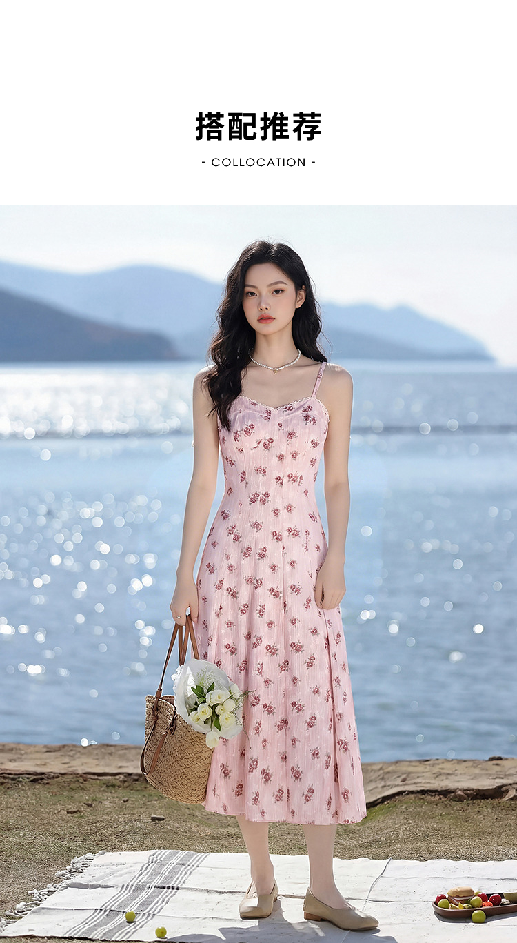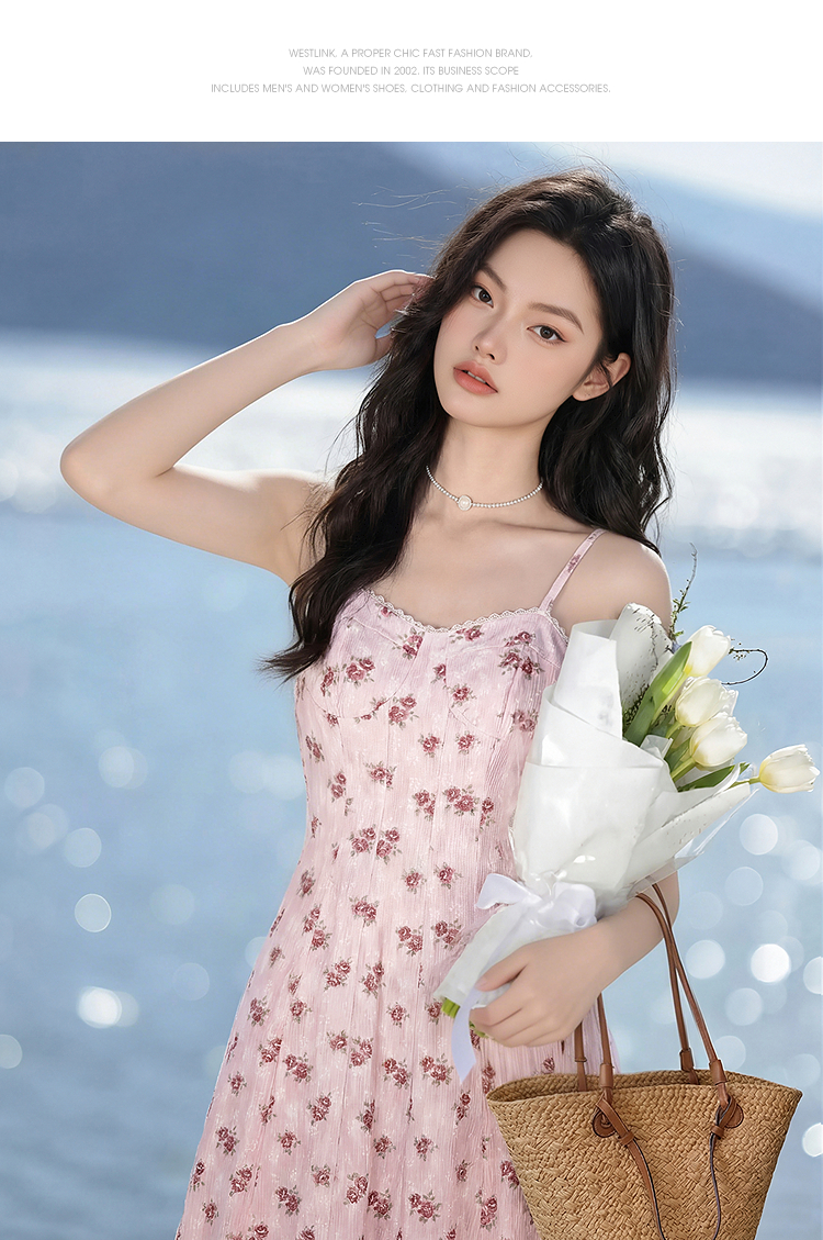 西遇粉色碎花吊带连衣裙女2026春季新款温柔风浪漫印花中长大摆裙E0060178