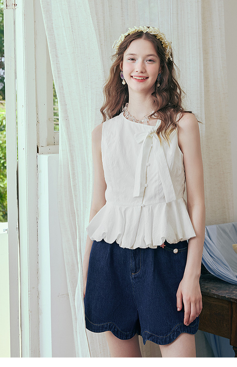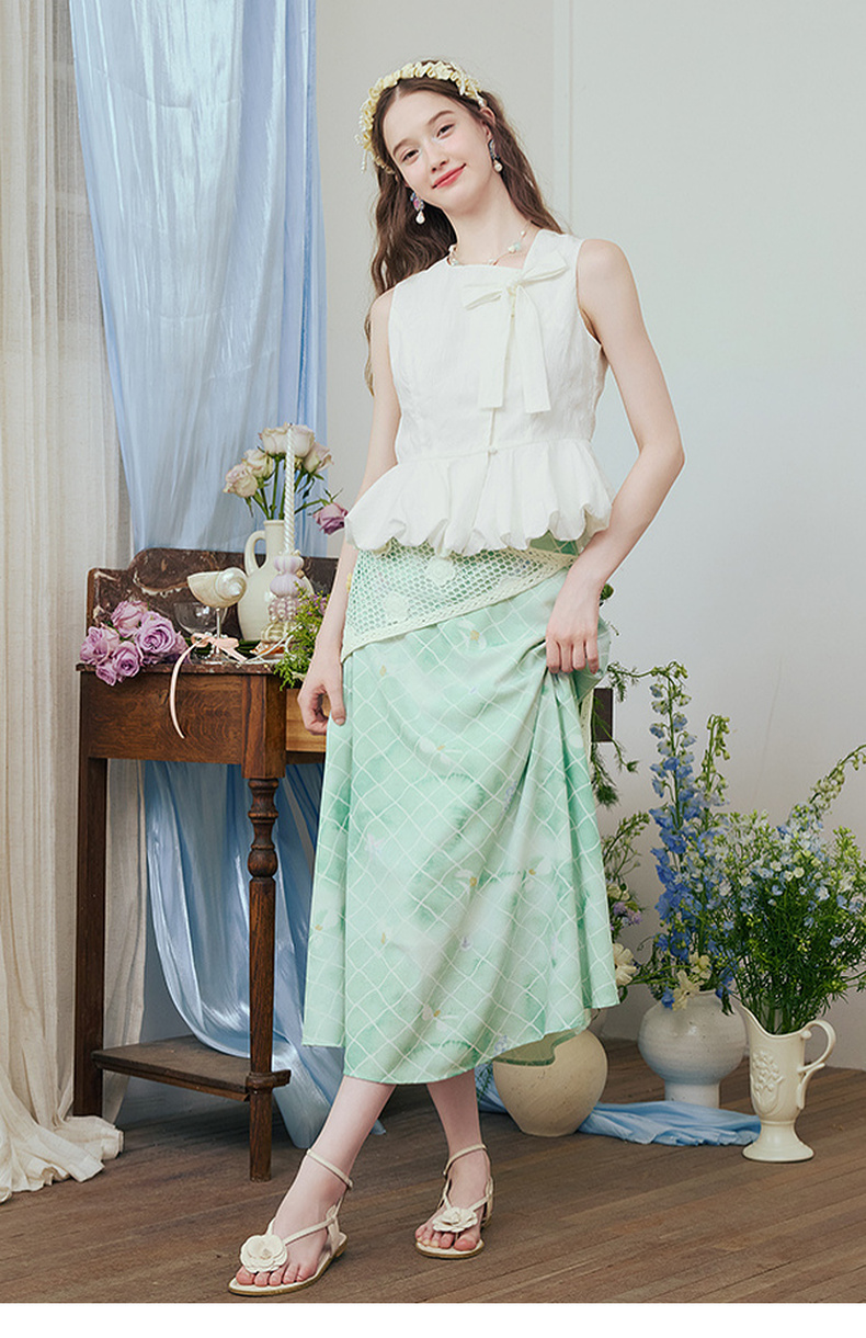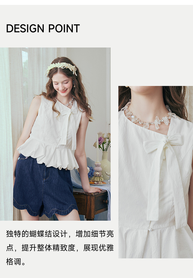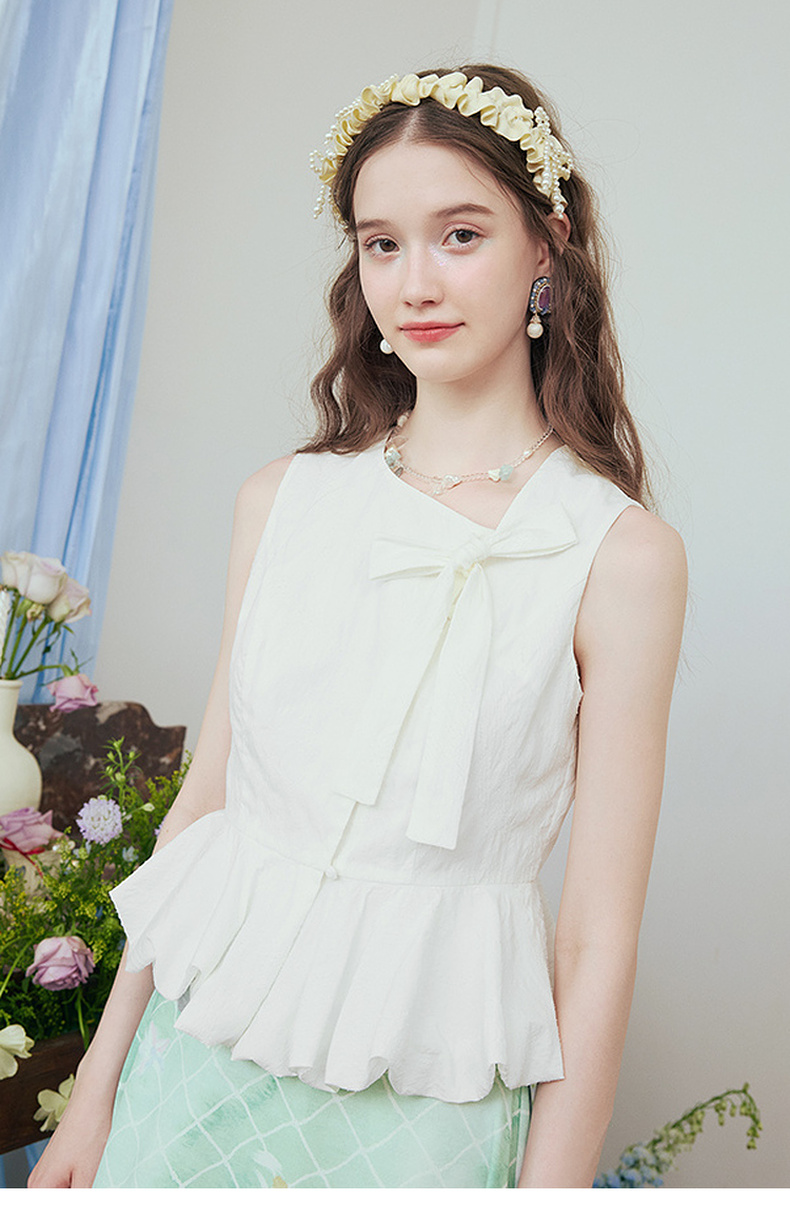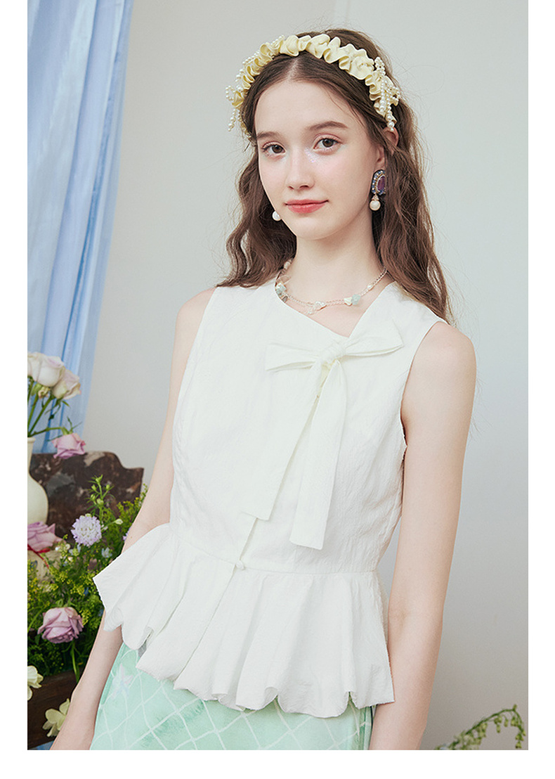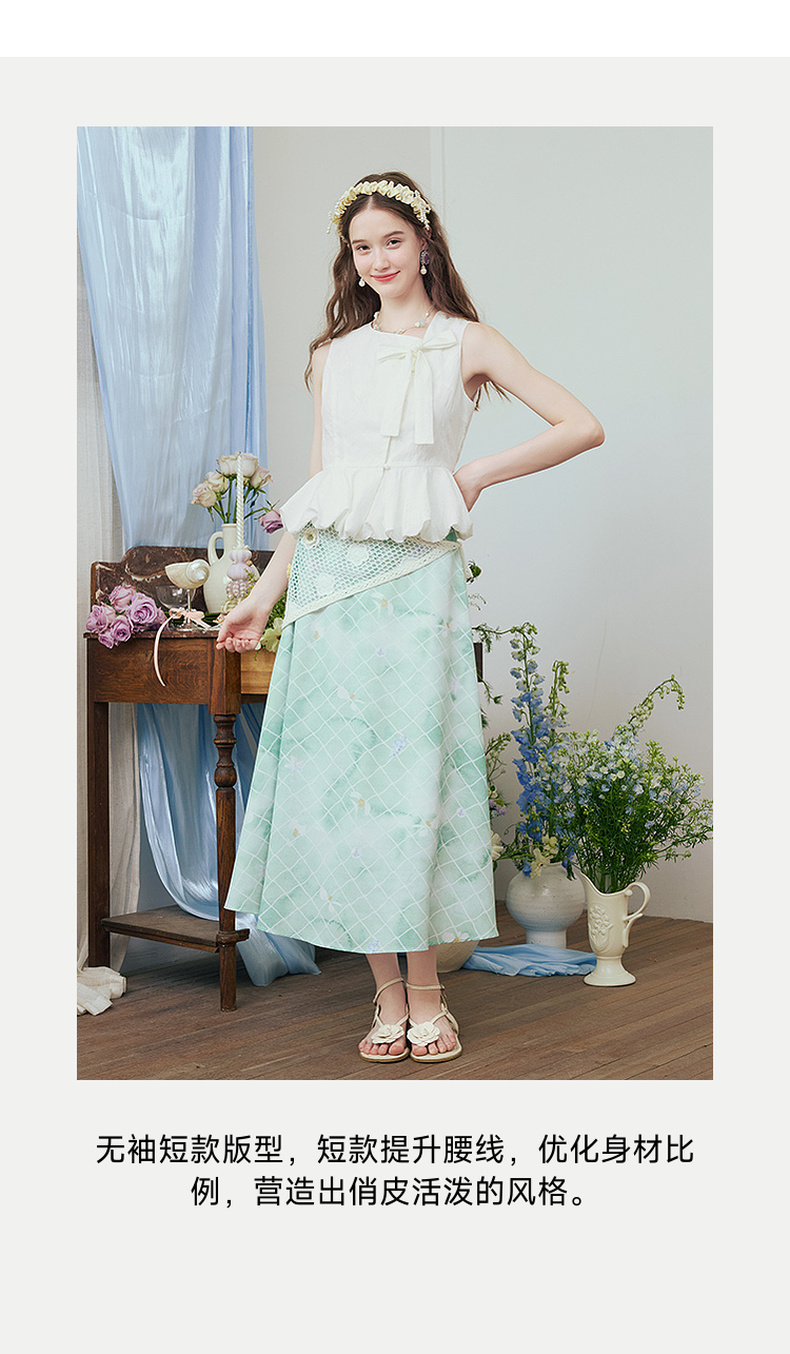 两三事香草雪顶2025夏季新款复古立体蝴蝶结收腰荷叶边下摆背心女