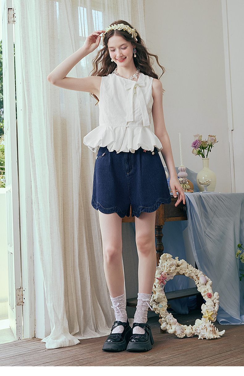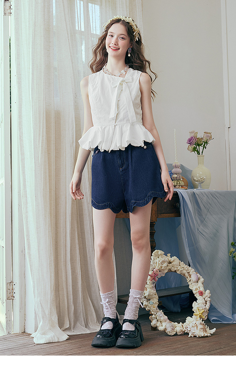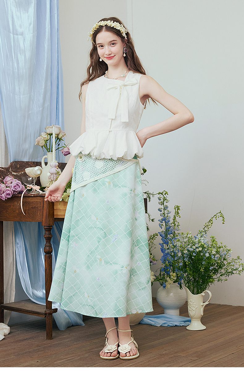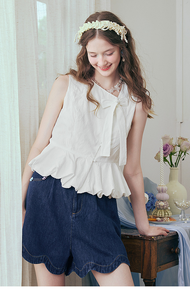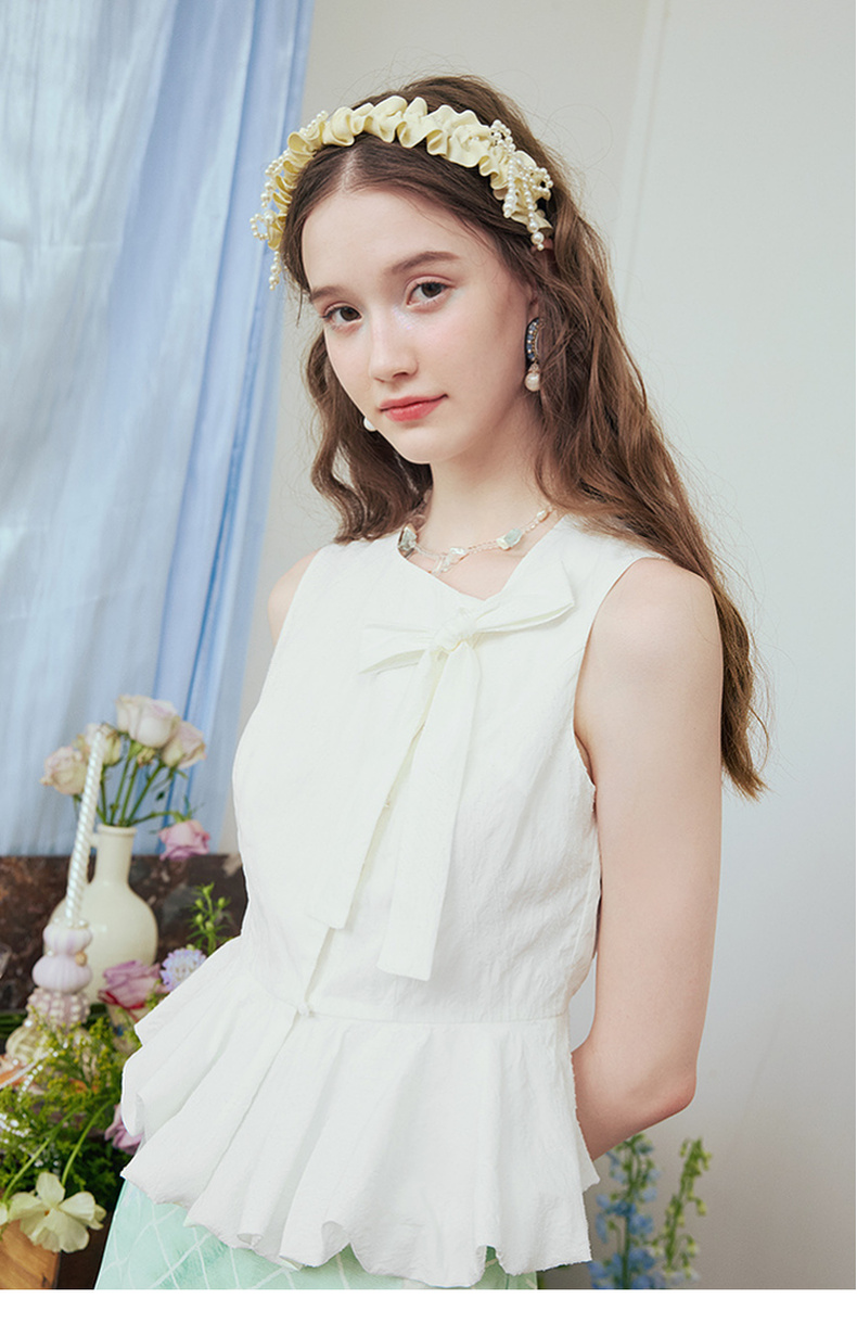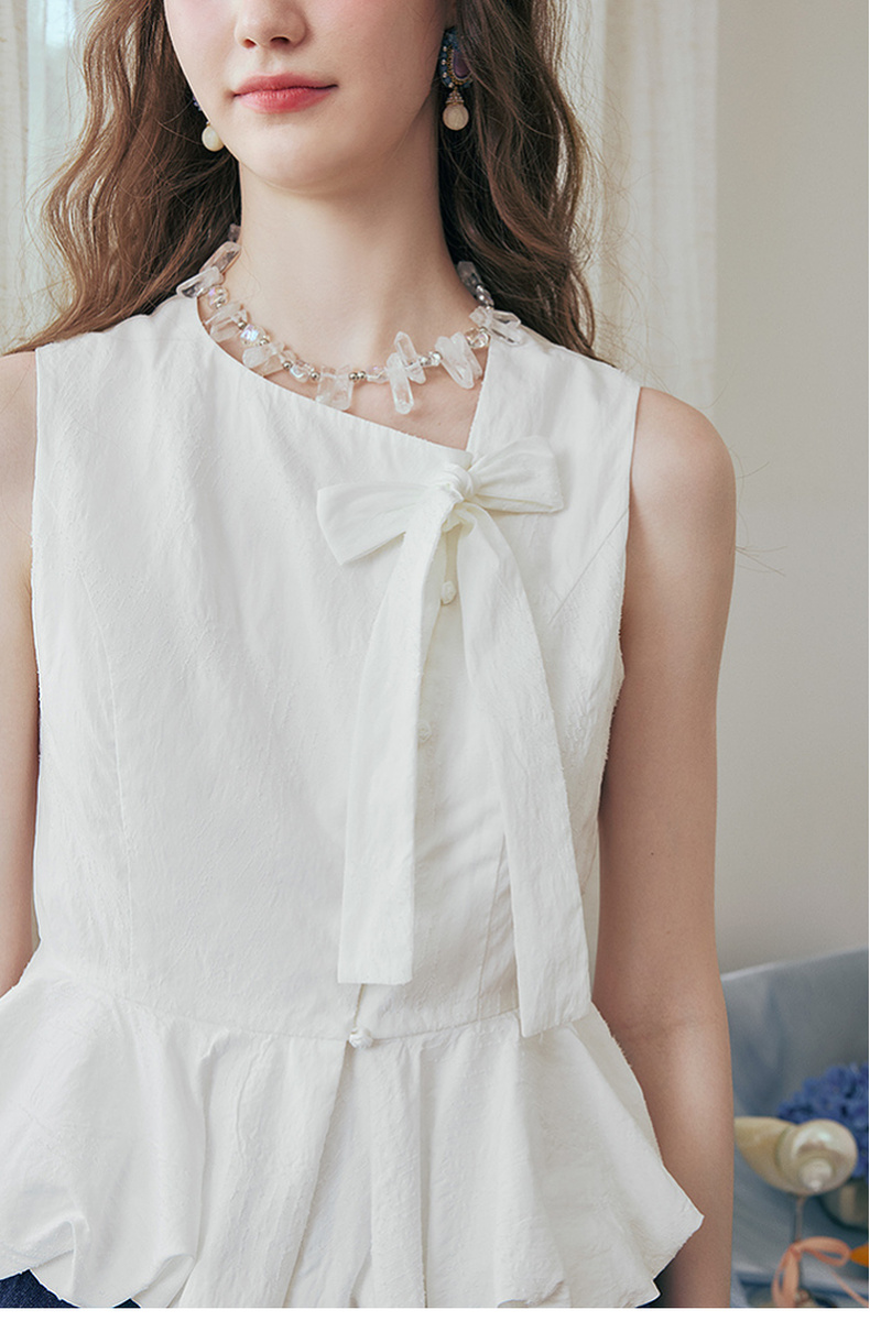 两三事香草雪顶2025夏季新款复古立体蝴蝶结收腰荷叶边下摆背心女