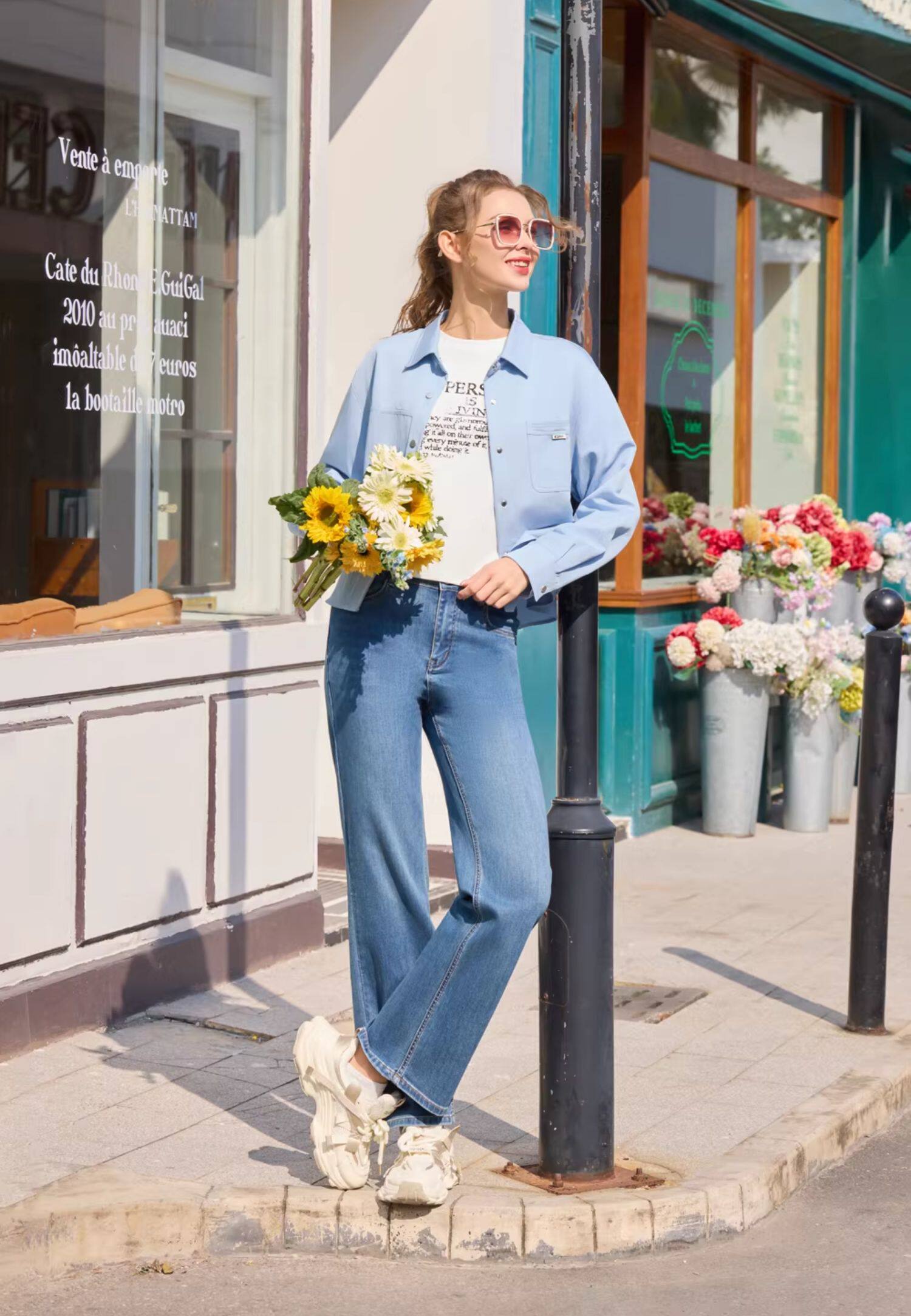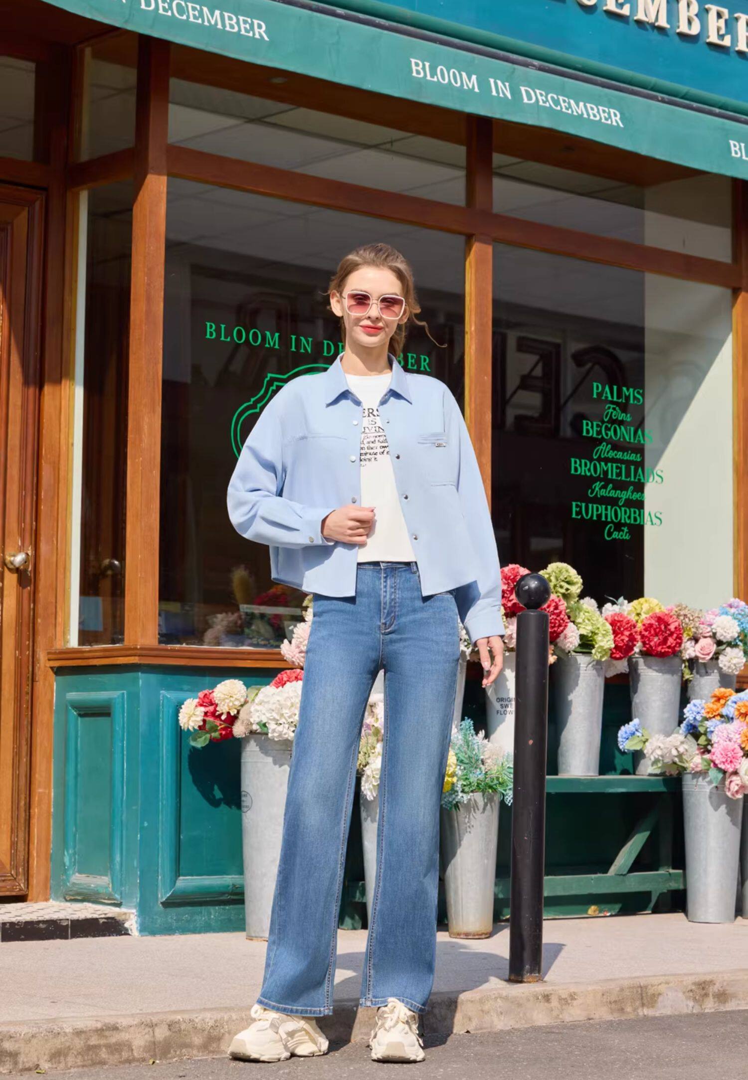半身缘女装 春季宽松袖口翻边拼色洗水衬衫261213U01040263