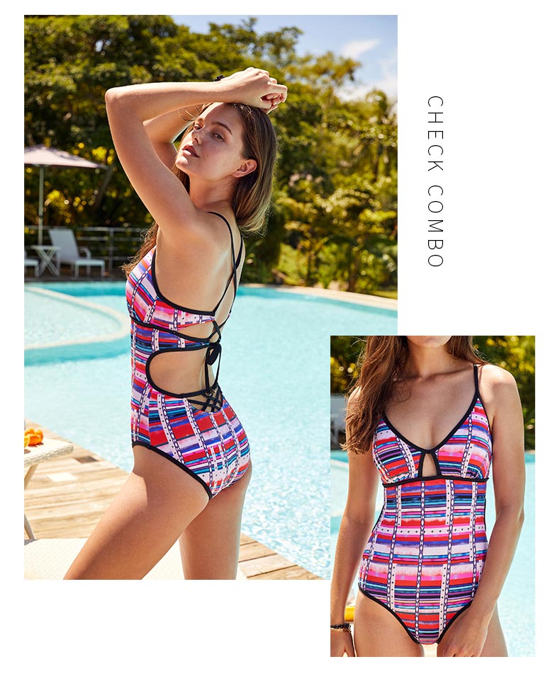 sisia新款欧美格子连体泳衣遮肚显瘦露背泳衣女 彩色网格SS202W03P7A