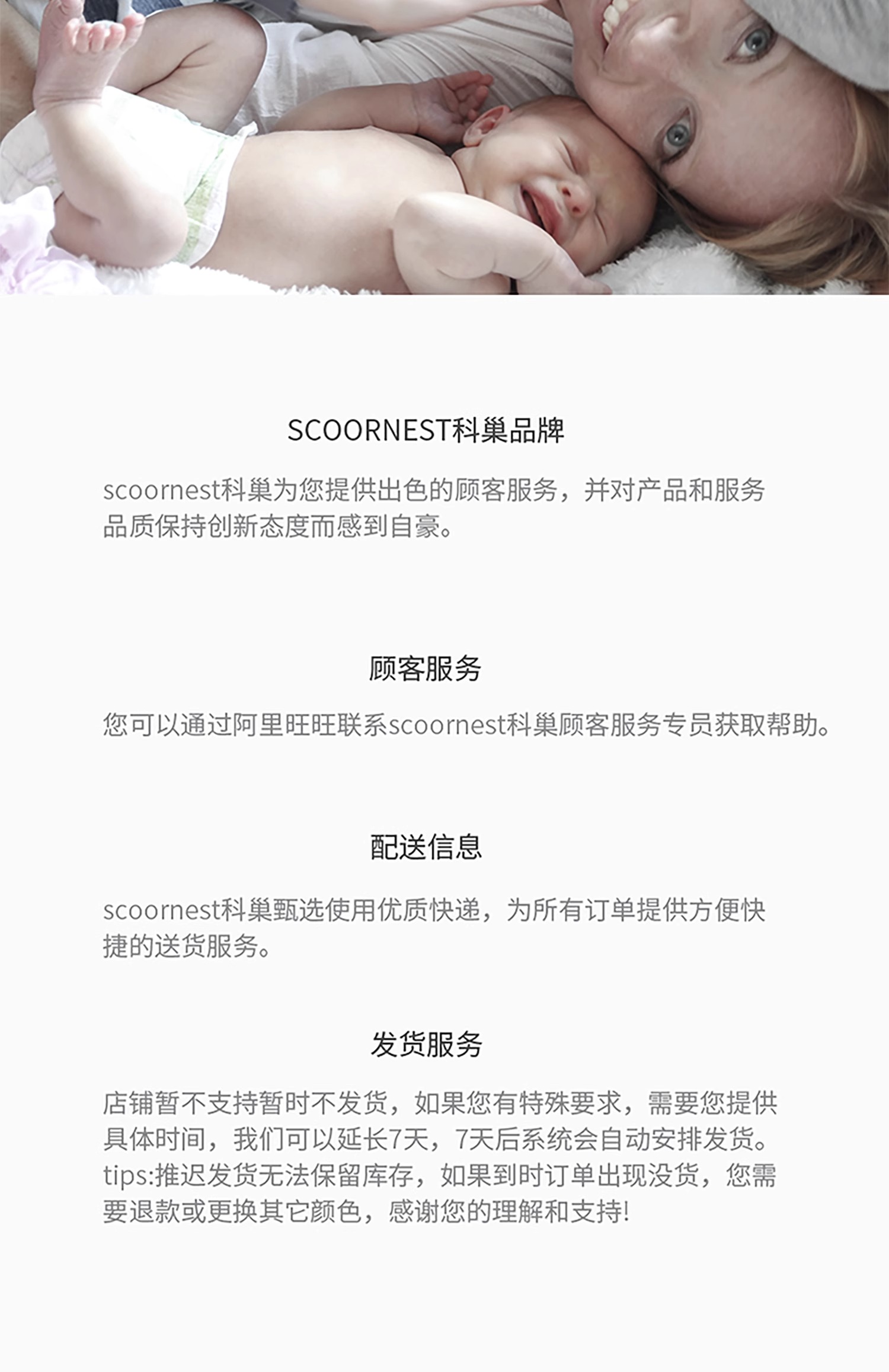- Scoornest始终秉承给每一位宝宝送去科学的、关心的、创新的成长体验,通过提供商品和服务,使顾客形成守护、发展、巩固这种弥足珍贵的亲情的爱。