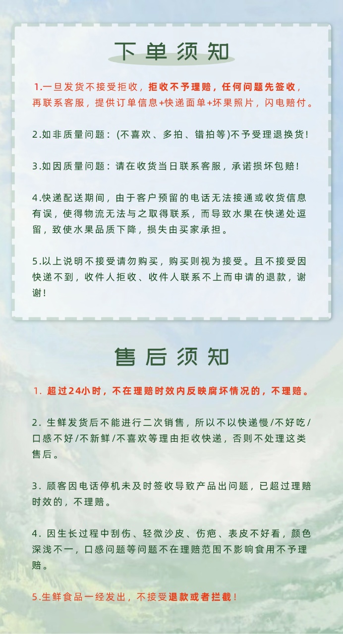 5、以快递不够快、不想要,以及个人主观感觉不够甜、不够酸、不够好看等问题不属售后问题。轻微碰伤不影响食用请理解。