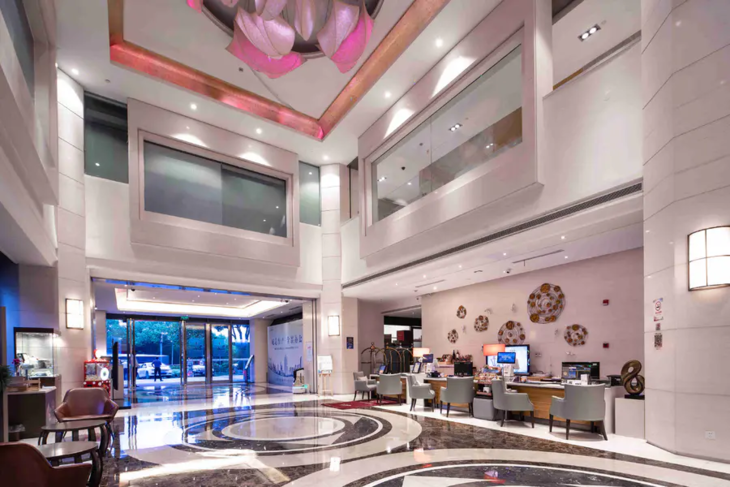 酒店由设计台北101大楼的李祖原建筑事务所操刀设计,是昆山市地标建筑,外部风格时尚独特,走进内部便感受到大气华丽,大理石地面用料考究,两层挑高使大堂宽敞明亮,装饰摆件尽显优雅。