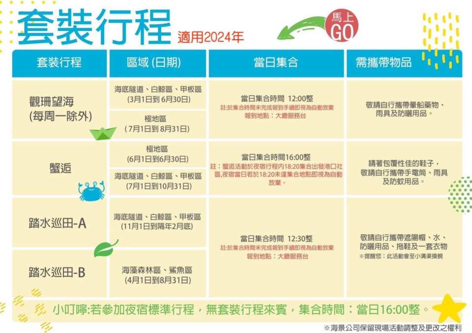 标准行程、水上游览、螃蟹邂逅活动:3岁以下婴幼儿可免费参加。