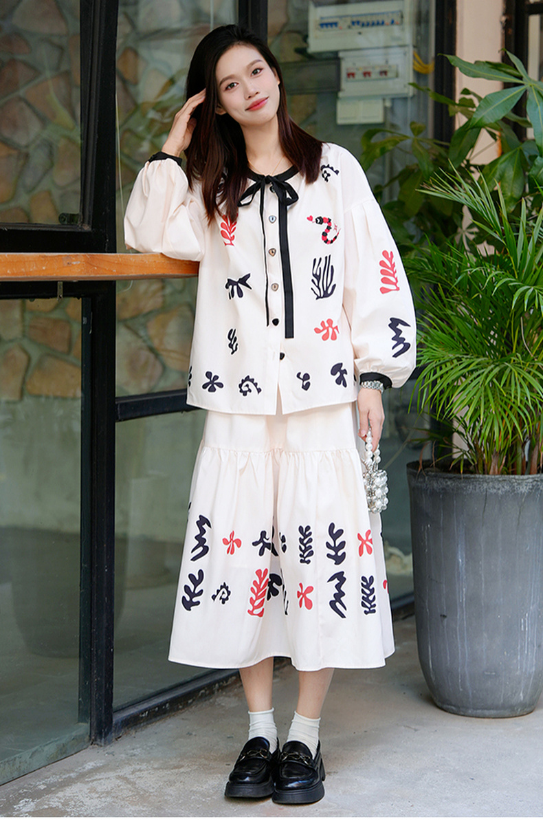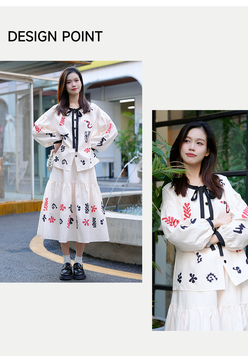 两三事 绮想织画 2025春季新款小清新印花拼色边三件套女时尚套装