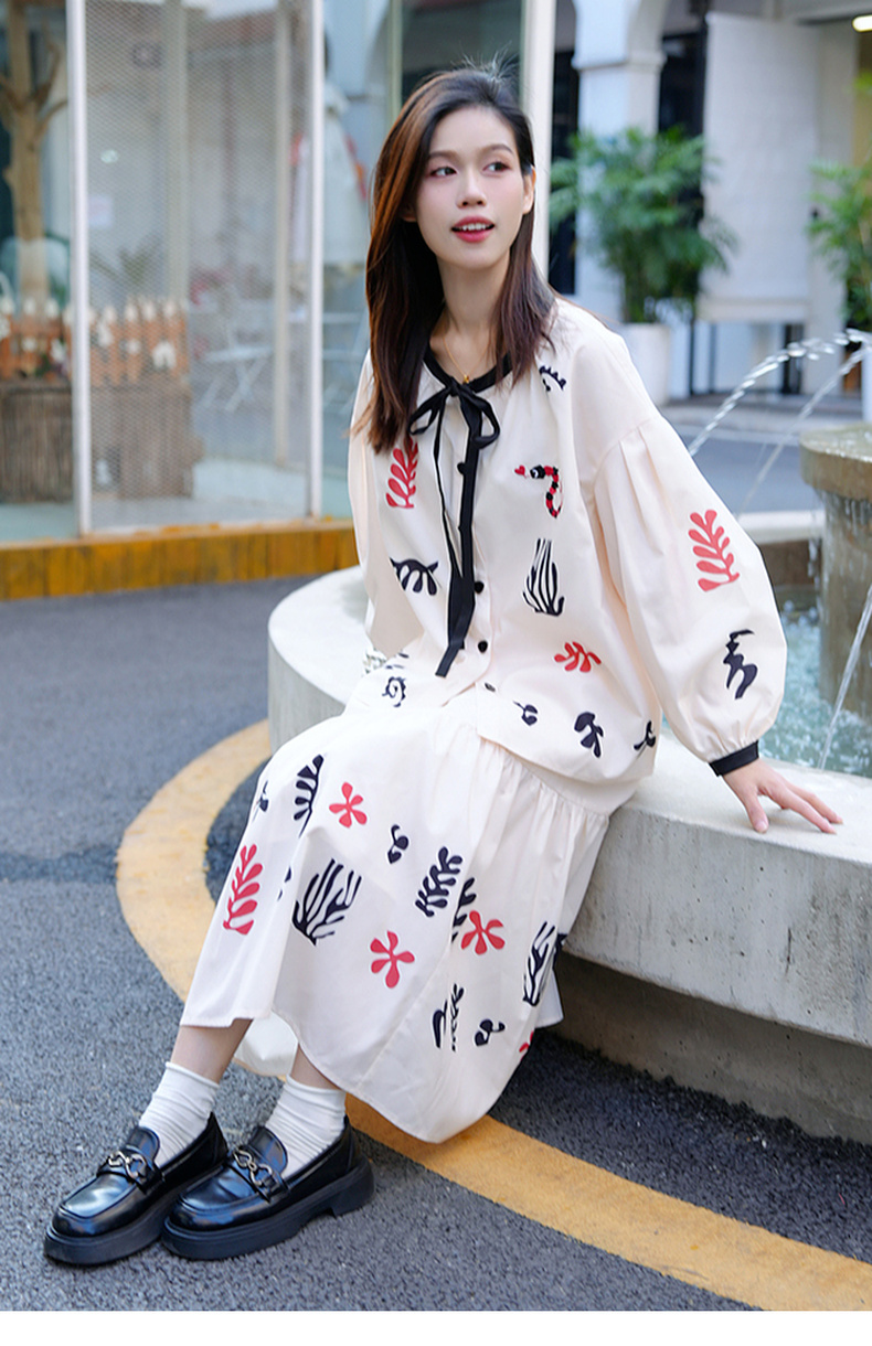 两三事月移花影夏季新款复古印花绑带长袖衬衫女宽松衬衣