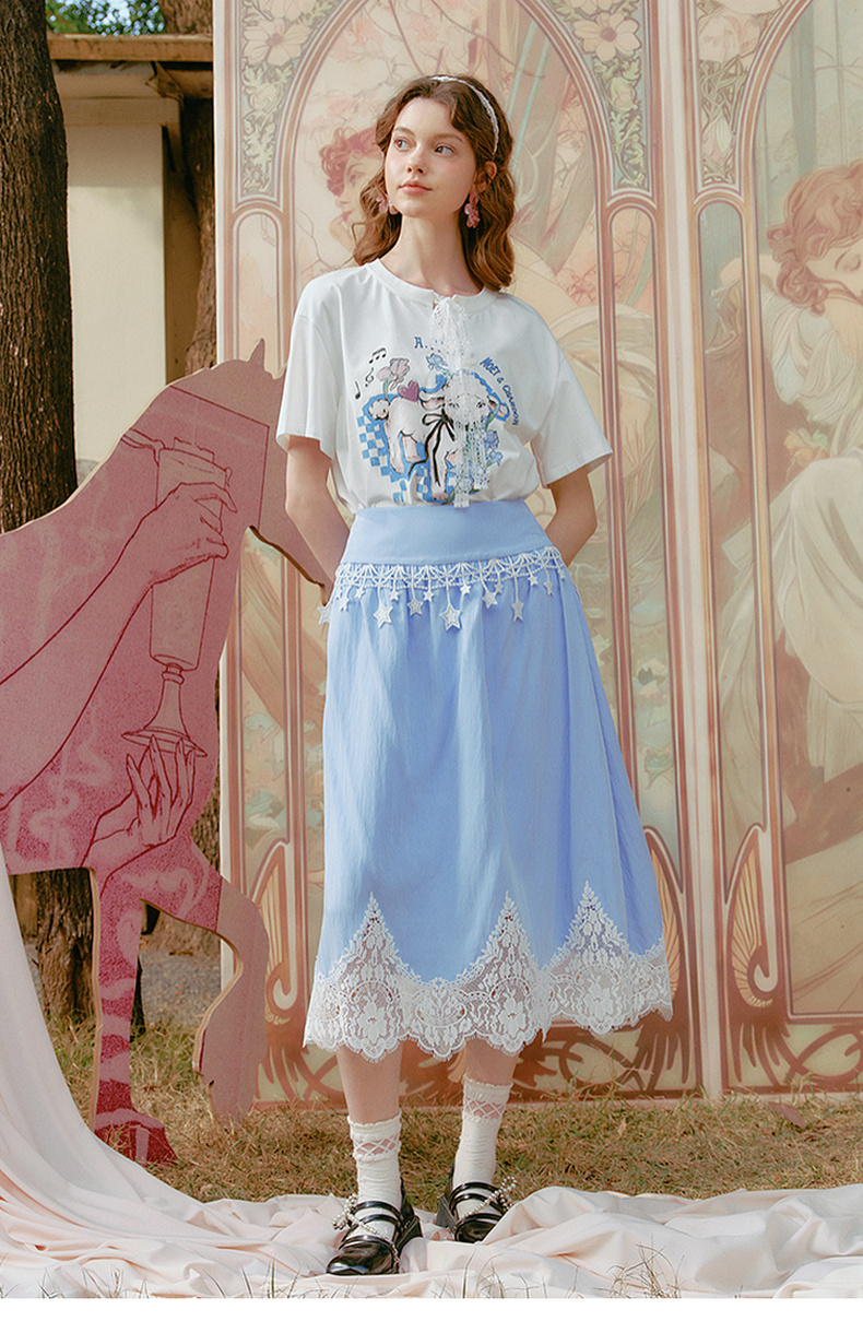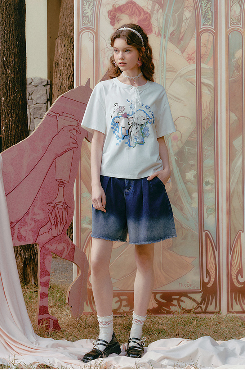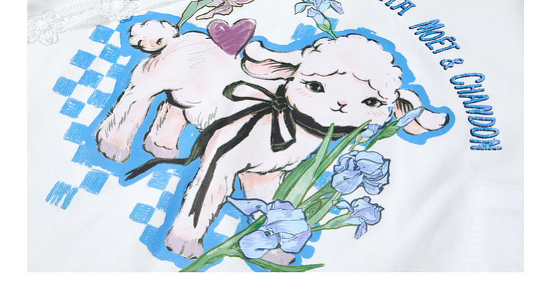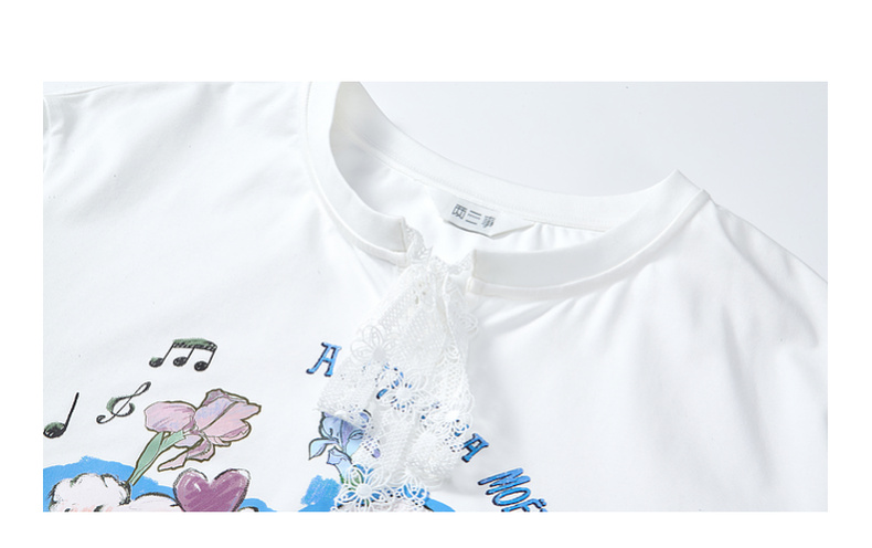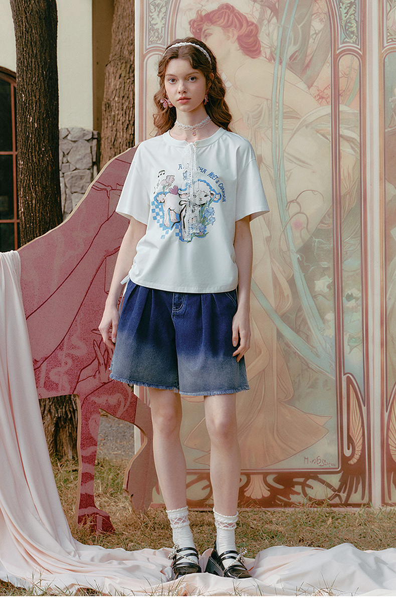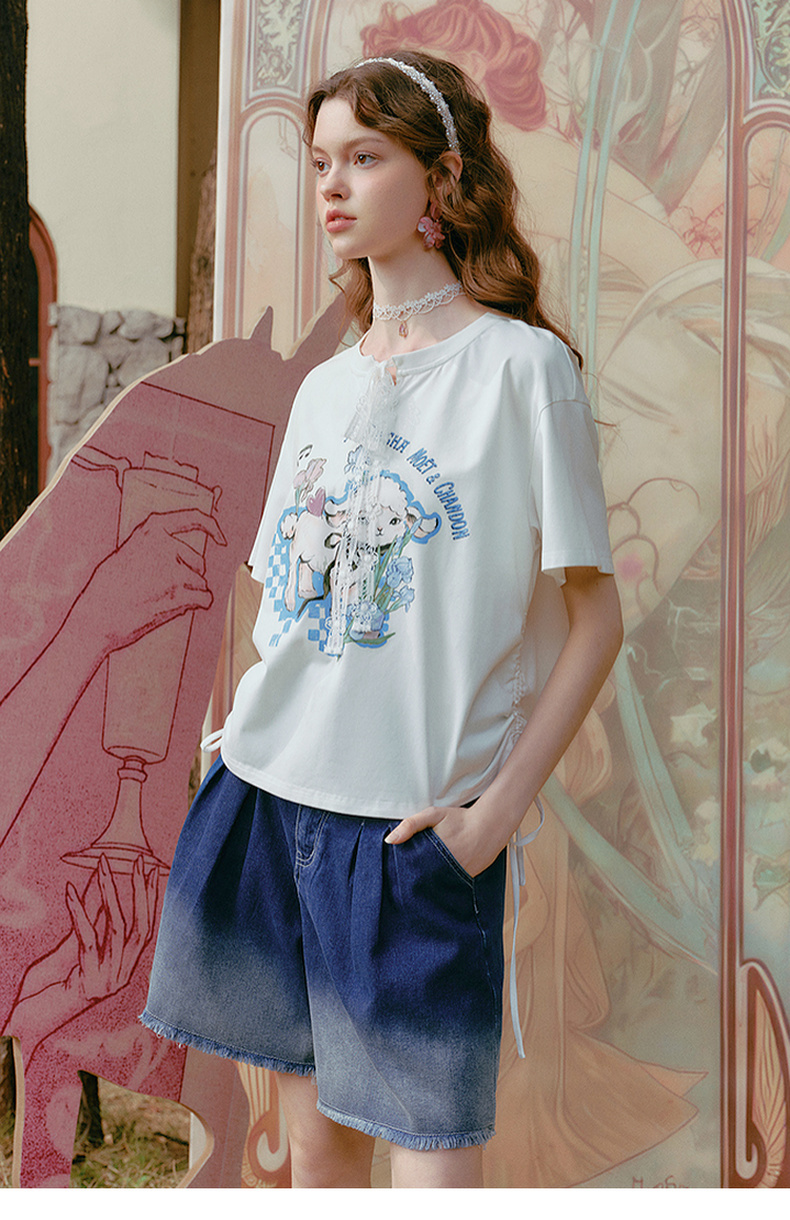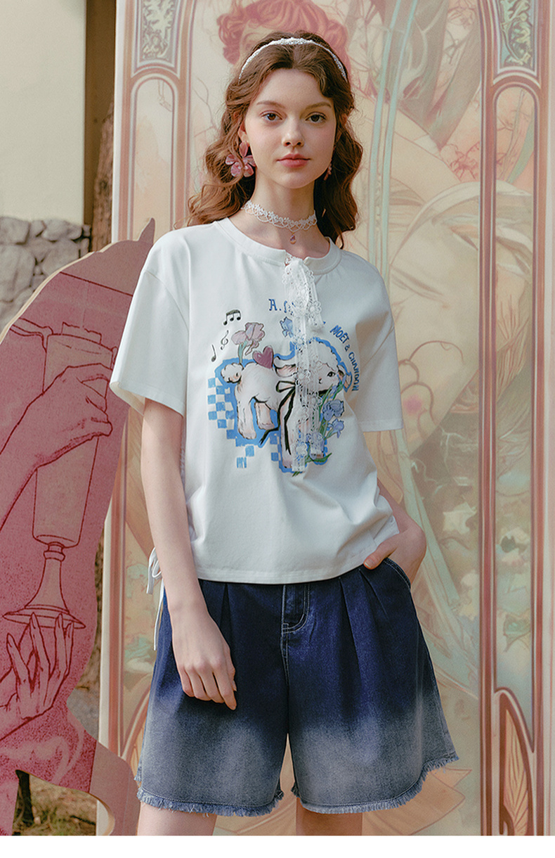 两三事 牧云绮想 2025春季新款可爱小羊印花蕾丝绑带短袖棉t恤女