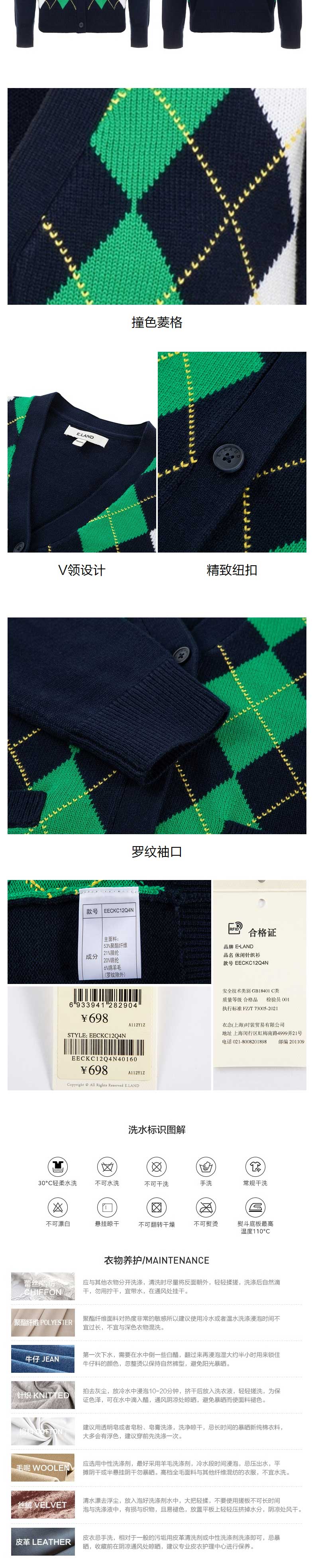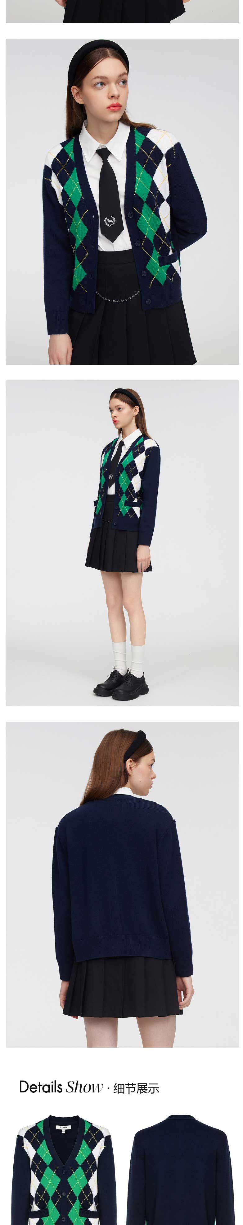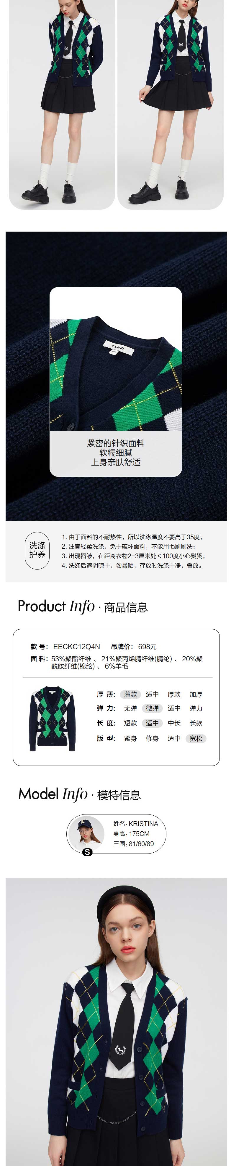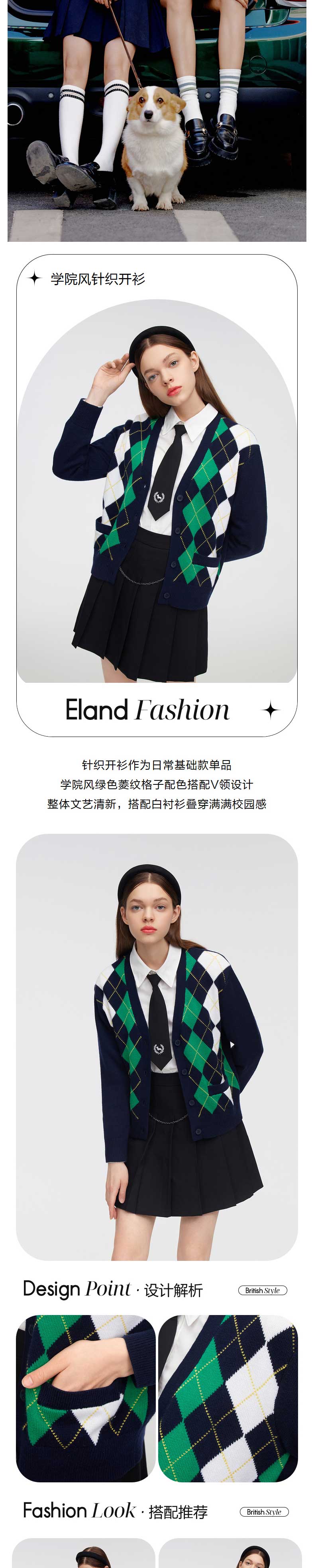 ELAND衣恋2022年春季新款设计感学院风绿色菱格纹针织毛衣开衫女EECKC12Q4N