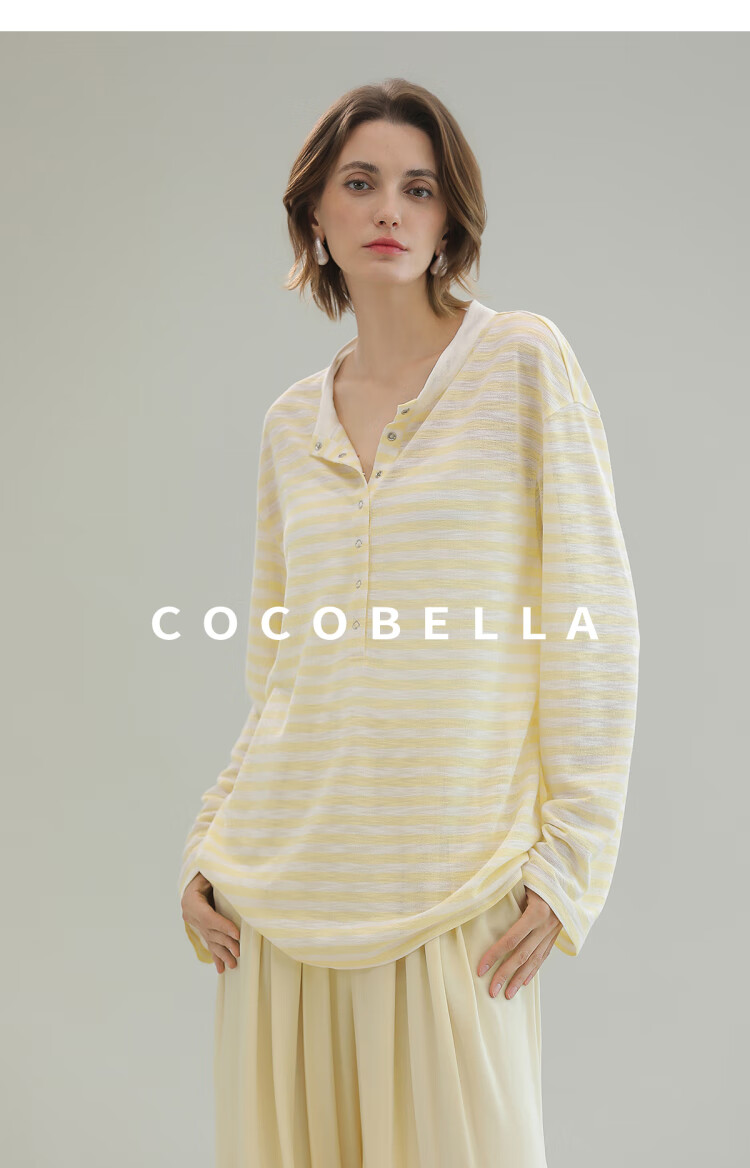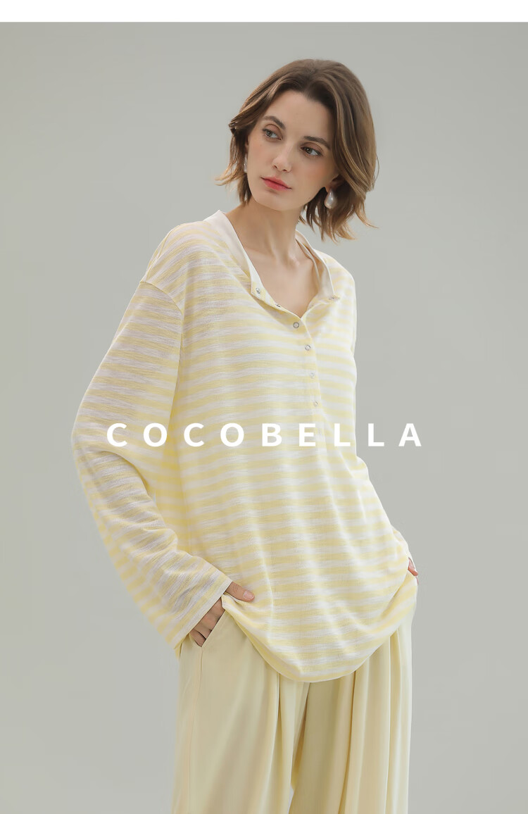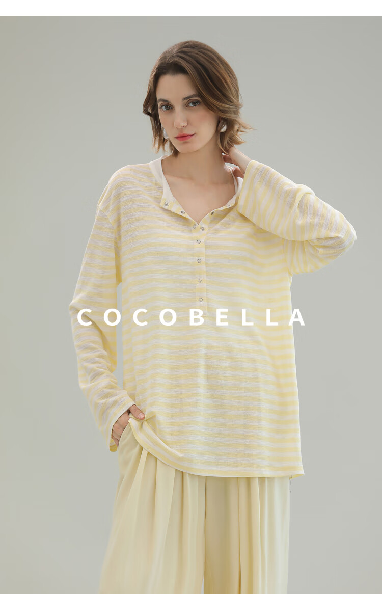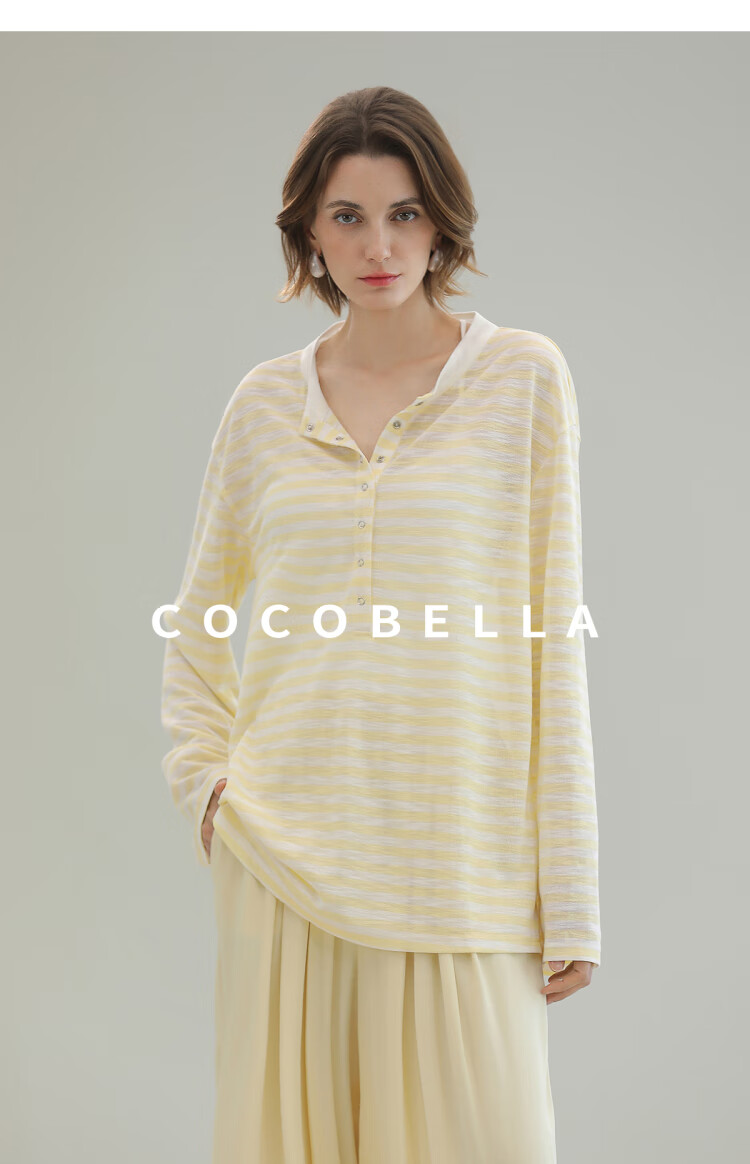 COCOBELLA慵懒休闲亨利领条纹针织衫女微透长袖T恤TS7058