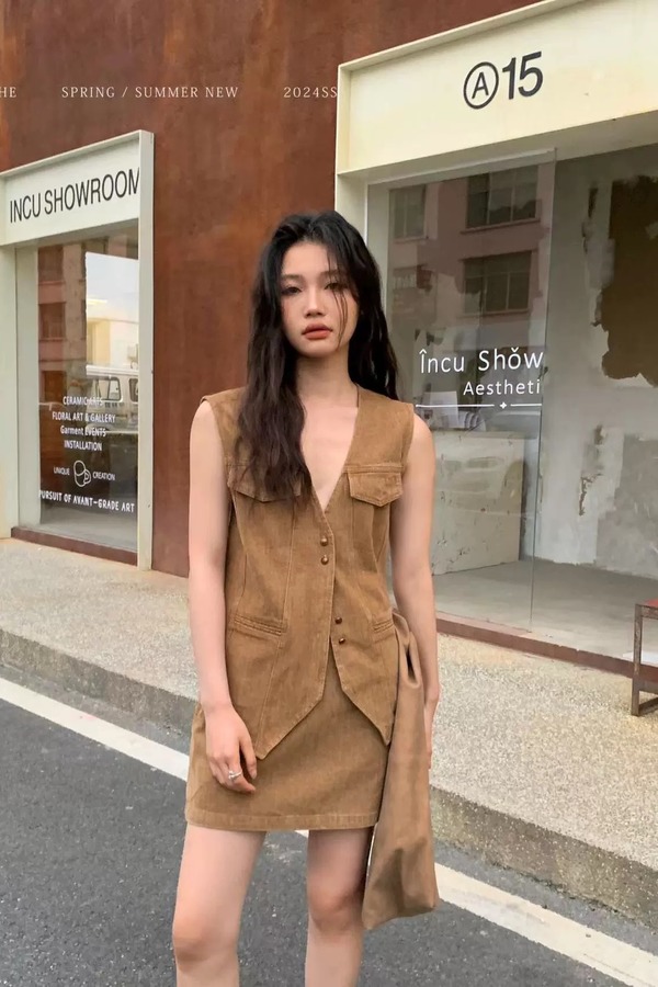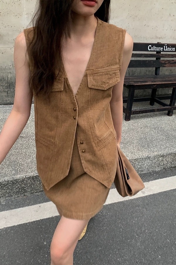 ANSUABEL 咖色复古马甲半裙套装 20232