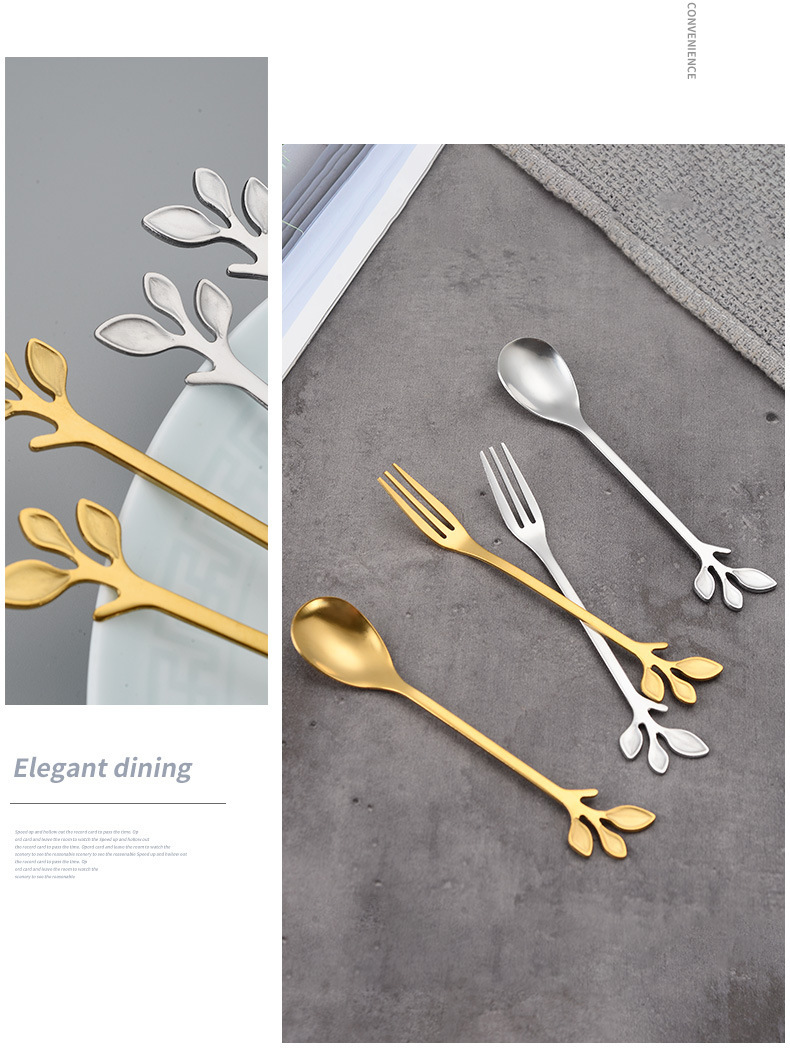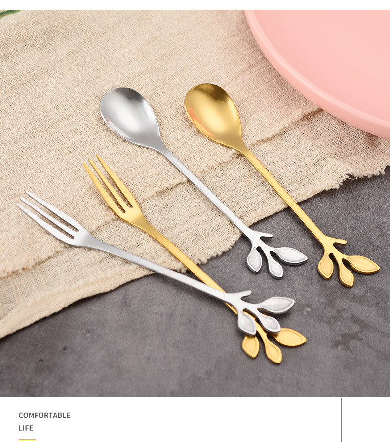 「9.9到手8支!不锈钢叉勺」树叶勺网红甜品勺搅拌勺咖啡勺欧式金色餐饮用具家用吃甜品勺子