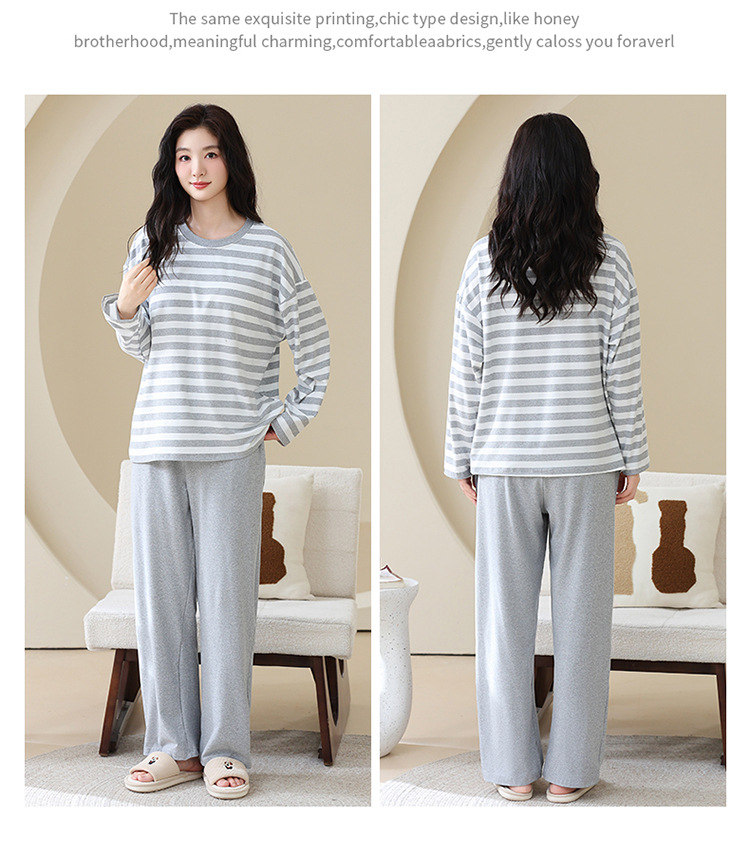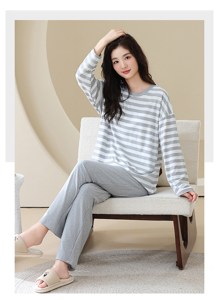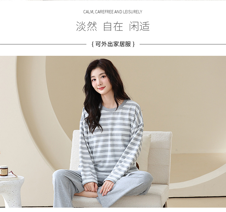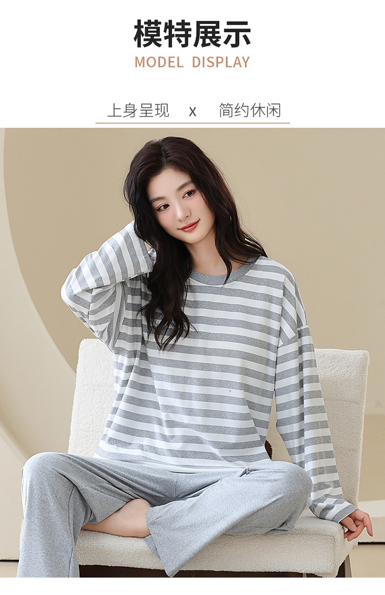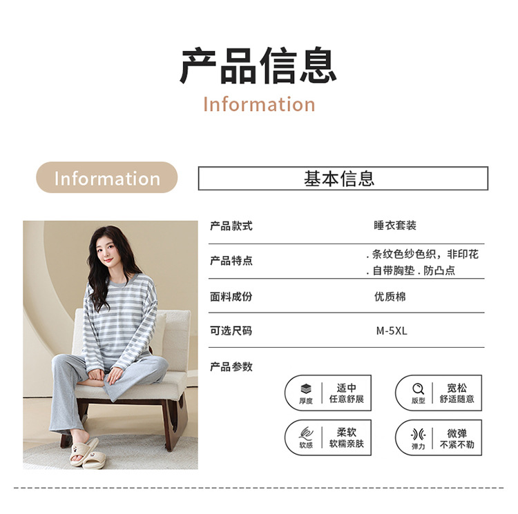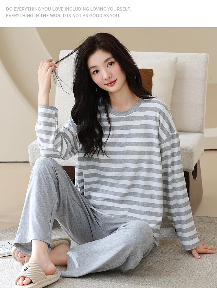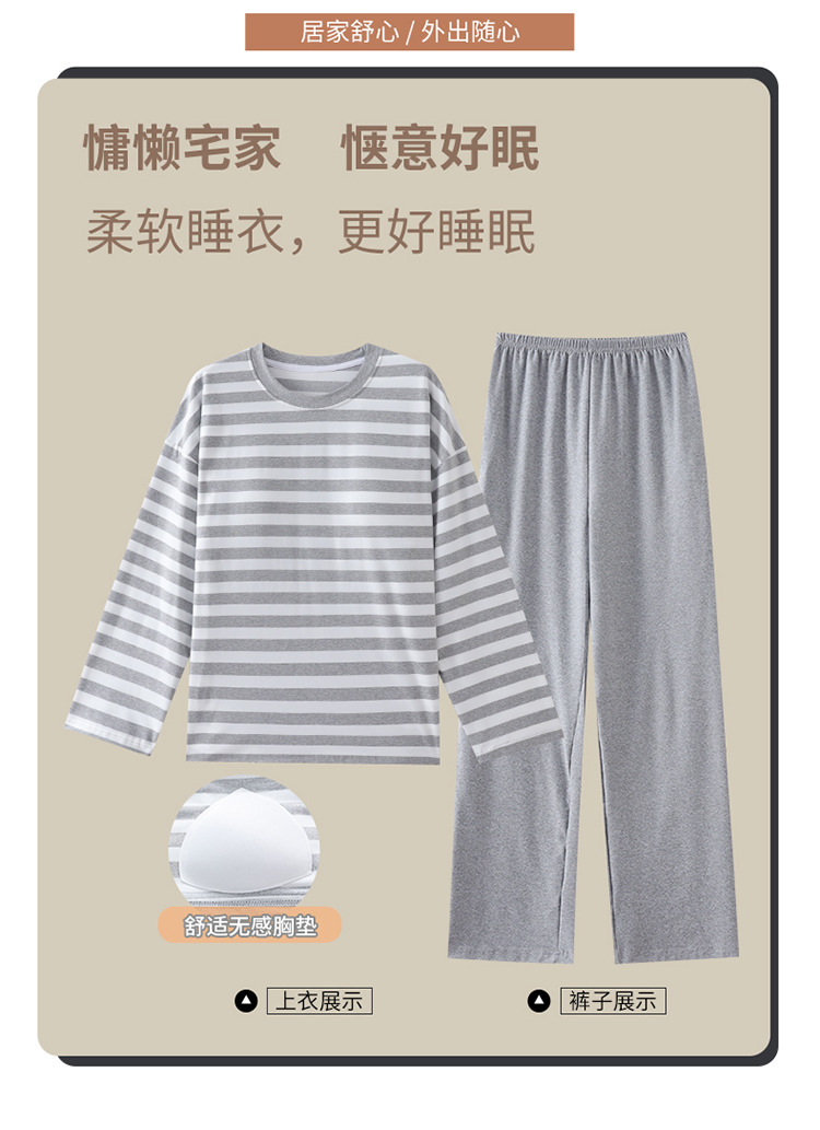 长袖条纹睡衣女秋冬季带胸垫薄款韩版休闲可外穿家居服套装加大码