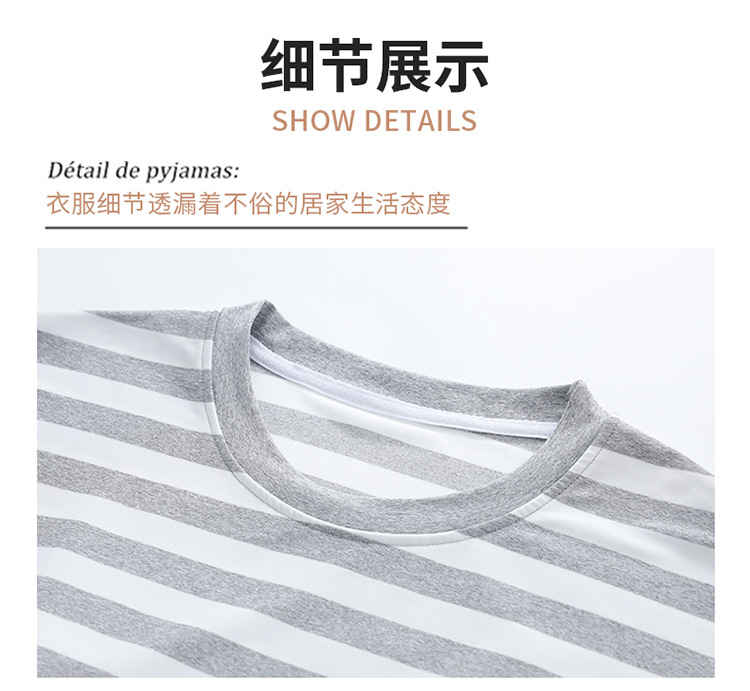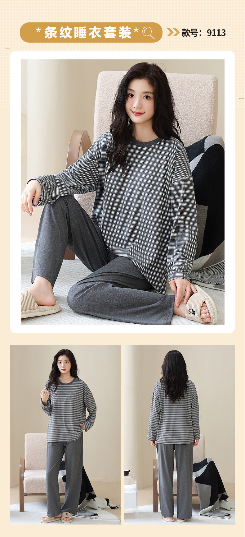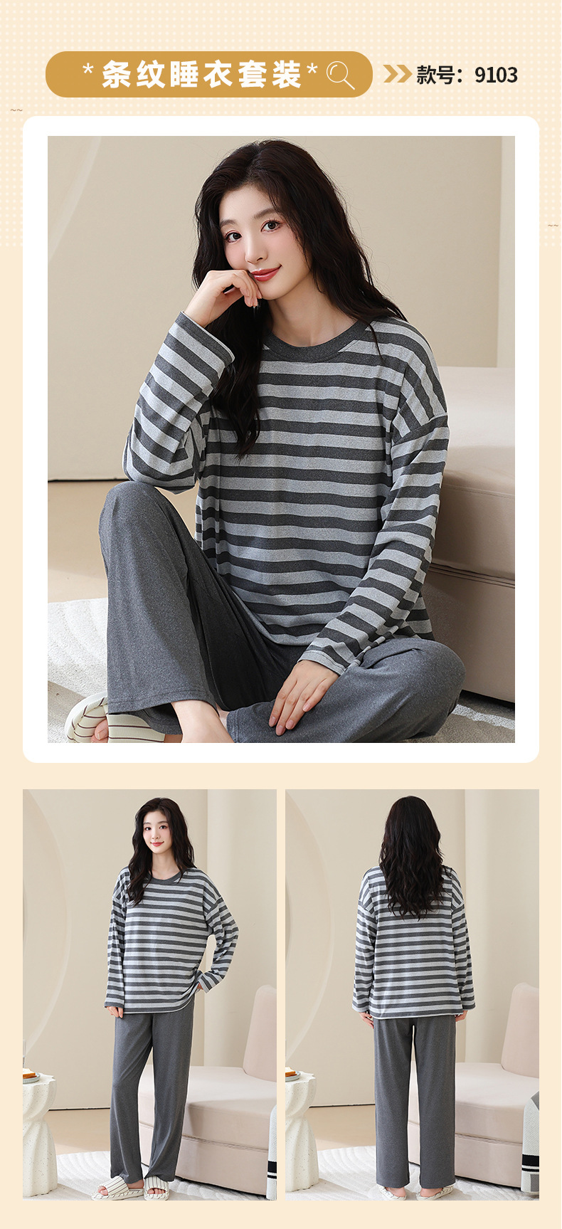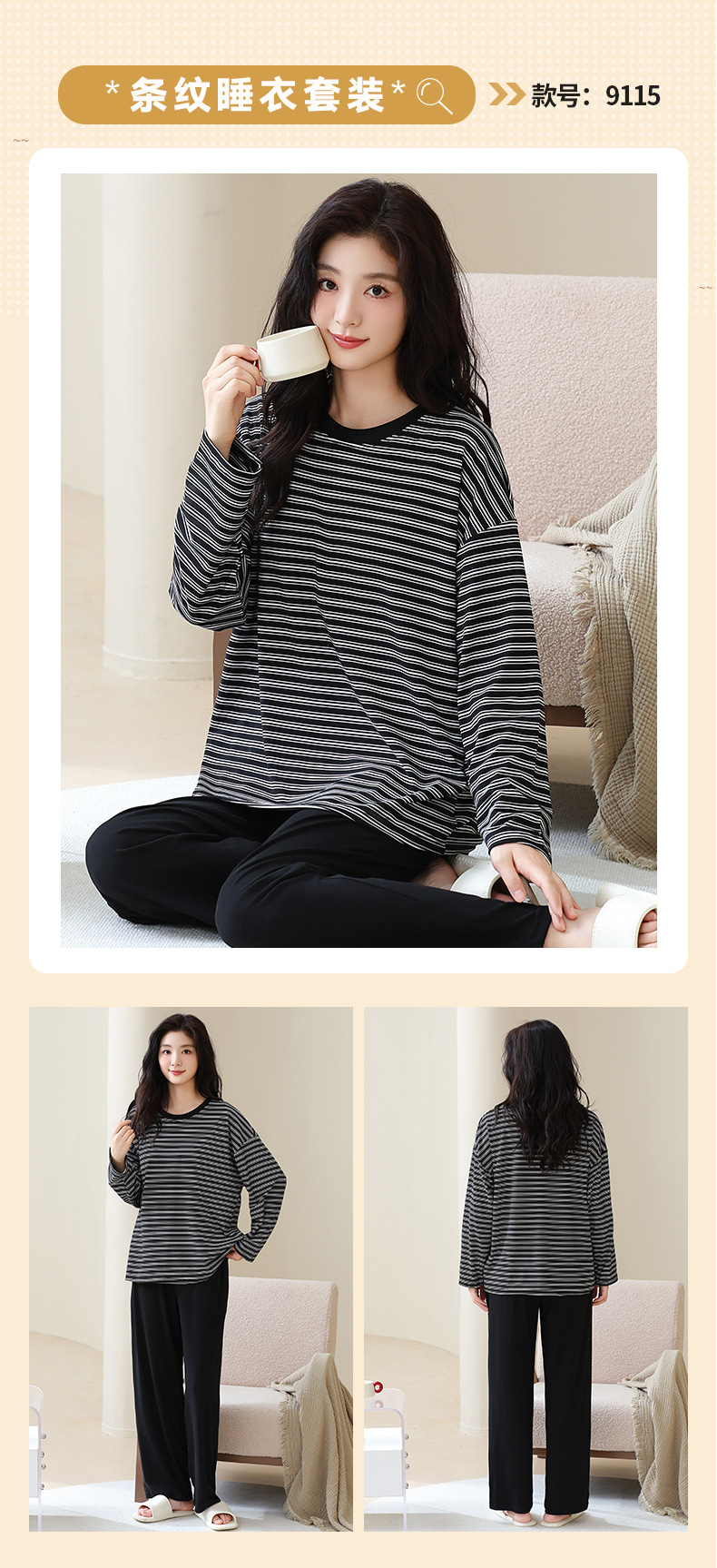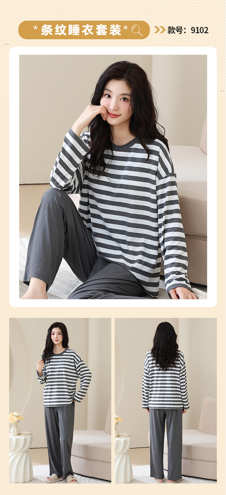 长袖条纹睡衣女秋冬季带胸垫薄款韩版休闲可外穿家居服套装加大码