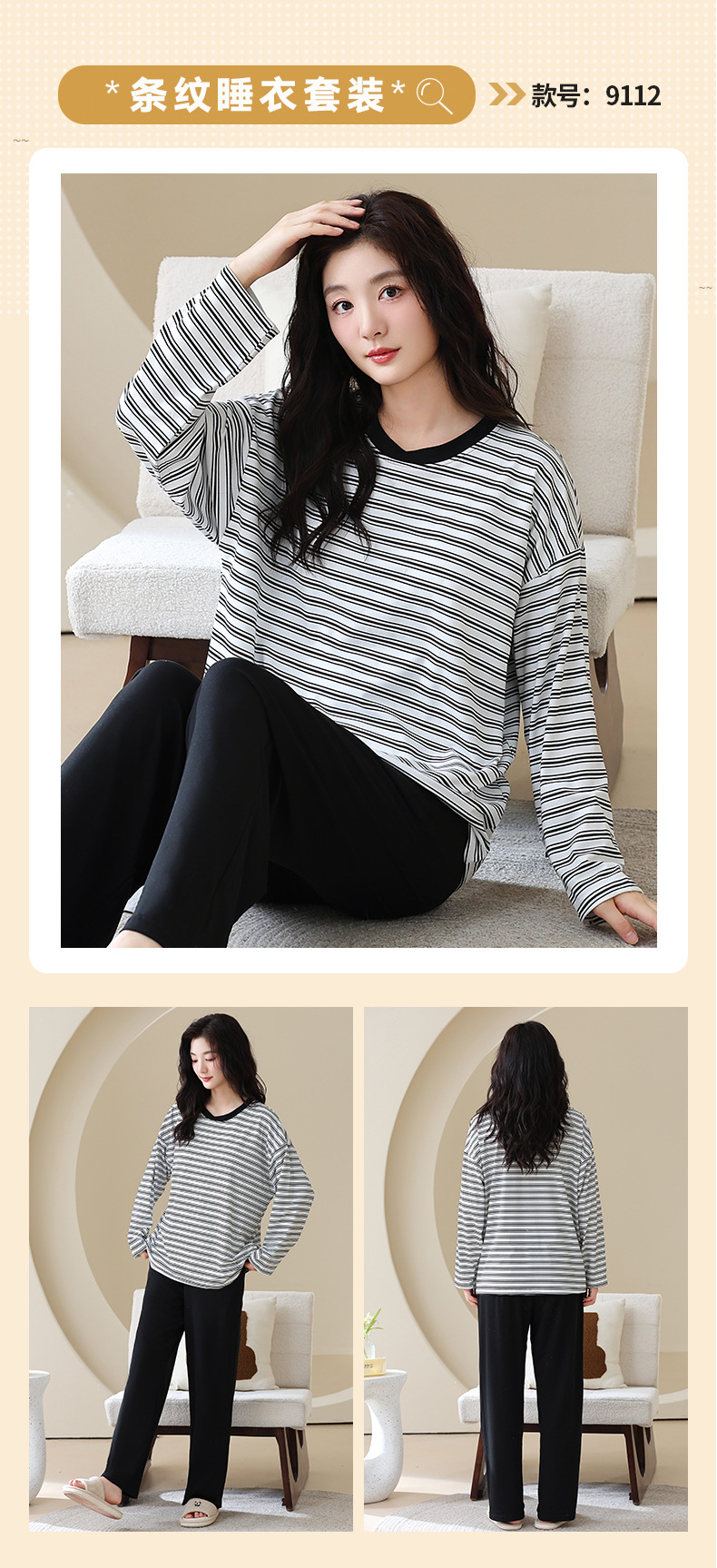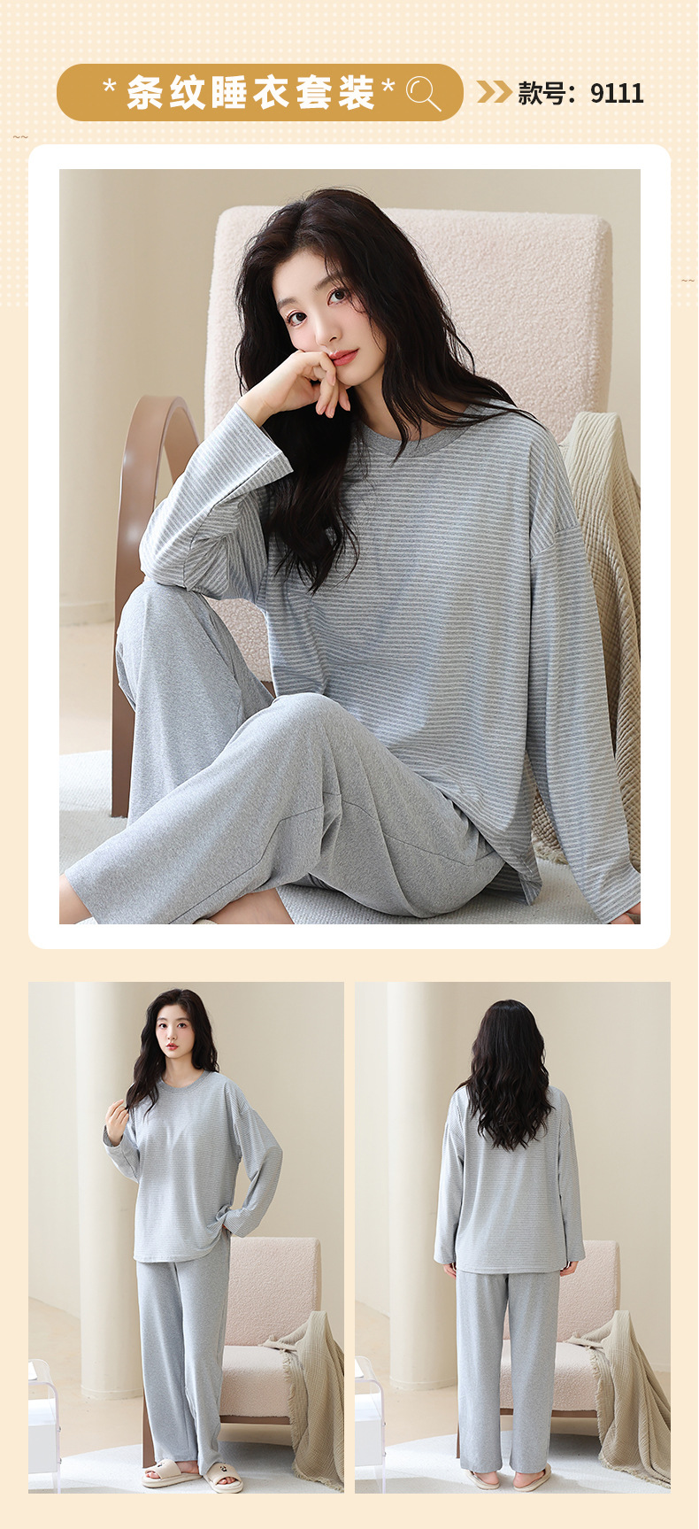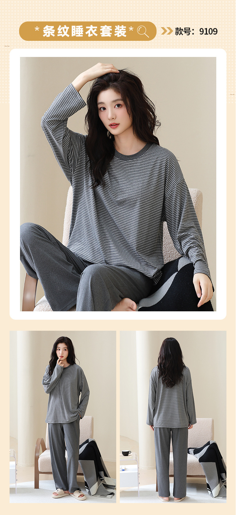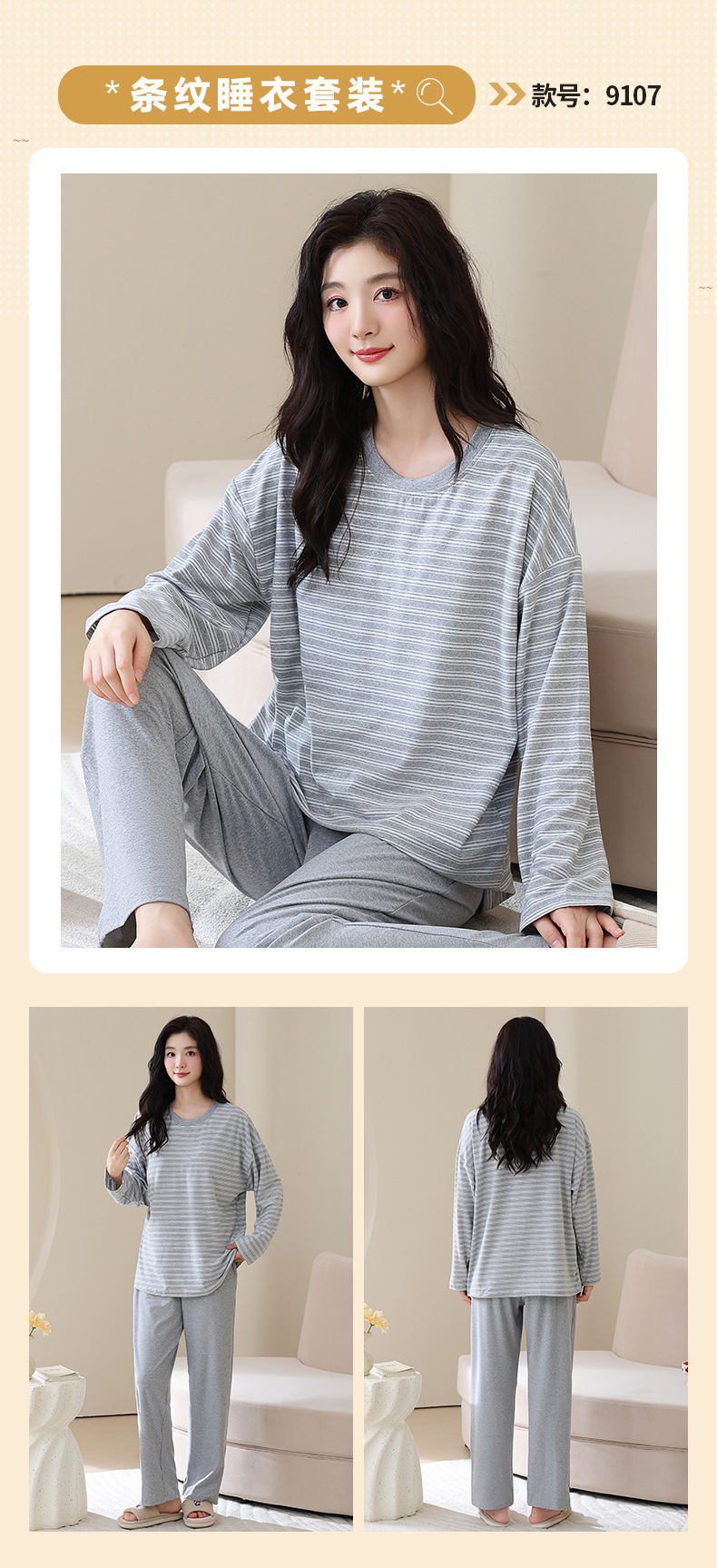 长袖条纹睡衣女秋冬季带胸垫薄款韩版休闲可外穿家居服套装加大码