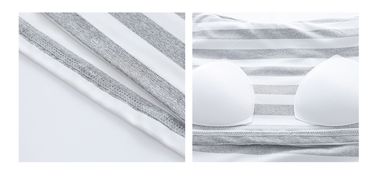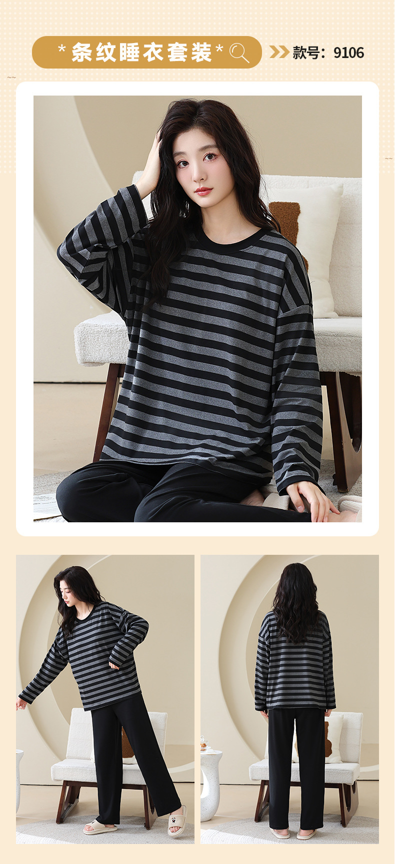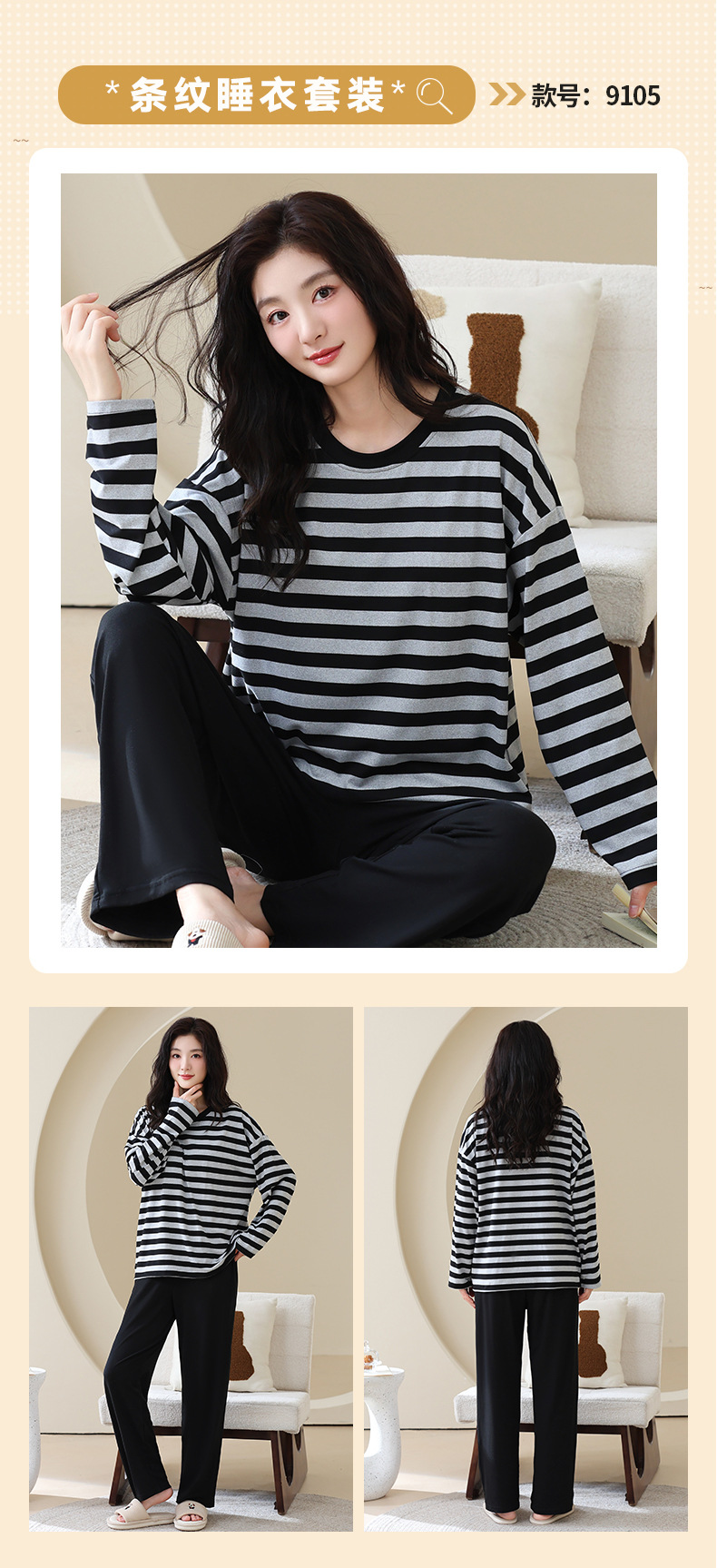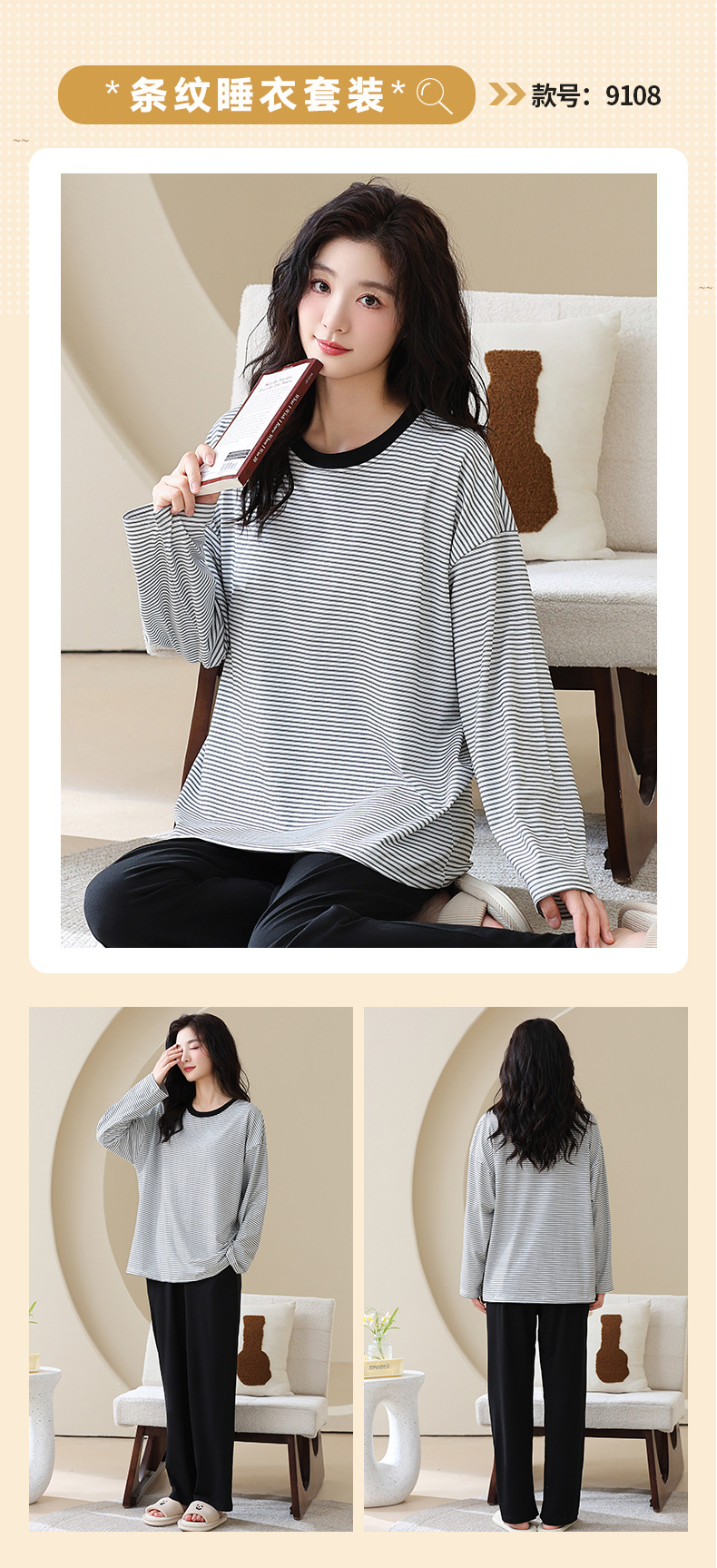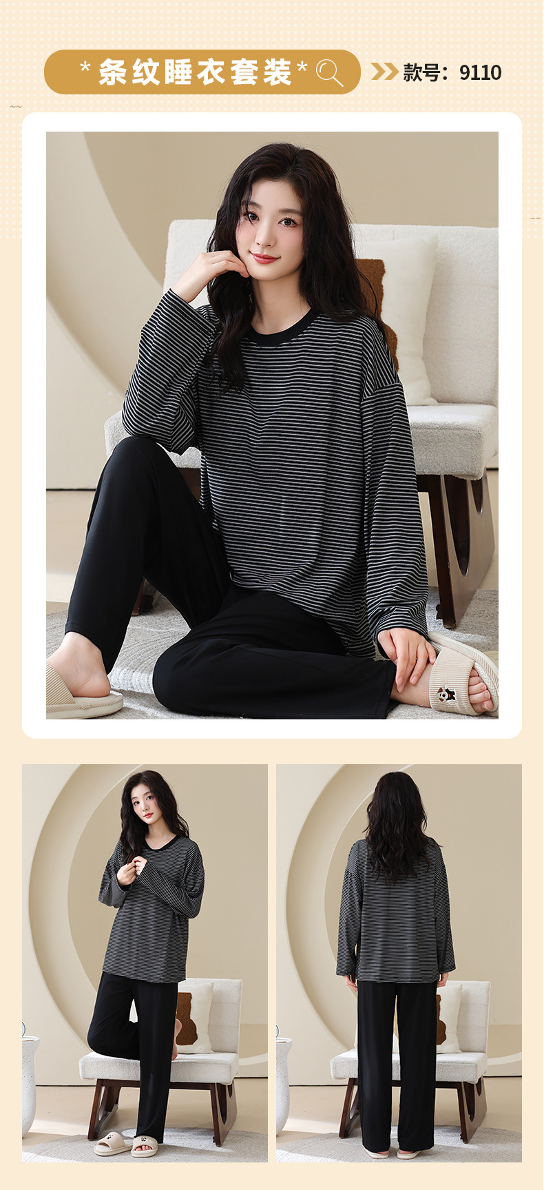 长袖条纹睡衣女秋冬季带胸垫薄款韩版休闲可外穿家居服套装加大码