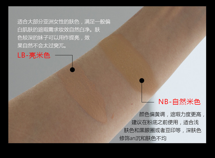 NB自然米色:颜色偏黄调,遮瑕力度更高,建议在粉底之前使用