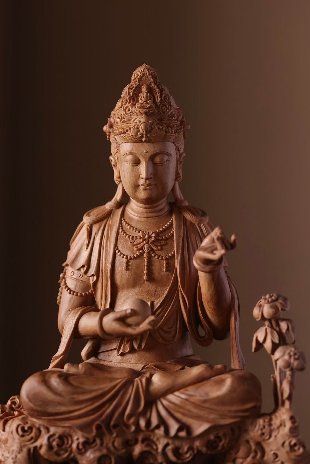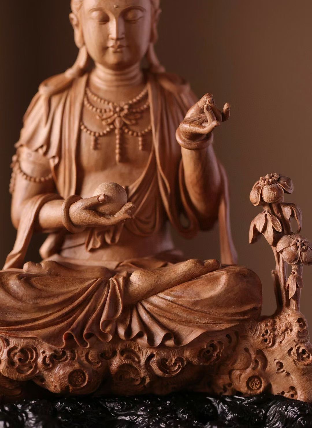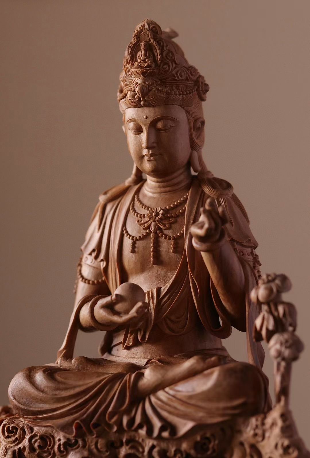 观音手持宝珠,表示观音“自度度人,智悲双运”,既能自利,观理事无碍之境而了达自在,又能利他,观一切众生之机而化度自在,以般若启众生智慧。菩萨立像头束高髻,戴化佛冠,头戴帔巾,项饰璎珞,身着法衣,半敞胸怀,绣袍宽大,褶皱自然。面相丰满,神态自然安详,端坐於莲台之上。这尊观音体态自如,细部刻画精致,线条流畅,如行云流水,一气呵成,体现了雕刻的高度水准。