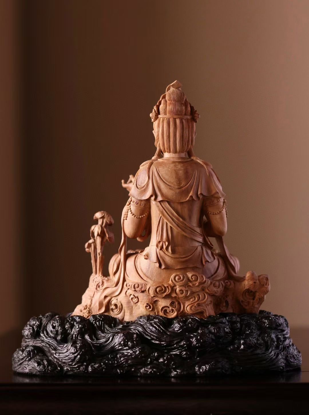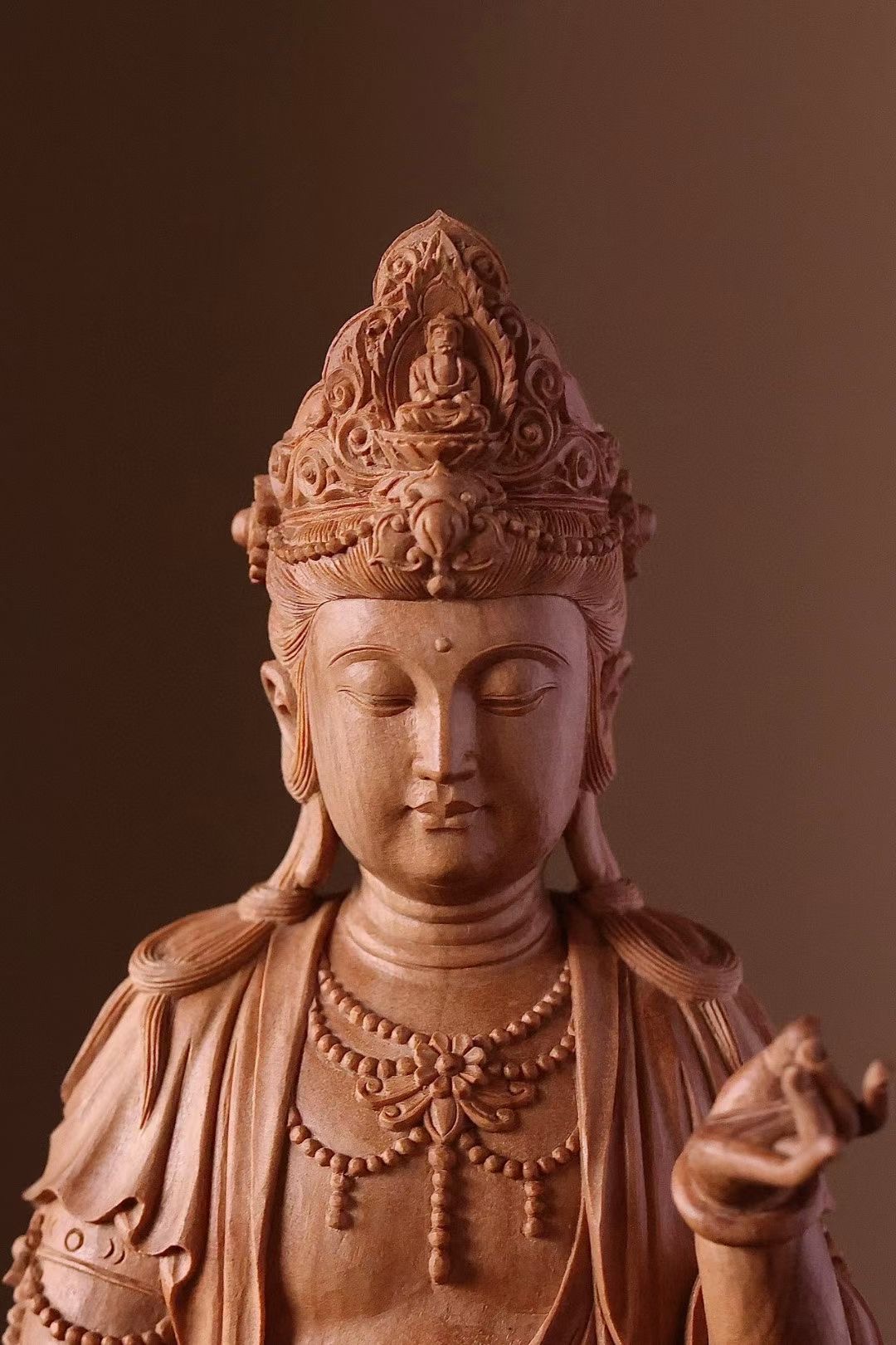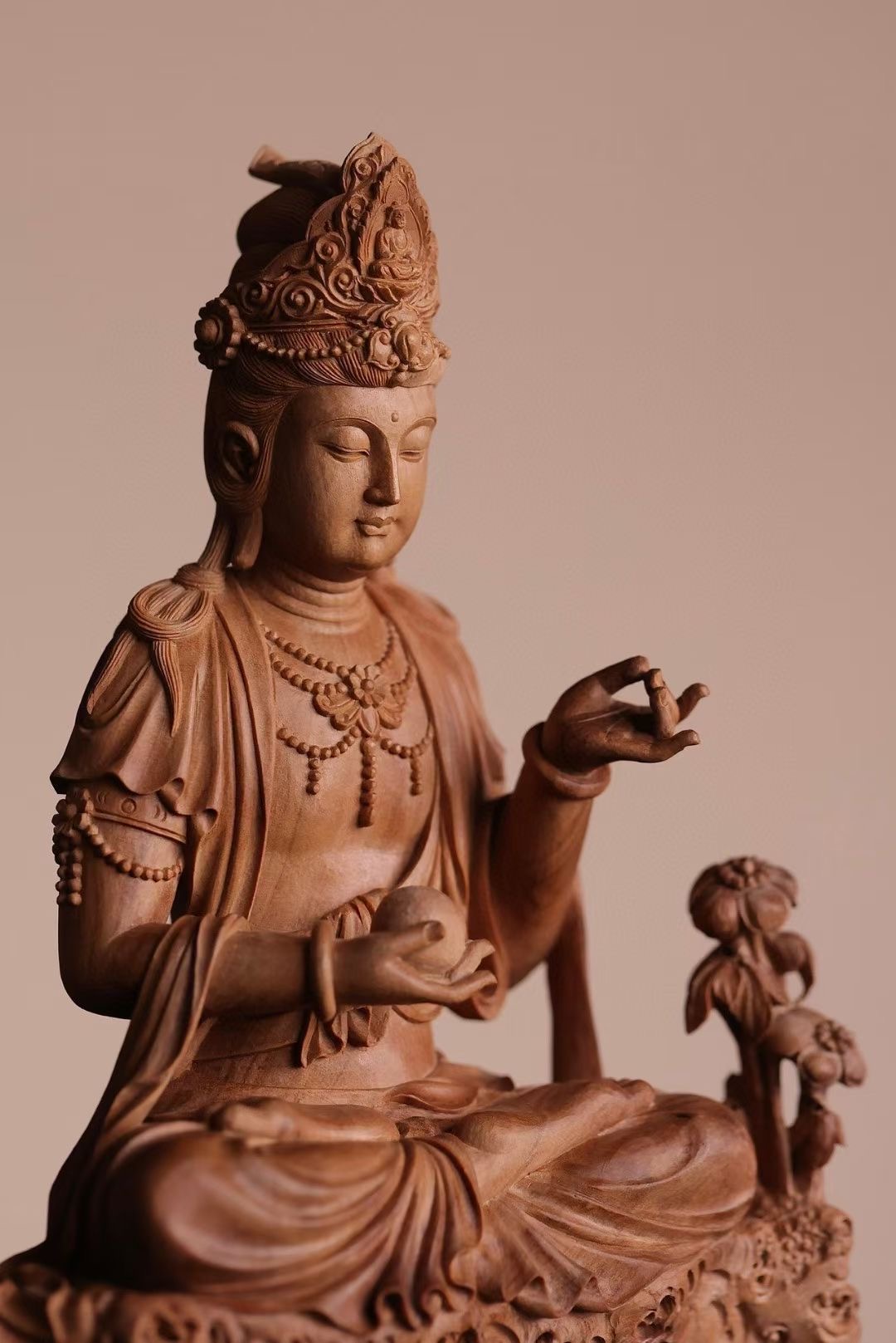 观音手持宝珠,表示观音“自度度人,智悲双运”,既能自利,观理事无碍之境而了达自在,又能利他,观一切众生之机而化度自在,以般若启众生智慧。菩萨立像头束高髻,戴化佛冠,头戴帔巾,项饰璎珞,身着法衣,半敞胸怀,绣袍宽大,褶皱自然。面相丰满,神态自然安详,端坐於莲台之上。这尊观音体态自如,细部刻画精致,线条流畅,如行云流水,一气呵成,体现了雕刻的高度水准。