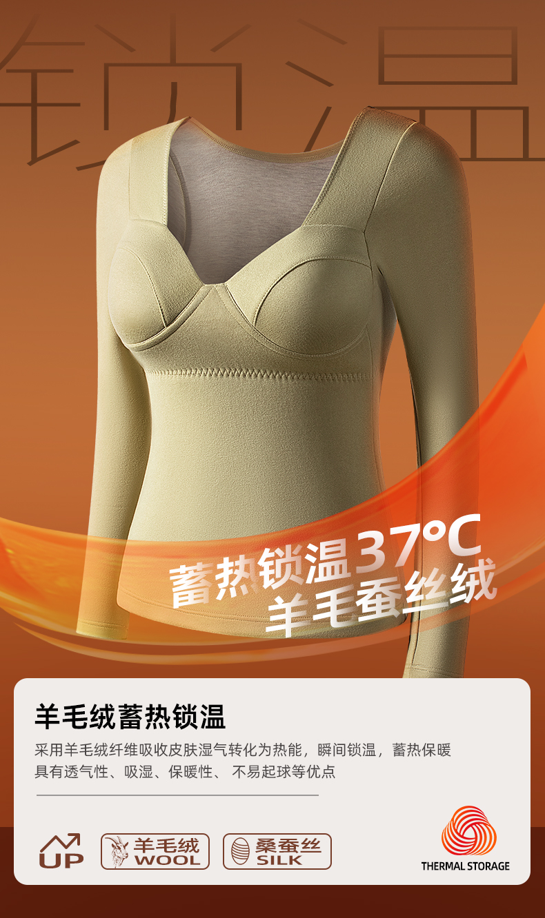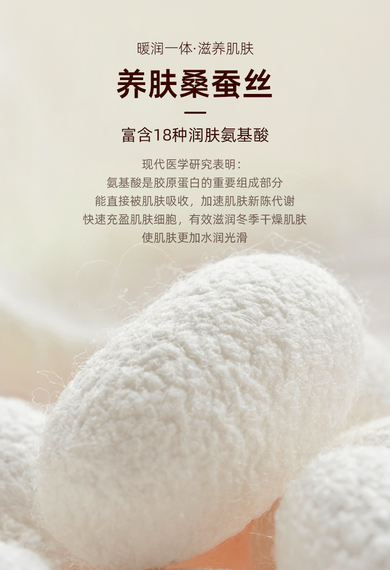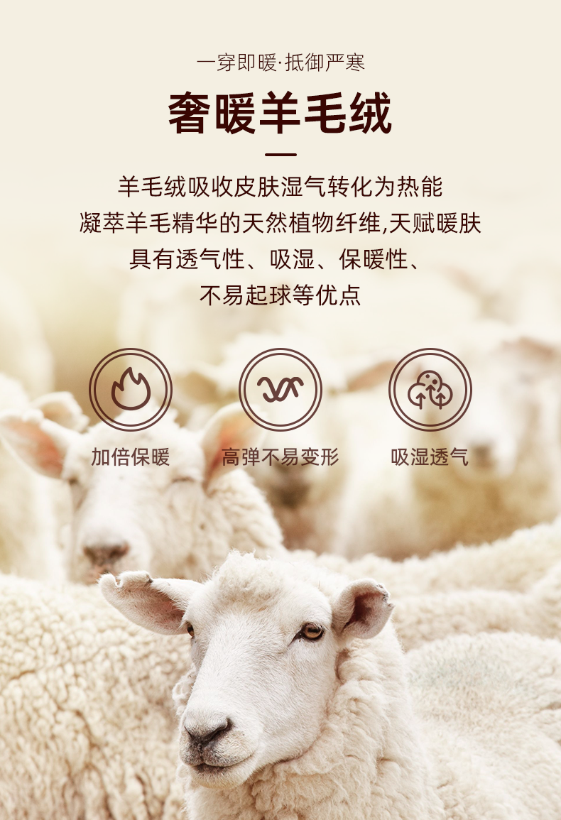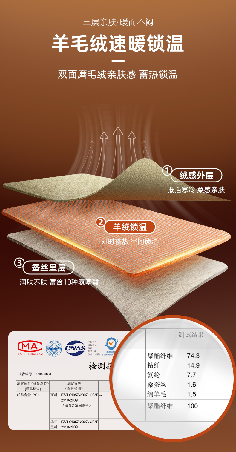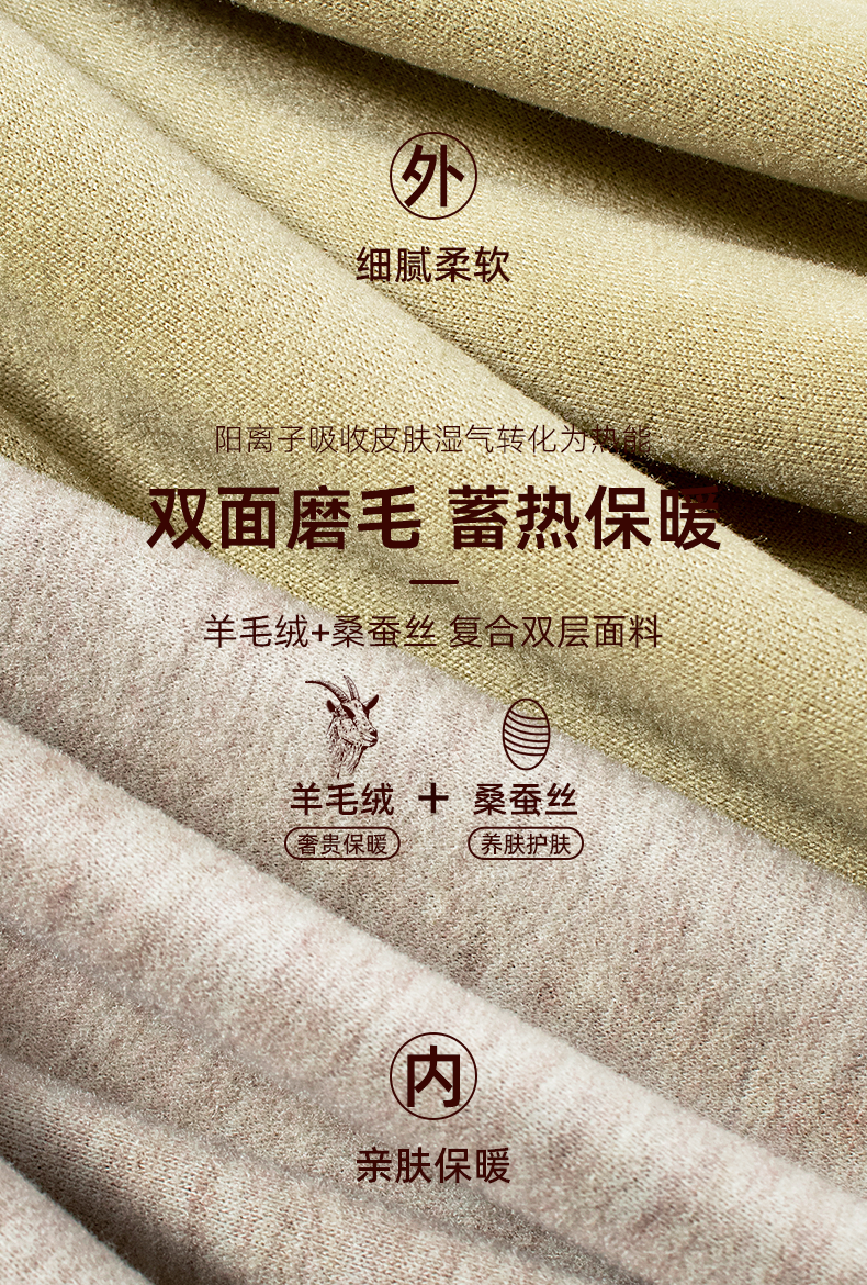④采用羊毛蚕丝绒蓄热锁温,双面双色磨毛,锁住热量不流失。