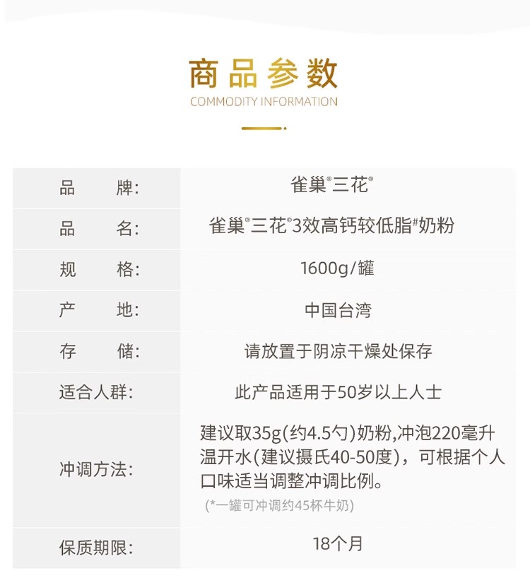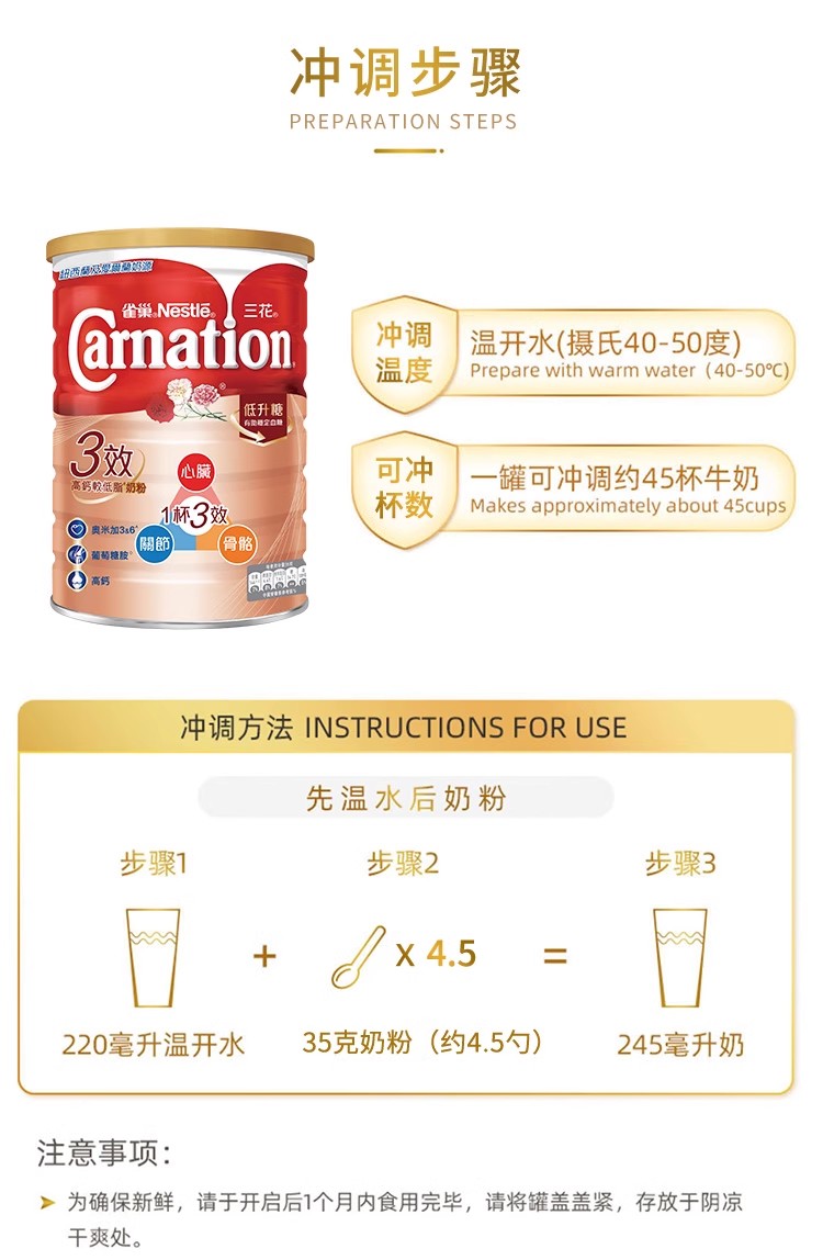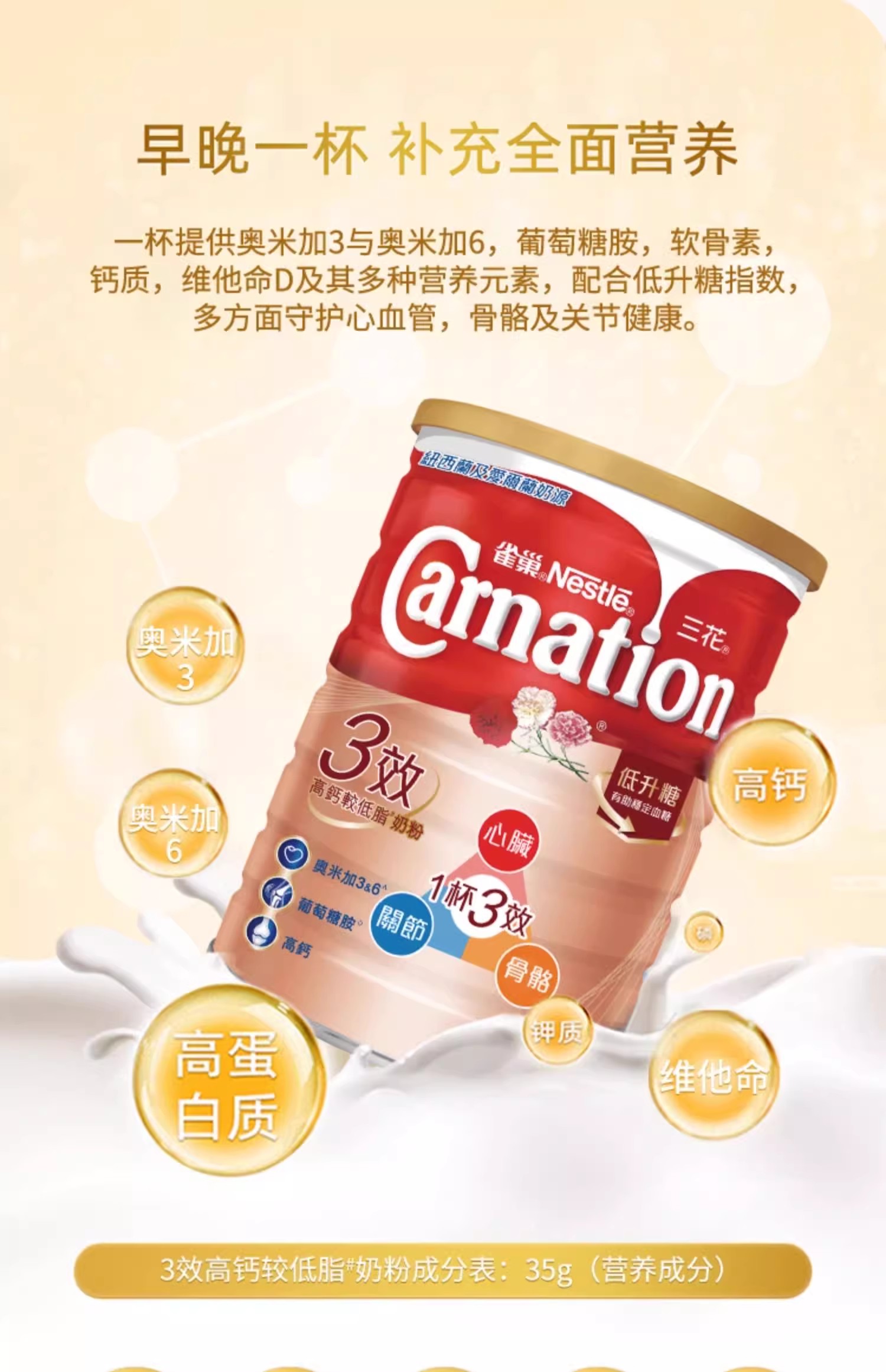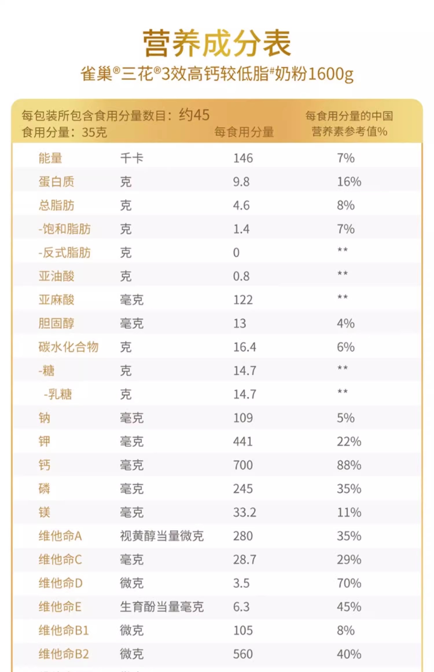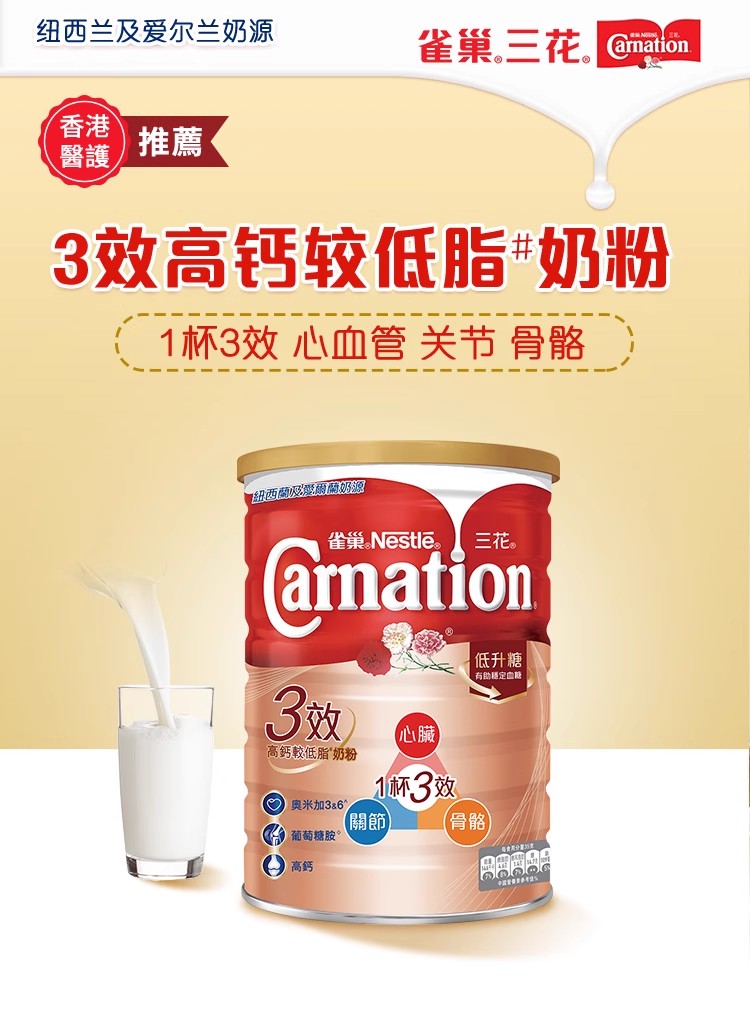 雀巢Nestle 三花 3效 高钙较低脂奶粉 1600克成人奶粉