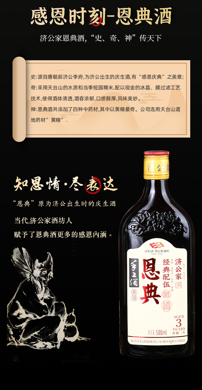 济公家恩典手工酒库藏三年特产黄酒500ml*6瓶