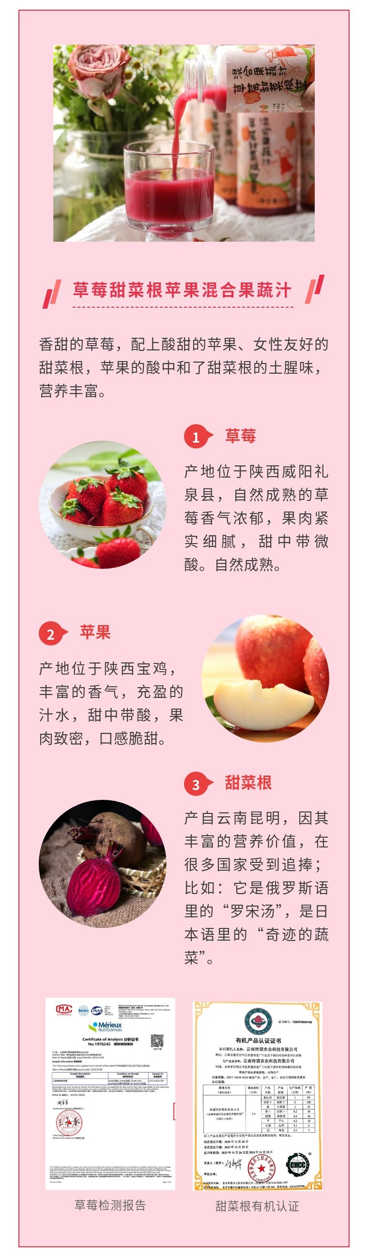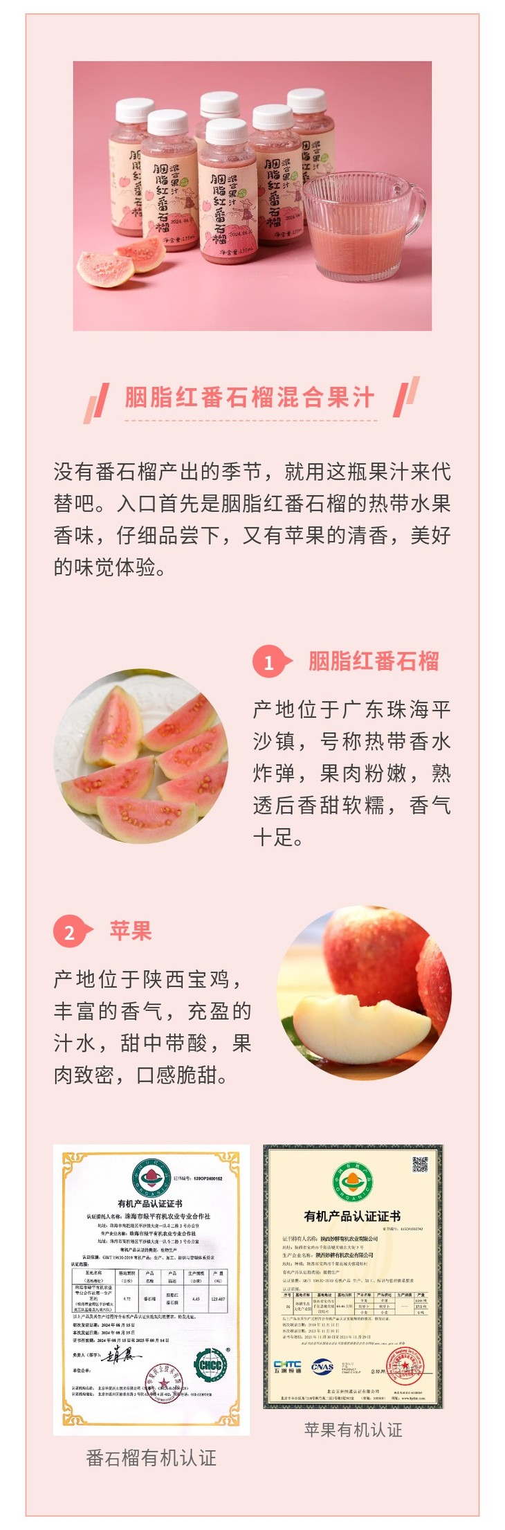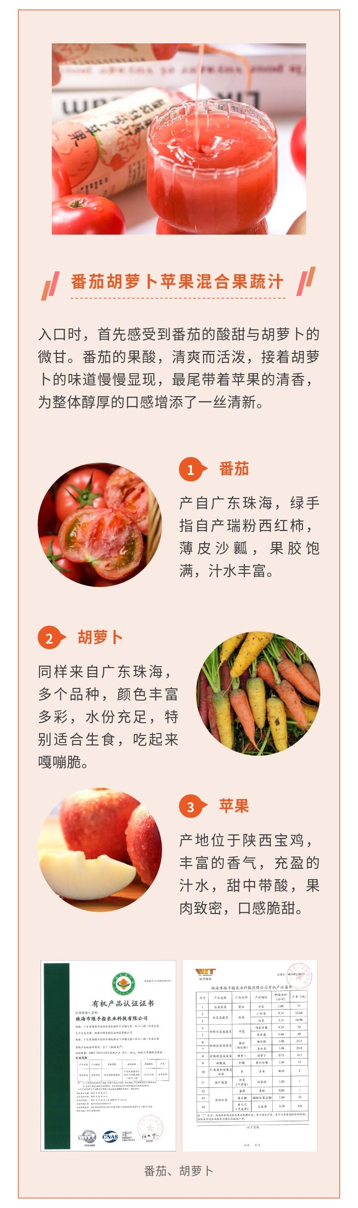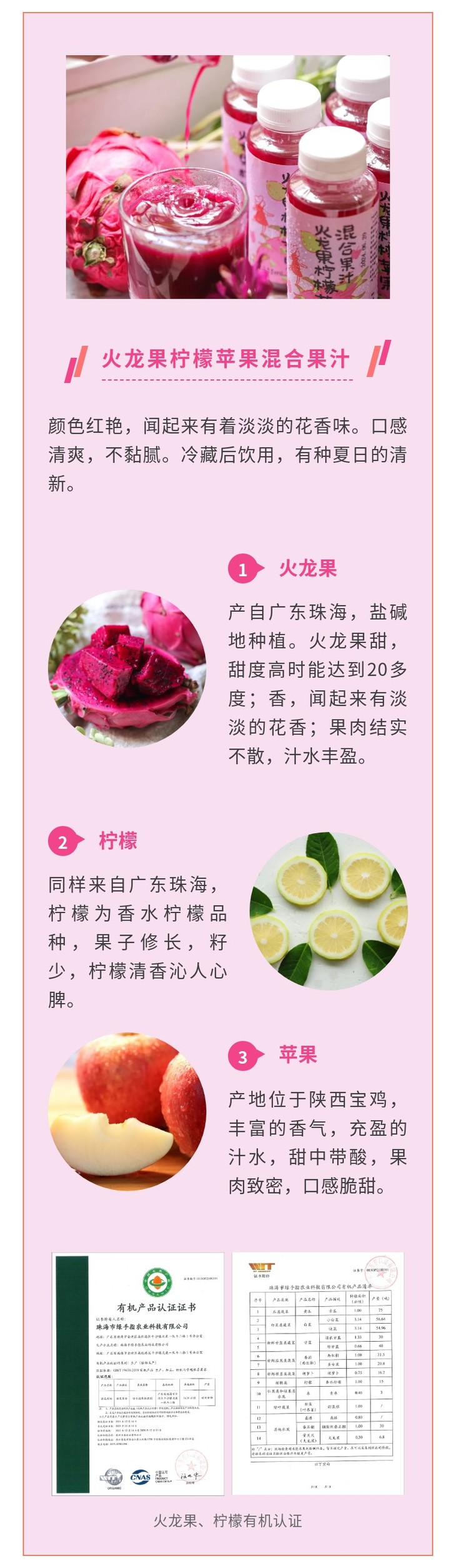 七款果汁选用的果蔬均为经过考察符合有机标准的基地生产,均为有机或生态种植。