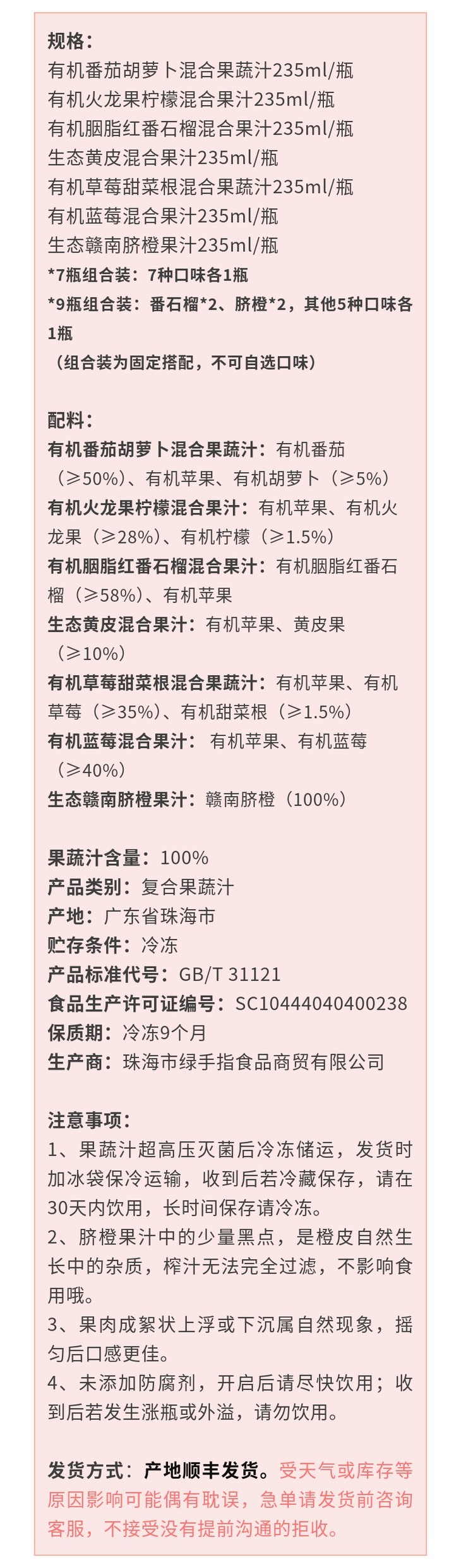 (鲜榨果蔬汁非浓缩还原+超高压灭菌)