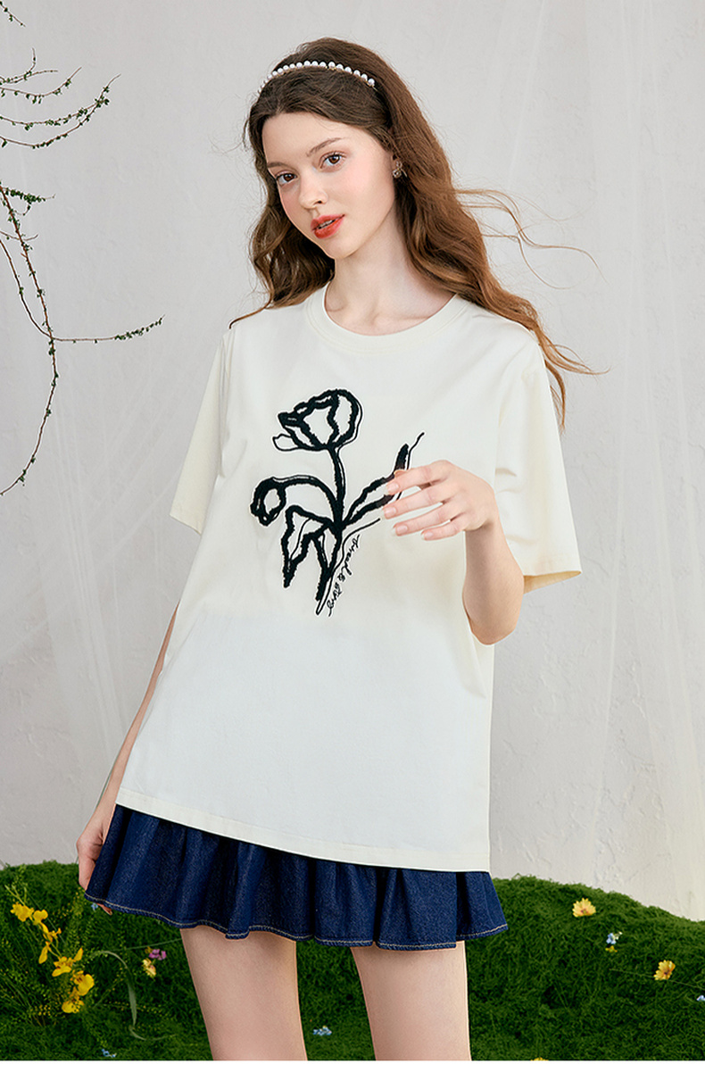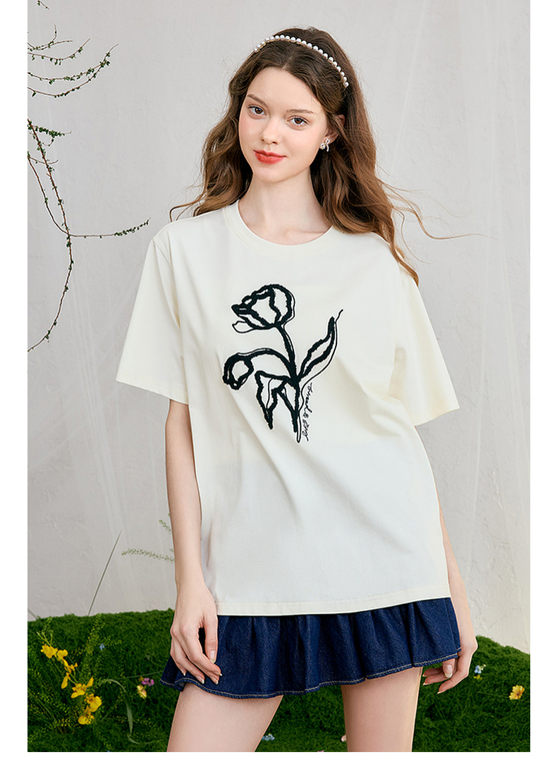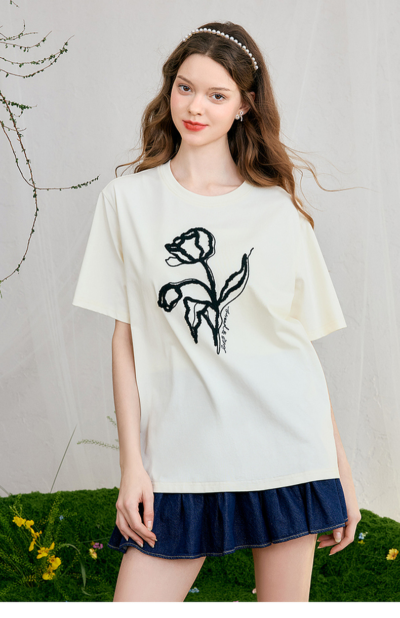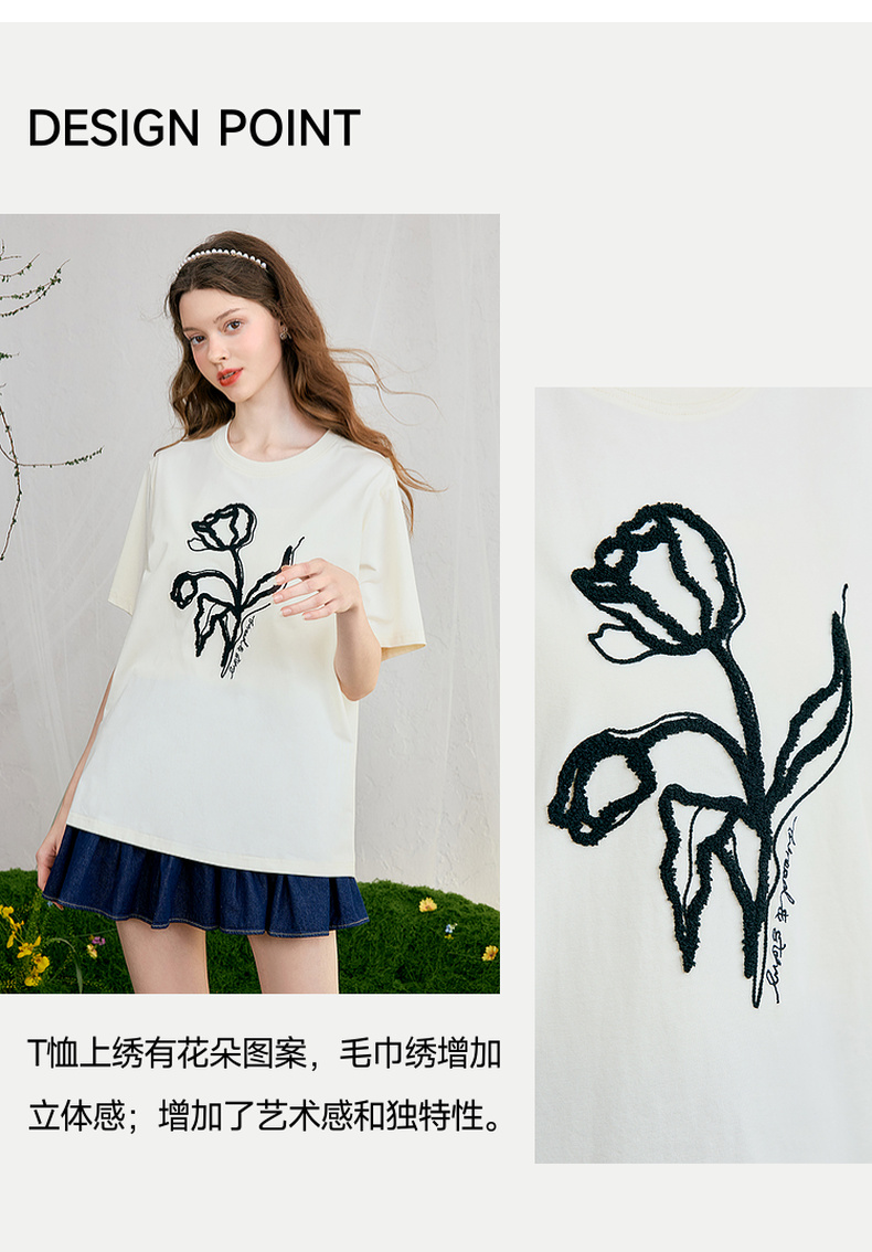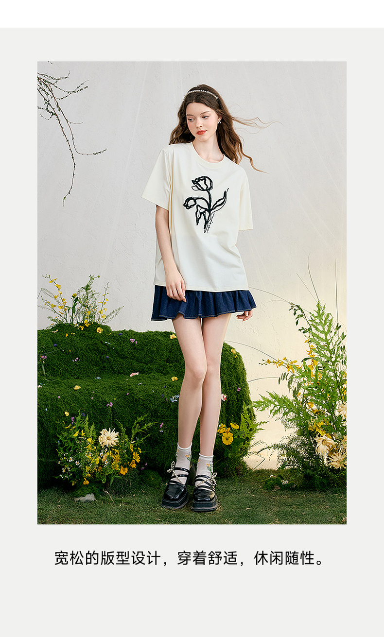 两三事 日光花房 2025春季新款休闲绣花棉质短袖t恤女宽松上衣