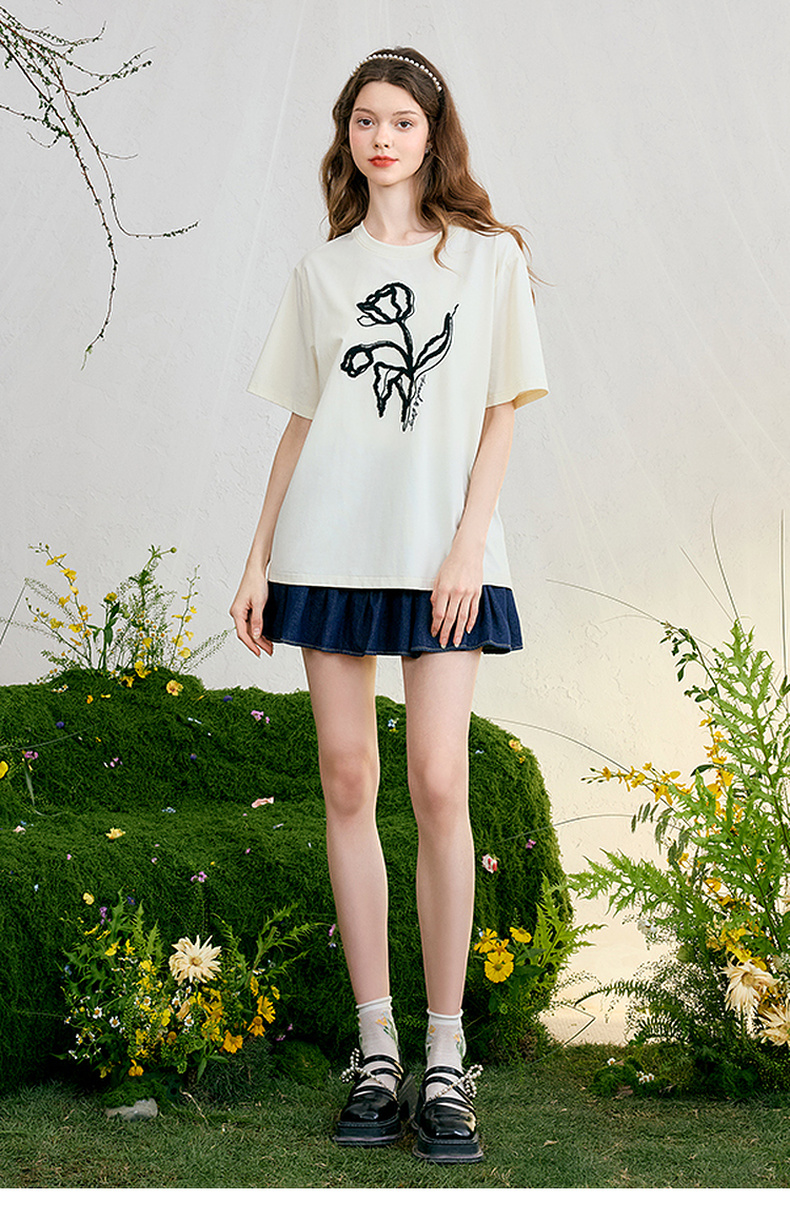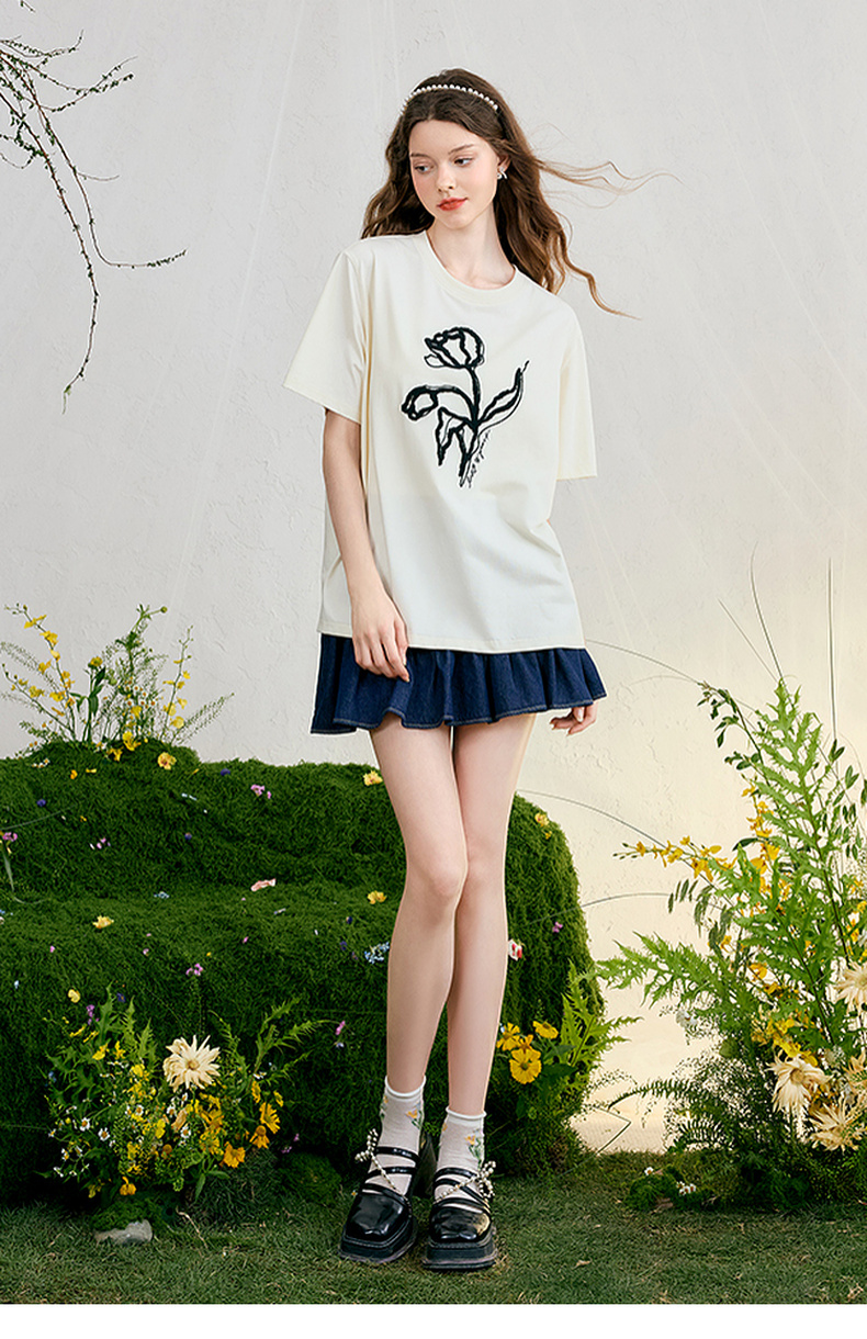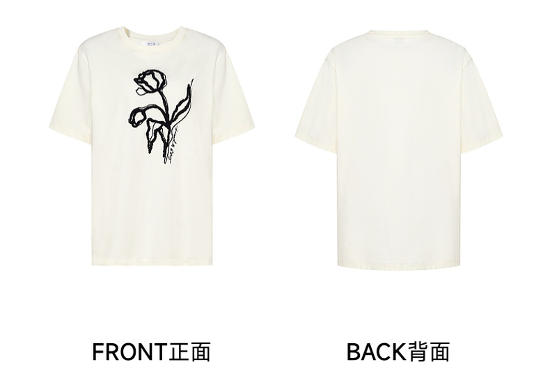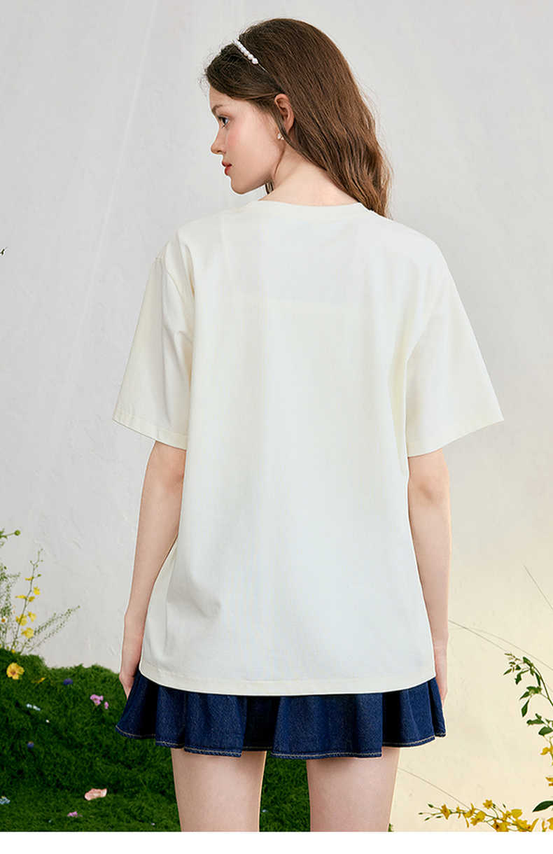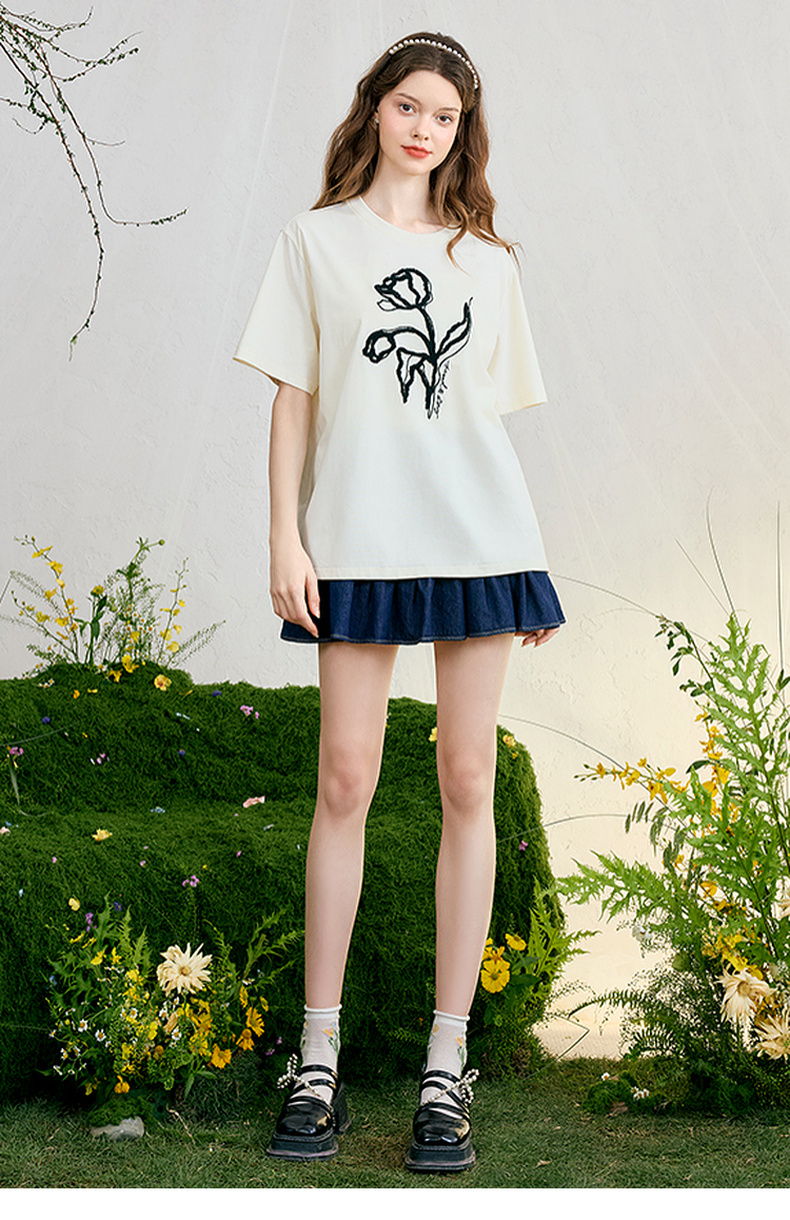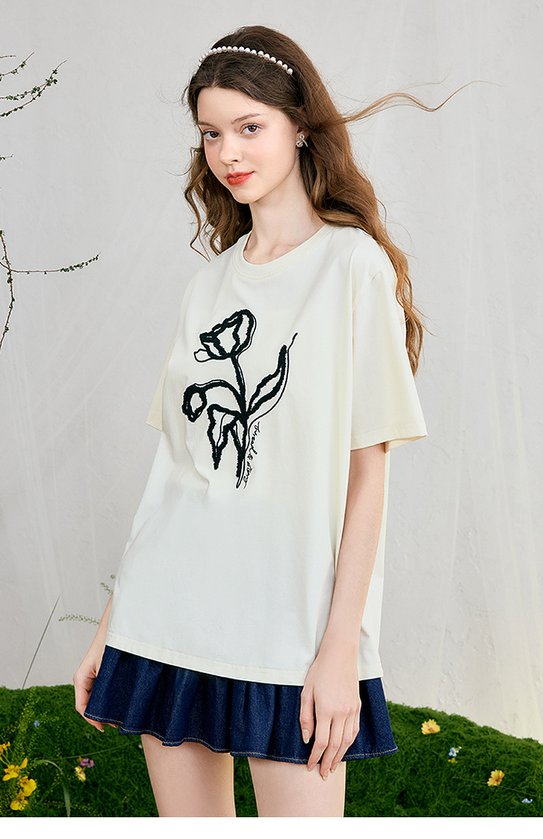 两三事 日光花房 2025春季新款休闲绣花棉质短袖t恤女宽松上衣