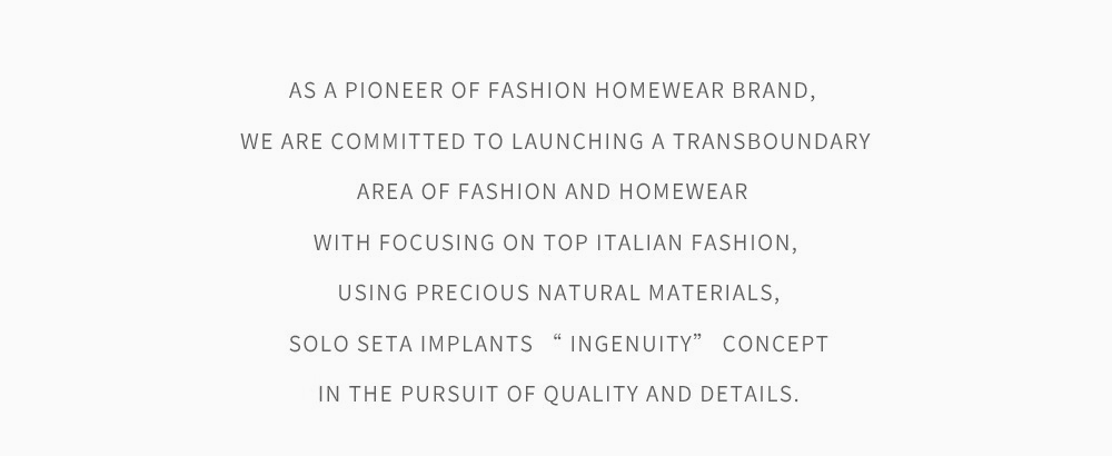 - soloseta专注于真丝织物,灵感源自意大利语,中文含义为“只做真丝”的意思。让睡衣变时尚,居家和外出瞬间切换,使其更具有出街,度假,参加宴会等功能。