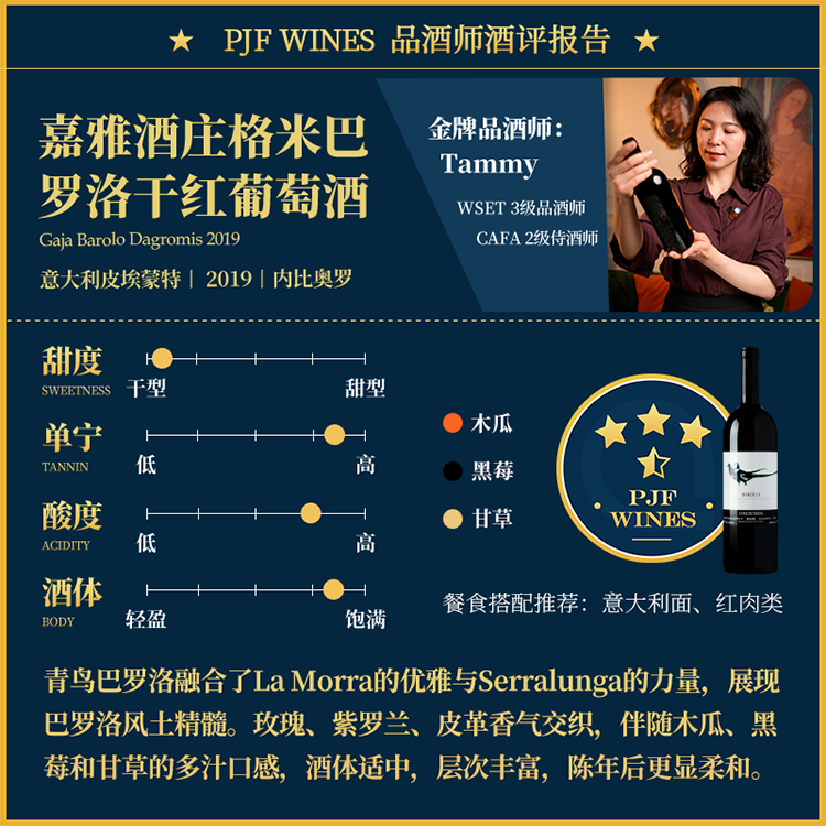 产品描述:是一款令人印象深刻的意大利巴罗洛红葡萄酒。酒中散发出迷人的红色水果香气,如樱桃和草莓,伴随着香料、皮革和雄厚的泥土气息。入口丰富饱满,口感柔顺而均衡,展现出优雅的果味和丝滑的单宁质地。酒体丰满而浓郁,余味悠长,回味无穷