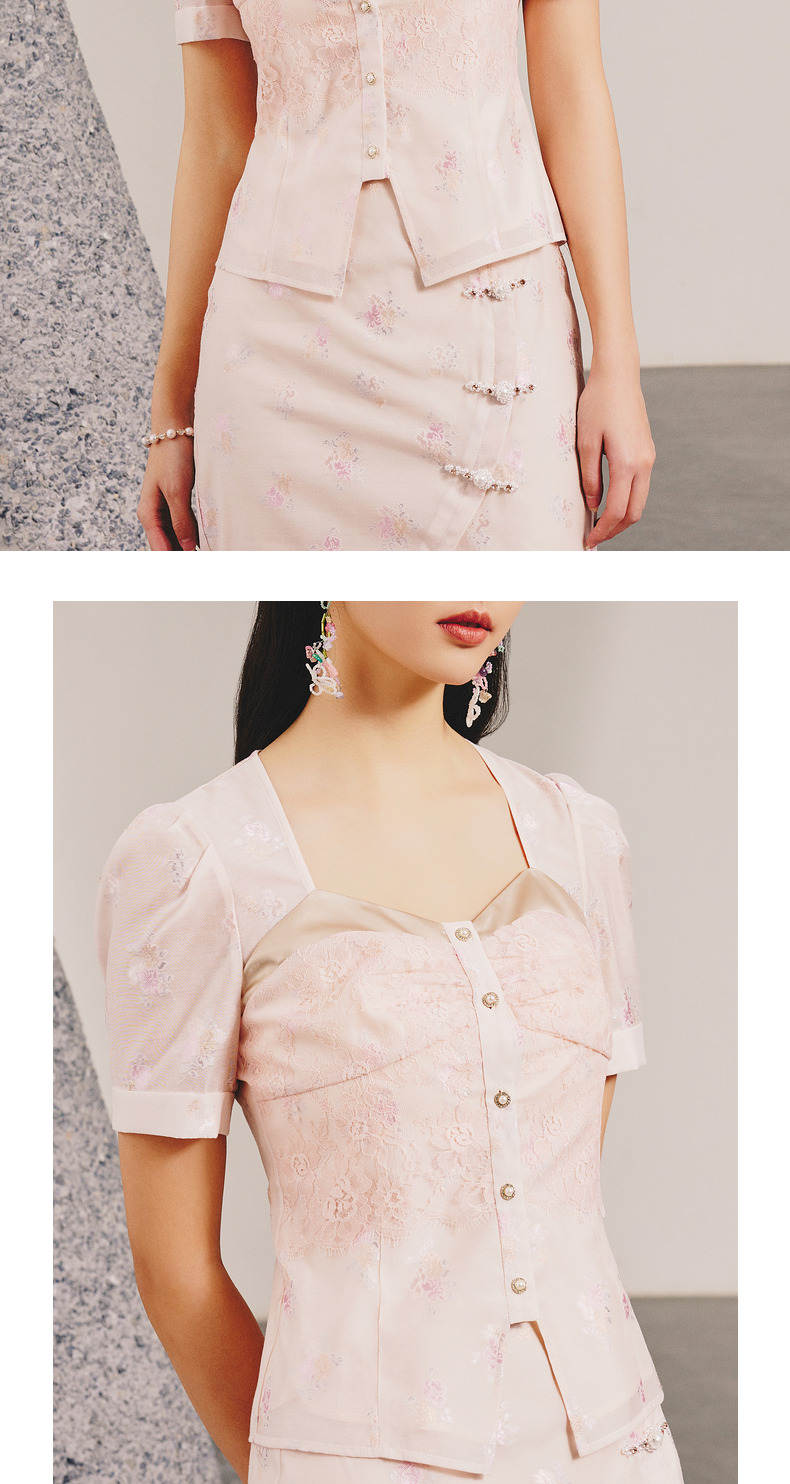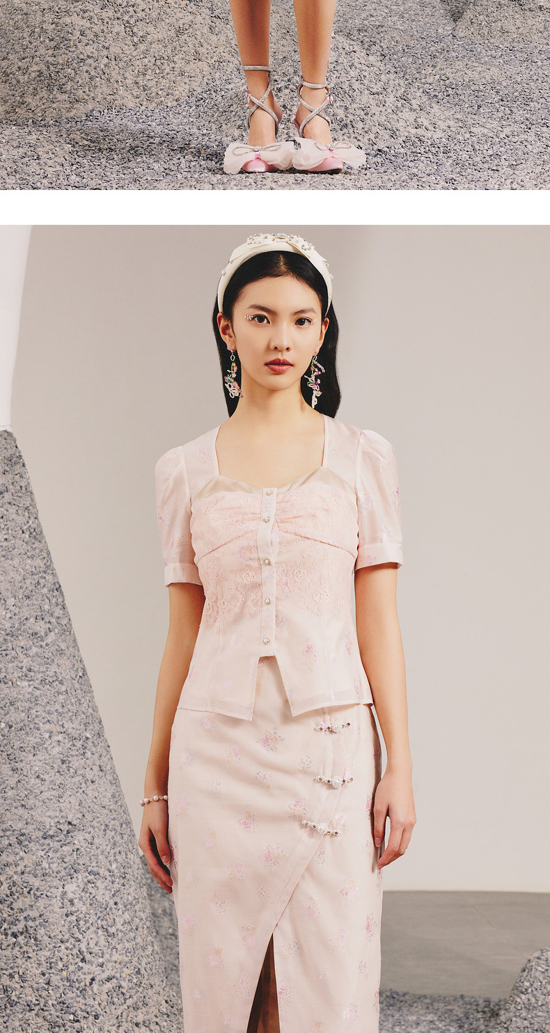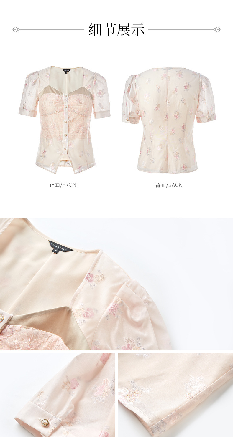 玛克门店发货:浪漫复古感粉色提花收腰上衣春(货号:MC88TP088)