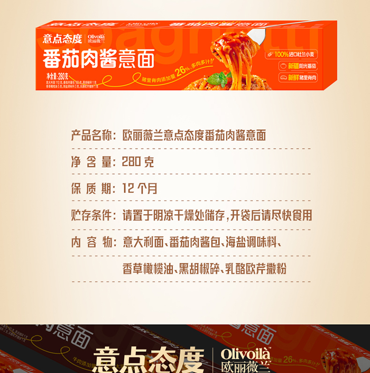 欧丽薇兰意点态度番茄肉酱意面280g*1盒/3盒/5盒