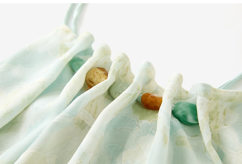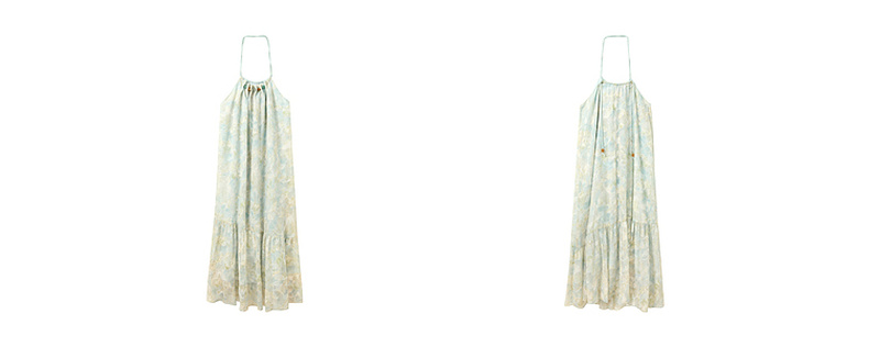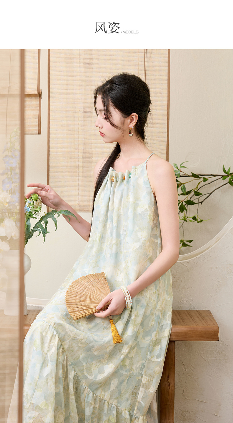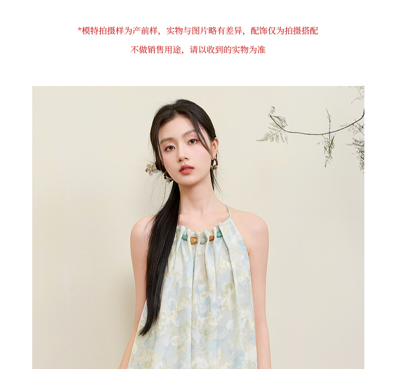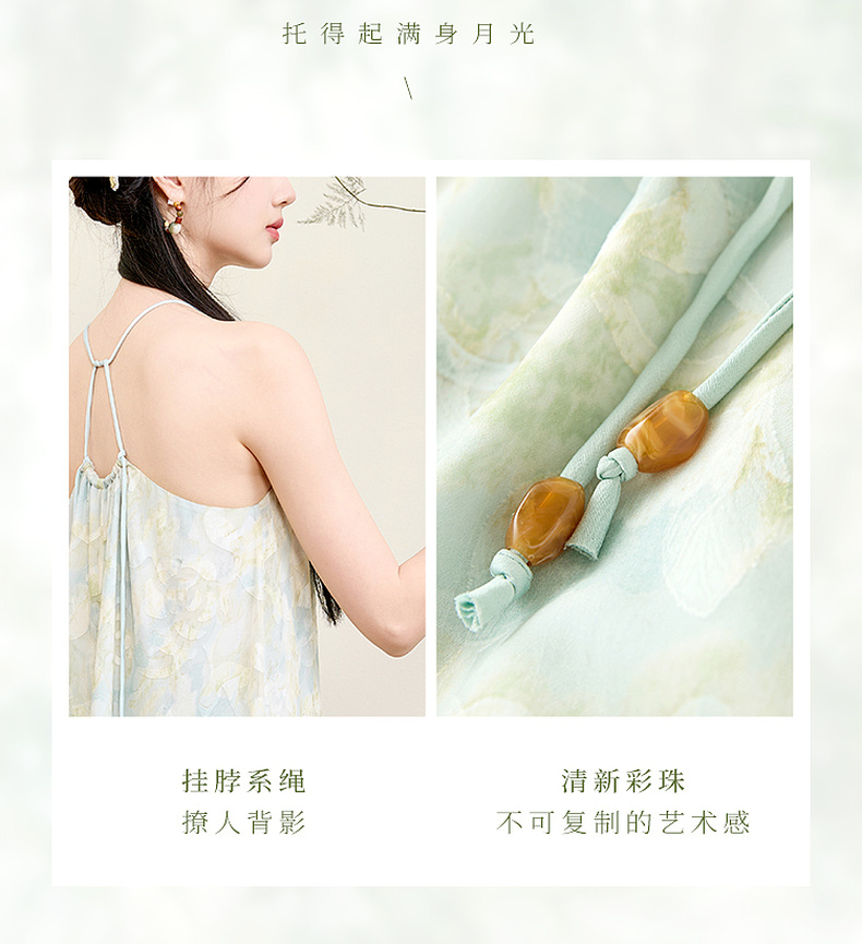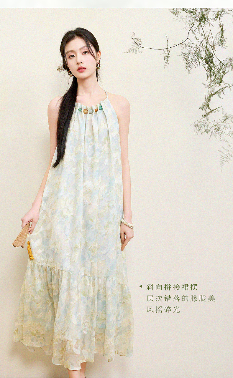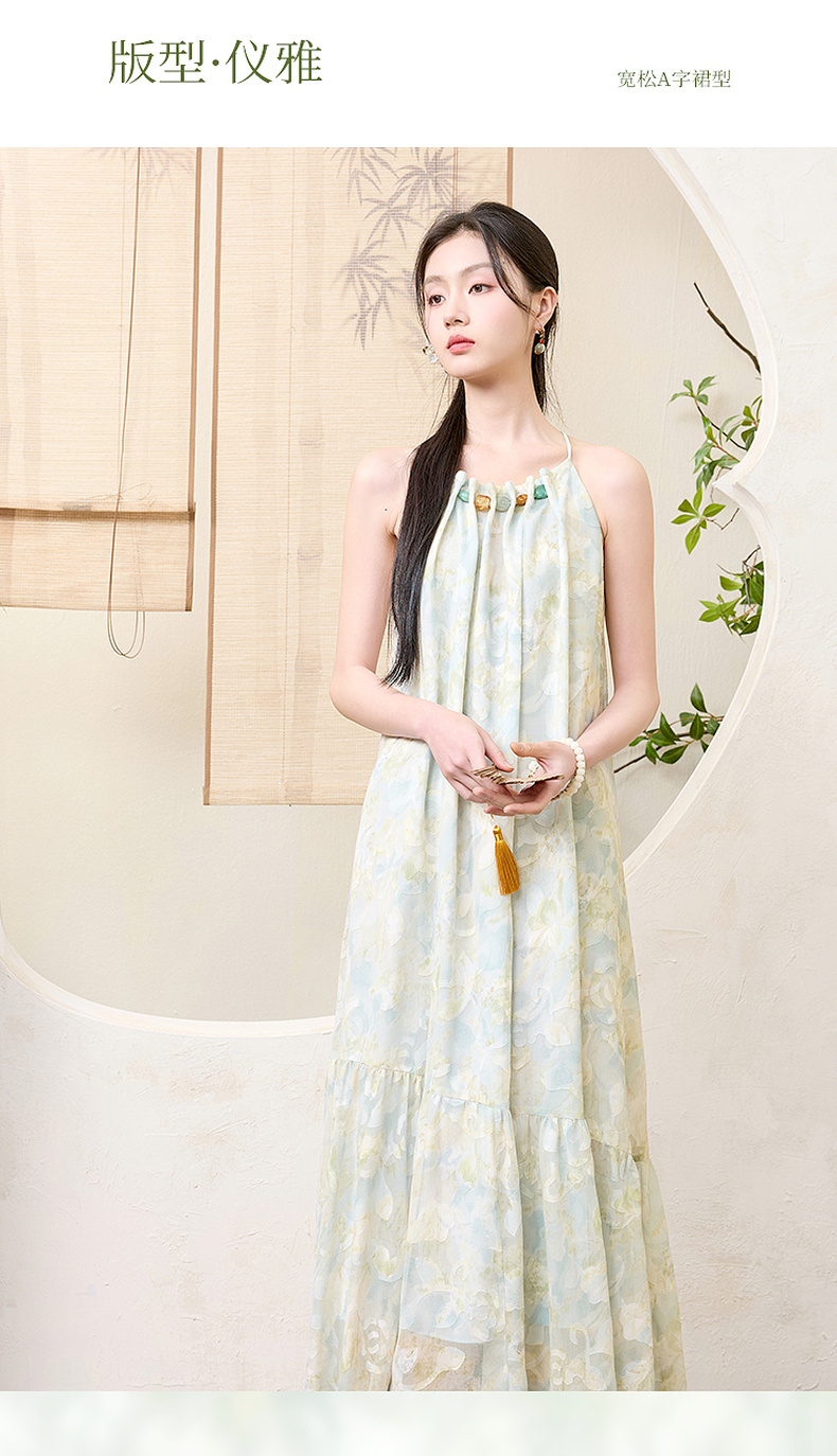 三彩【白茶疏影】2025夏季新款新中式剪花挂脖连衣裙长裙宽松C