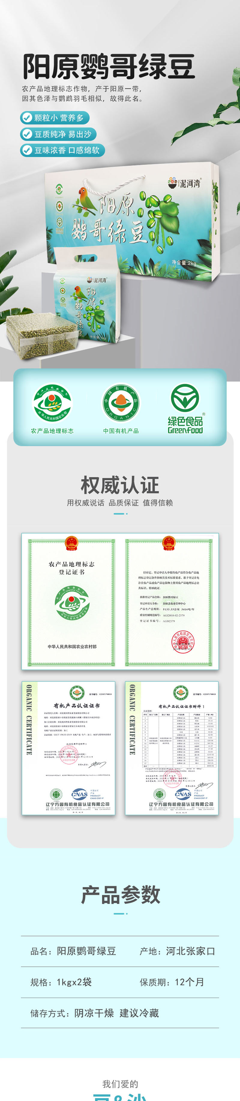 泥河湾 张家口阳原县鹦哥绿豆 2千克x1提 五谷杂粮
