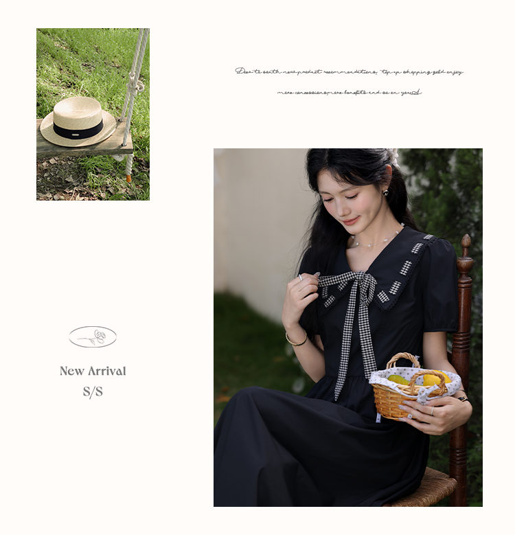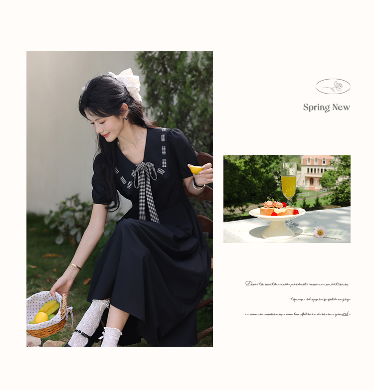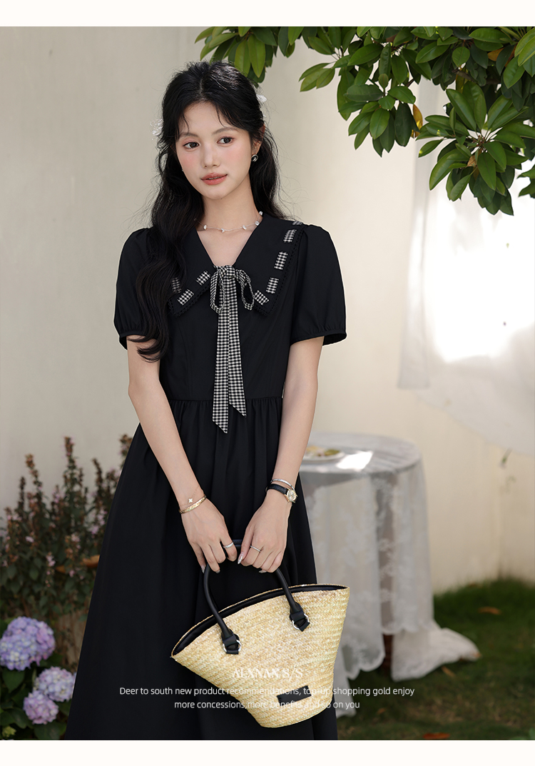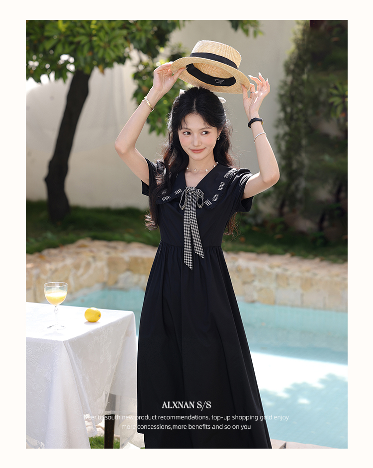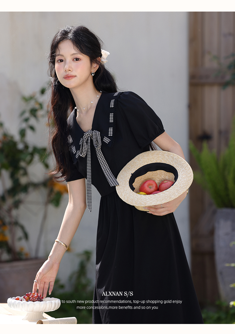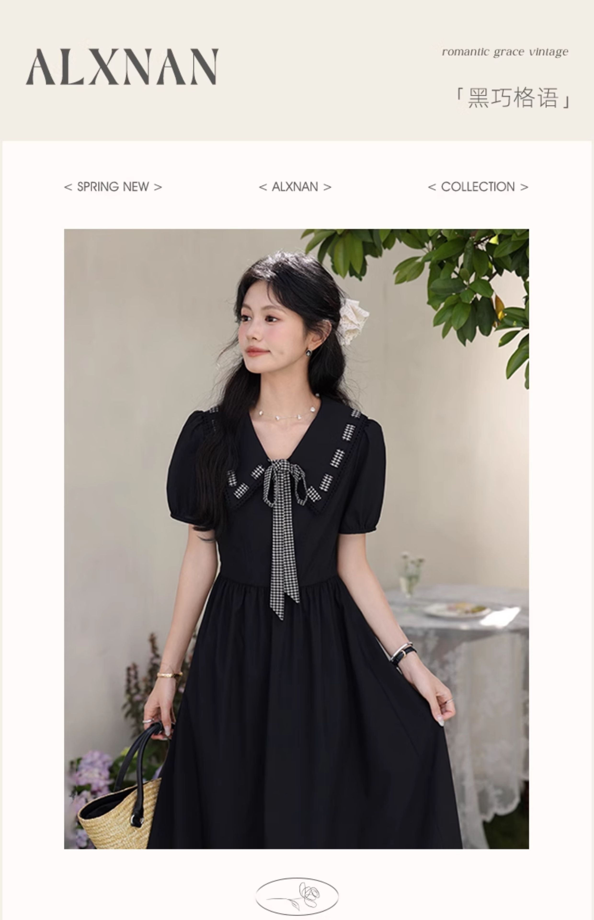【65折秒杀】鹿向南「黑巧格语」黑色复古连衣裙女夏季新款法式优雅气质长裙子L55706