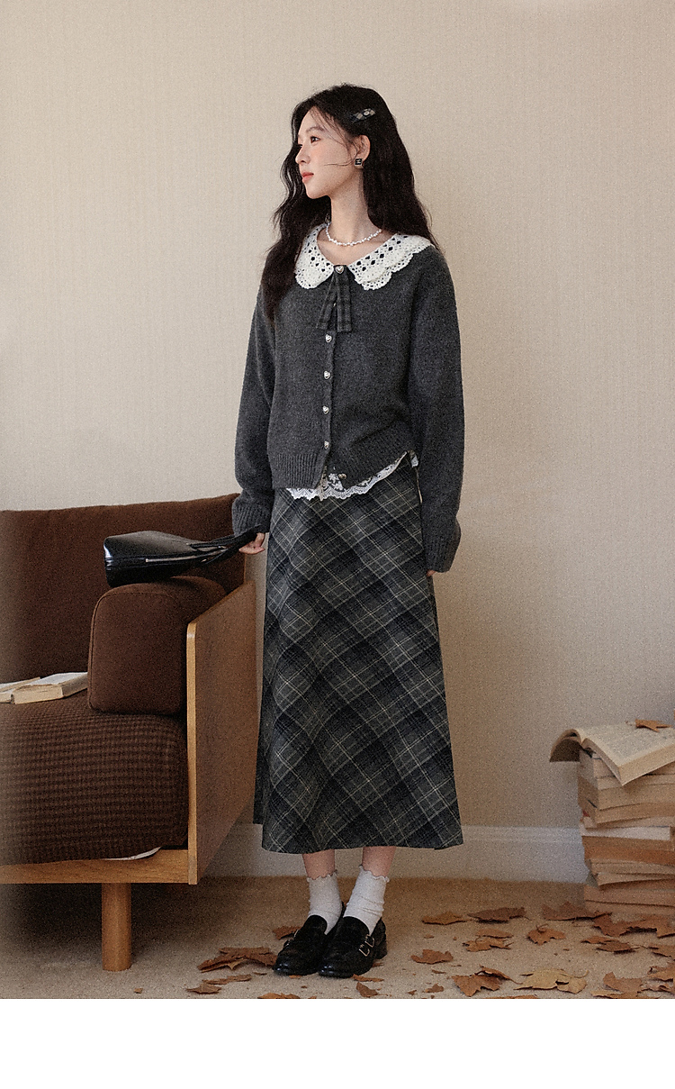 鹿向南「书声入耳」花灰色娃娃领钩花蝴蝶结毛衣开衫上衣裙子套装